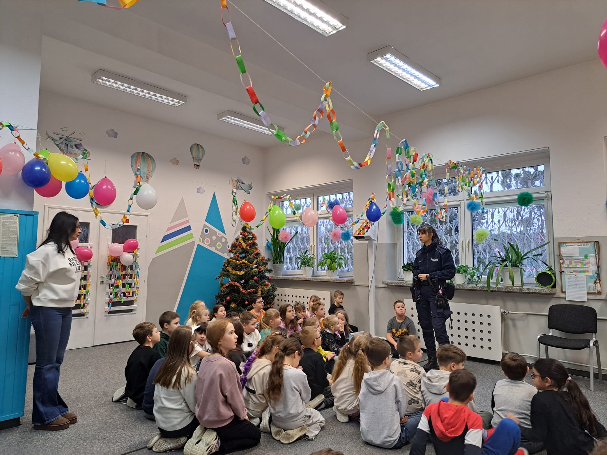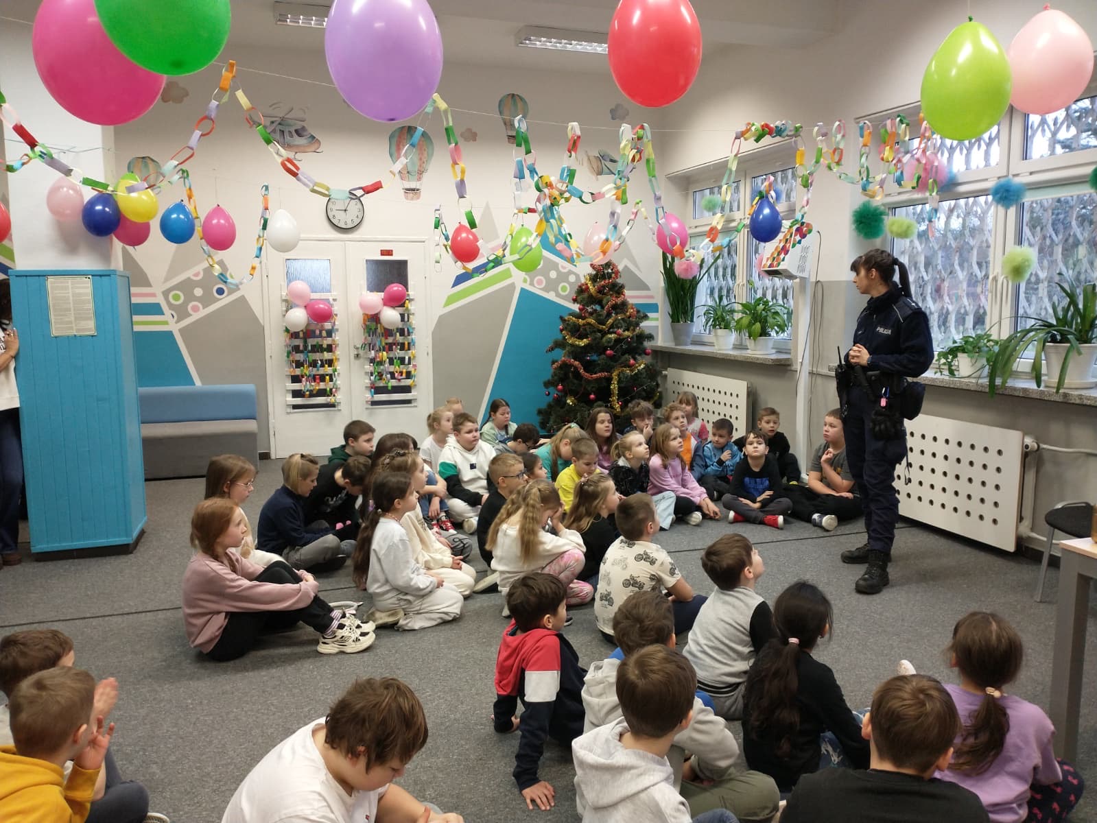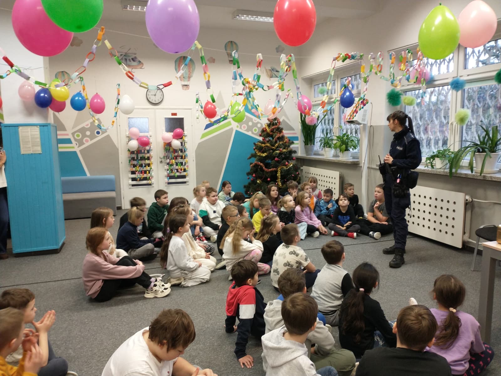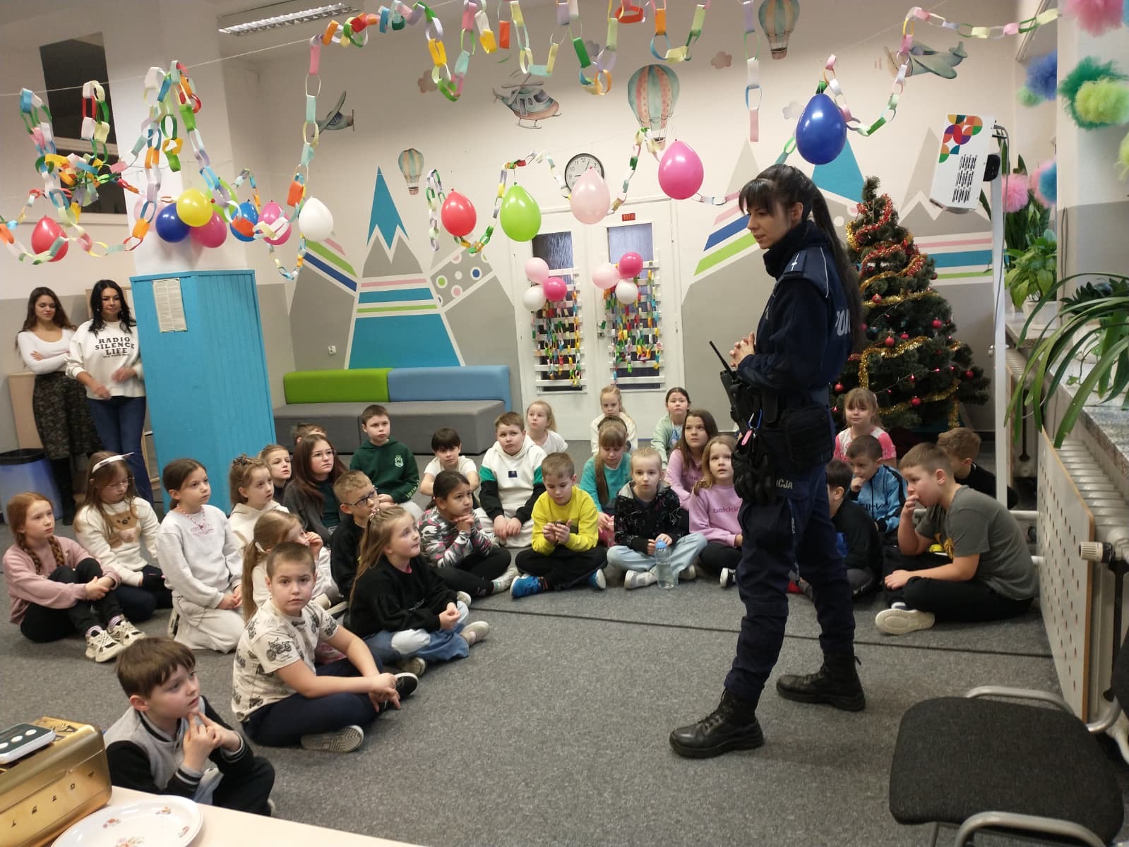 Pani policjantka omówiła zagrożenia, jakie mogą wystąpić podczas zabaw na śniegu i lodzie, poruszania się po drogach oraz kontaktów z nieznajomymi w świecie realnym jak i internetowym. Zwróciła uwagę na konieczność noszenia elementów odblaskowych oraz odpowiedzialne zachowanie w czasie wolnym od zajęć szkolnych. Uczniowie aktywnie uczestniczyli w spotkaniu, chętnie zadawali pytania i dzielili się swoimi doświadczeniami.