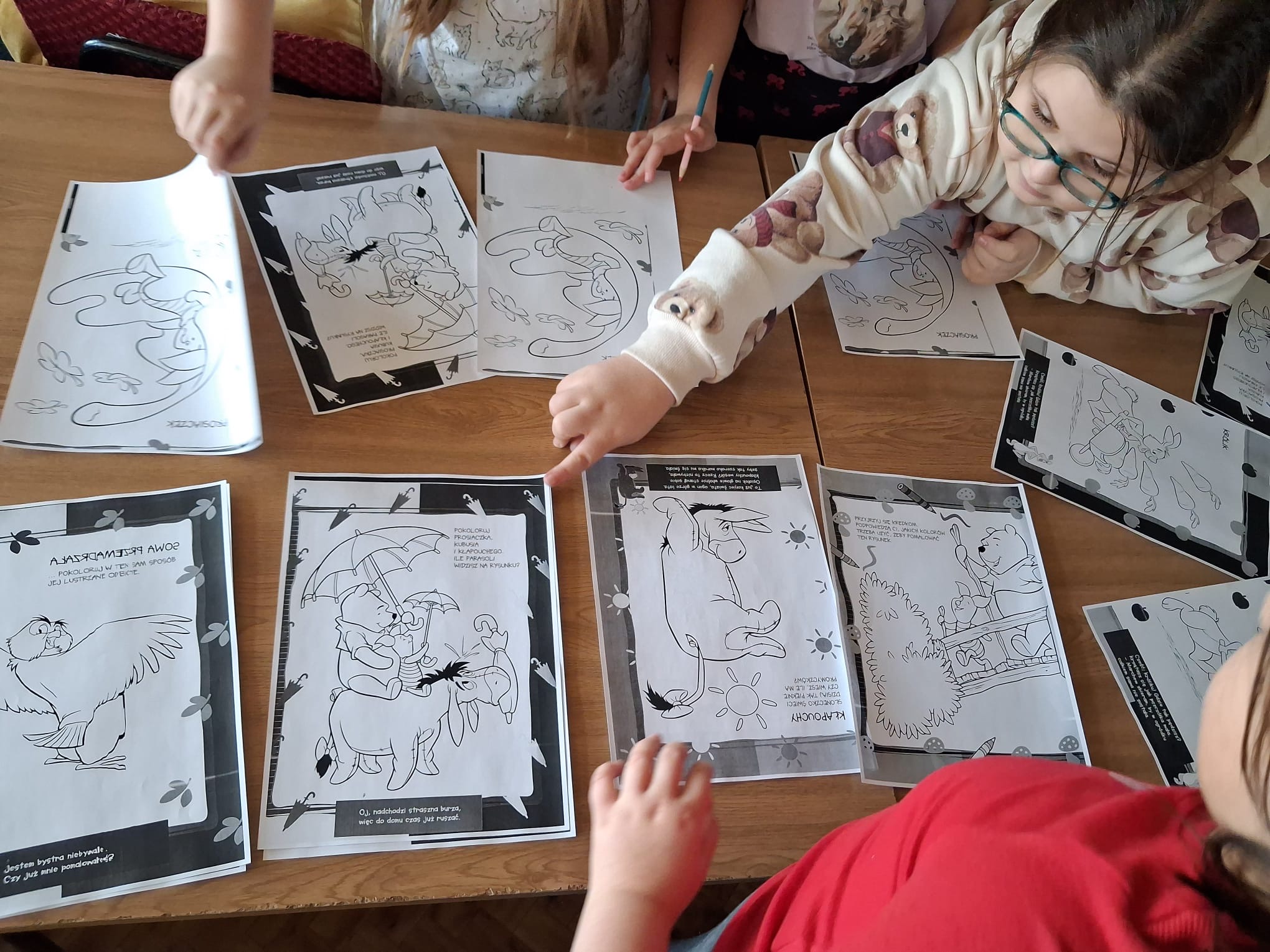 Na zakończenie spotkania dzieci z radością kolorowały ilustracje przedstawiające Kubusia Puchatka i jego przyjaciół. Powstały piękne, barwne prace, które pokazały, jak bardzo ten bohater jest bliski dziecięcym sercom.