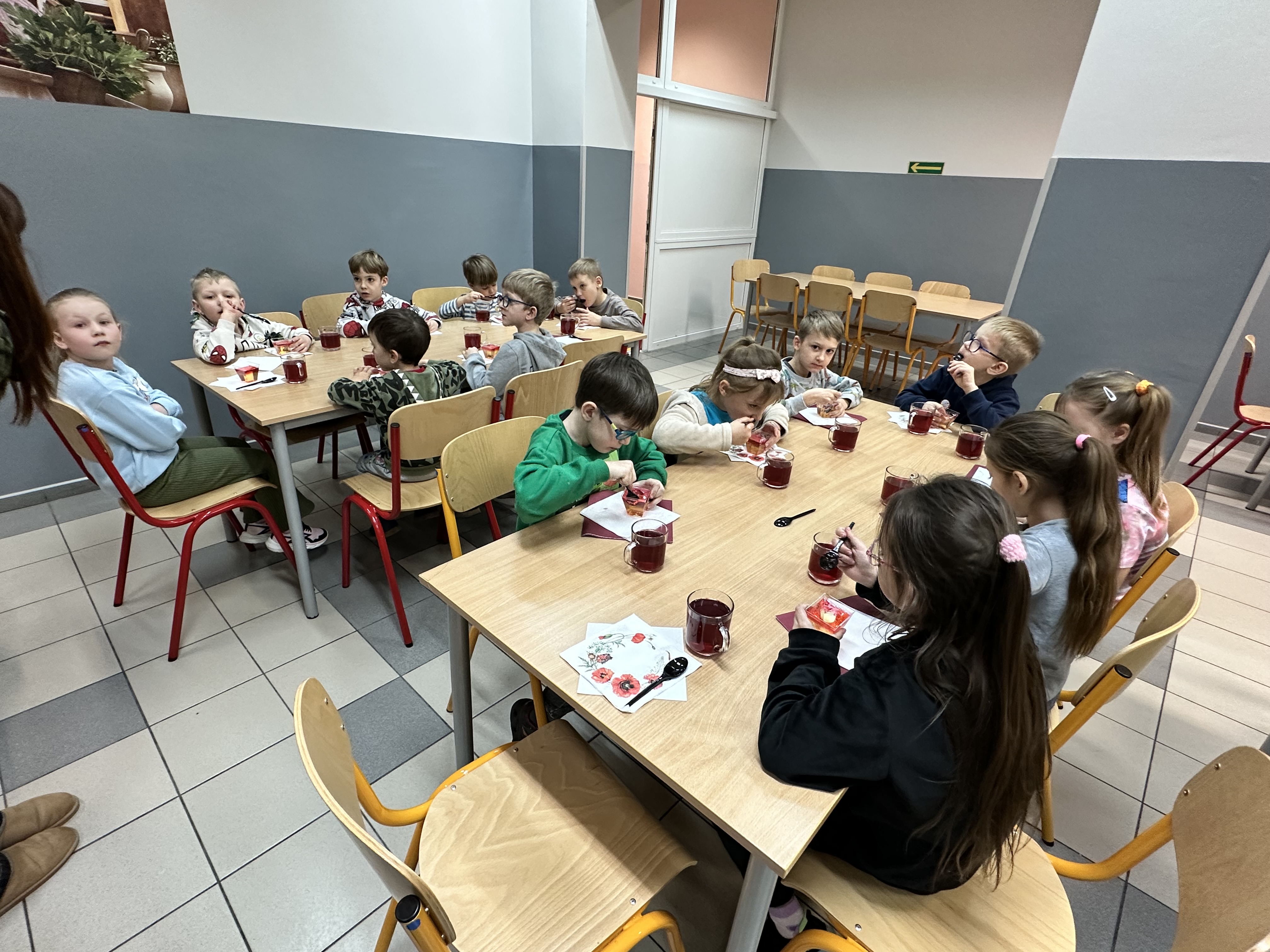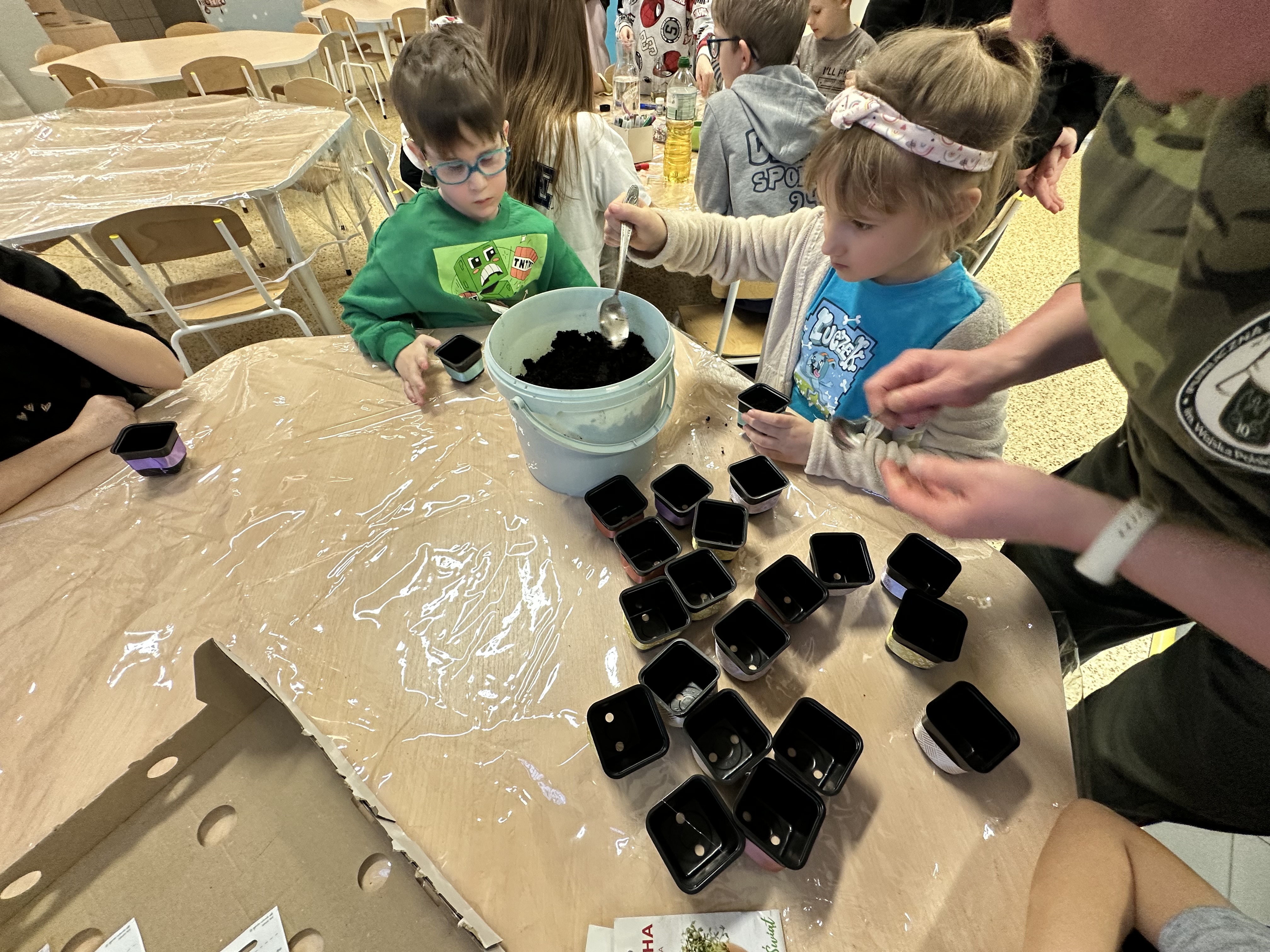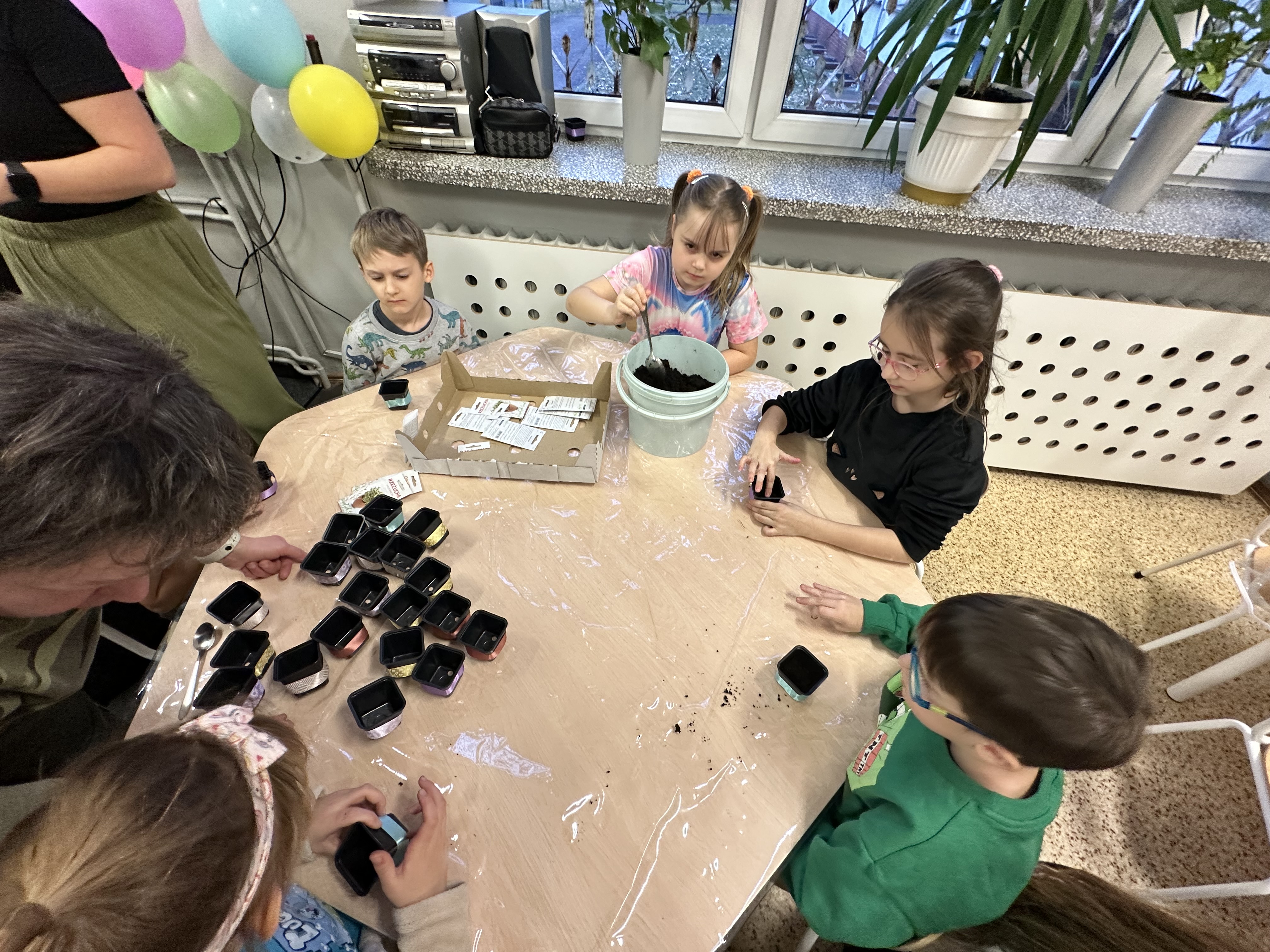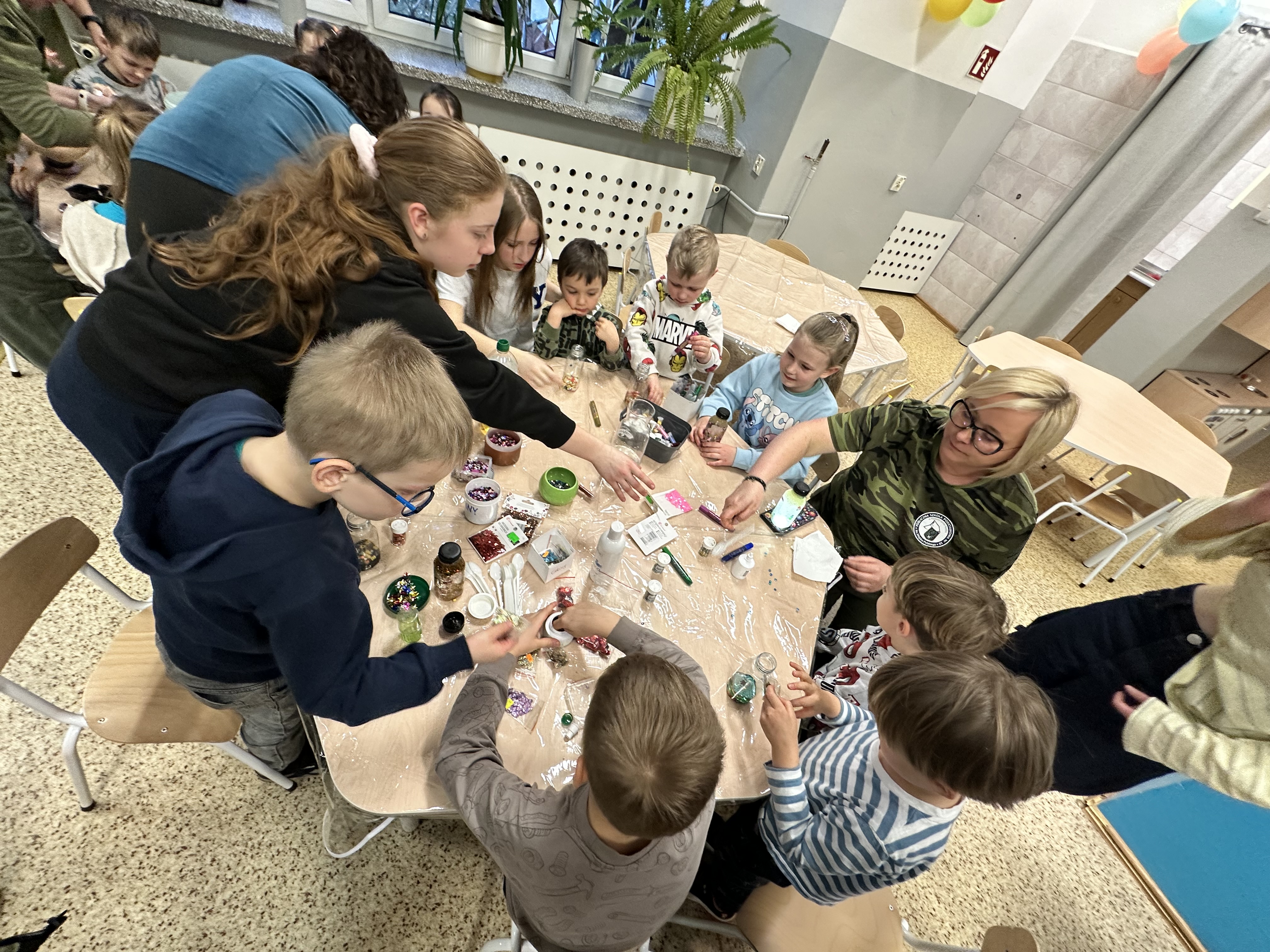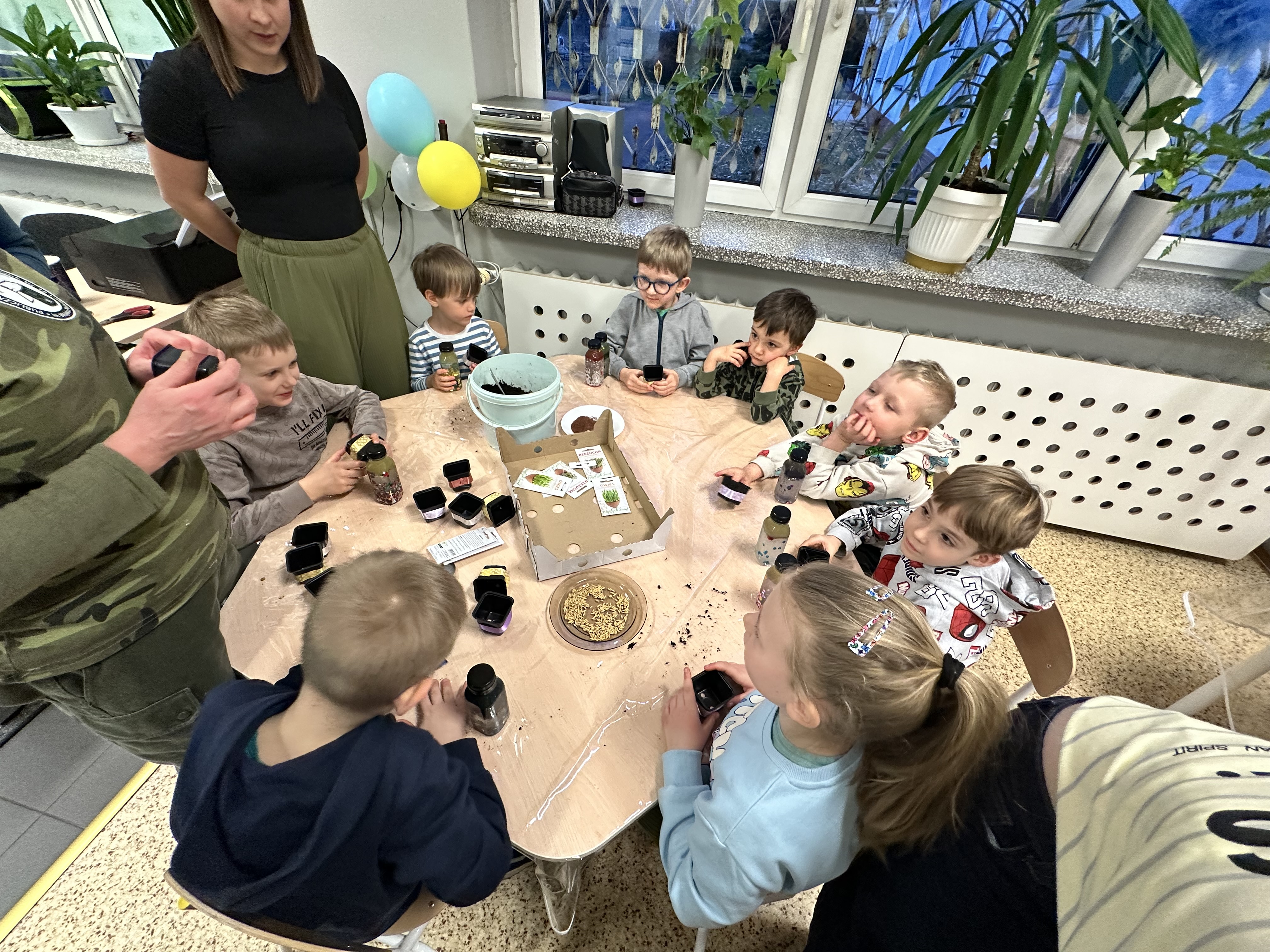 Dla najmłodszych przygotowaliśmy wiele ciekawych atrakcji i zajęć. Dzieci brały udział w różnorodnych aktywnościach, które pozwoliły im poczuć atmosferę szkolnej przygody i przekonać się, że nauka może być naprawdę fascynująca. Były wspólne tańce z dziewczynkami z klasy 4 i 8, ozdabianie szklanych buteleczek, wysiewanie rzeżuchy i owsa oraz zabawy na dywanie interaktywnym. Po wspólnych zajęciach przyszedł czas na słodki poczęstunek.