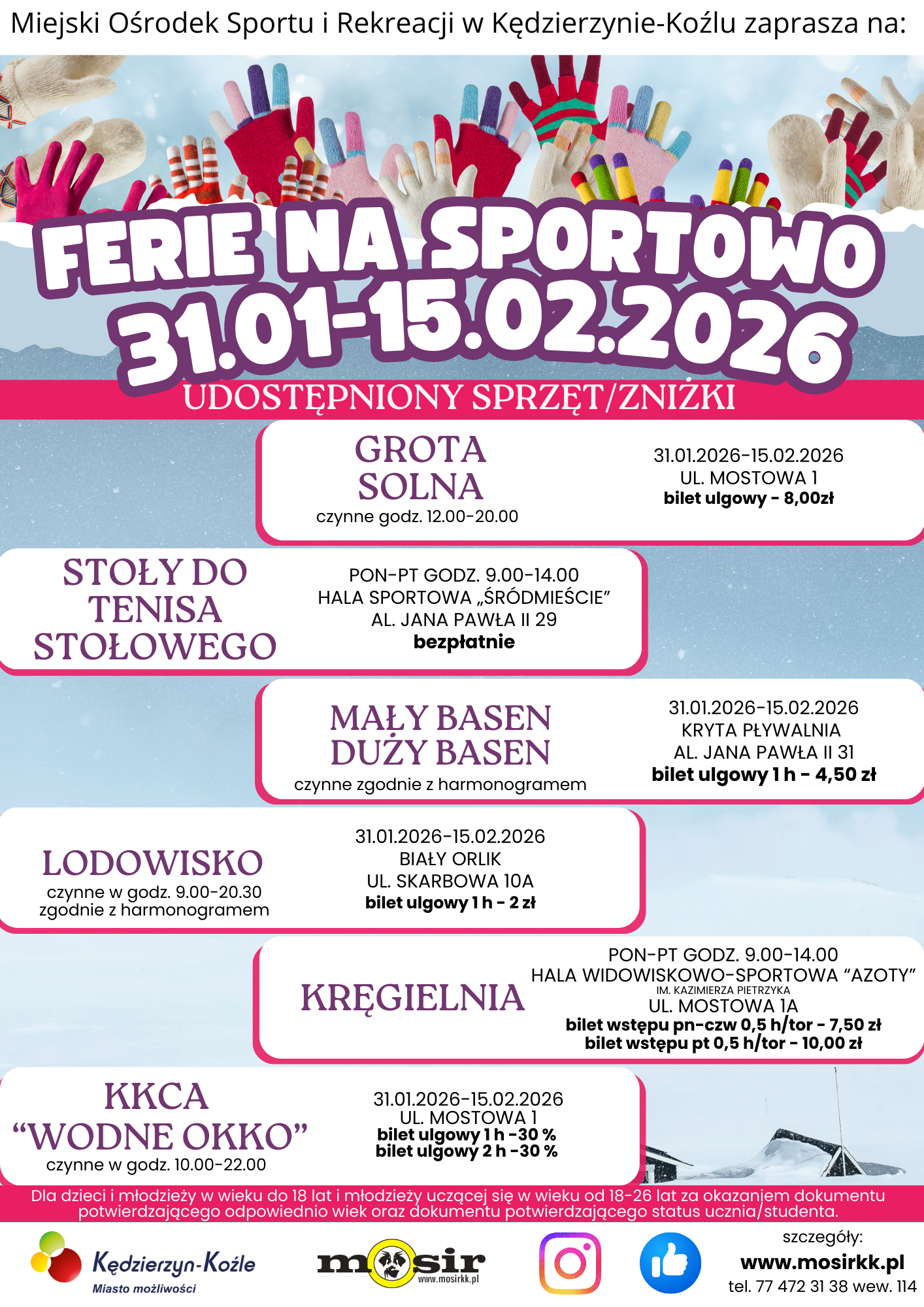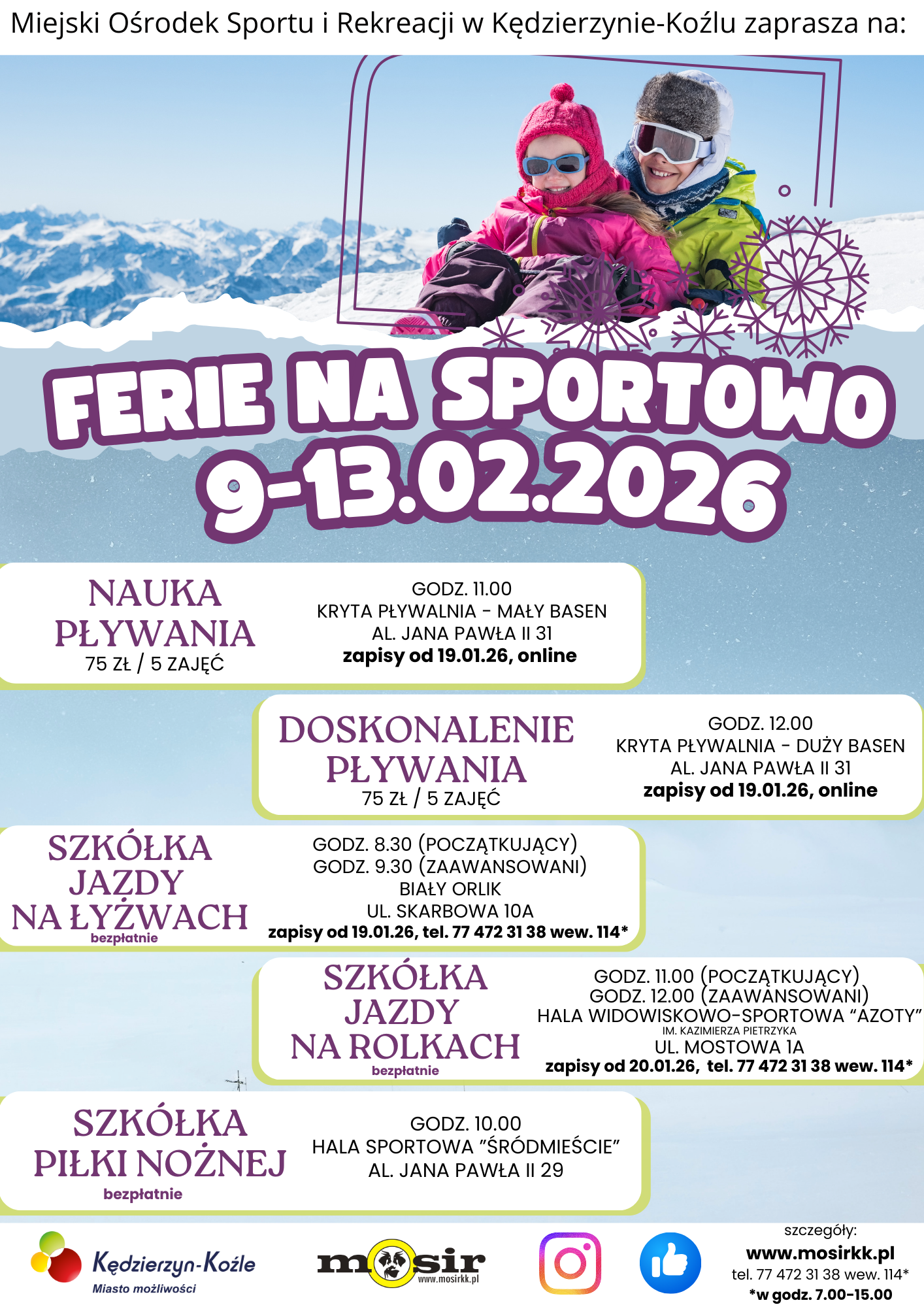 Przekazujemy propozycję zajęć zorganizowanych oraz zniżek w ramach akcji „Ferie na sportowo 2026”, przygotowanej przez Miejski Ośrodek Sportu i Rekreacji w Kędzierzynie-Koźlu. Oferta skierowana jest do dzieci i młodzieży szkół podstawowych.