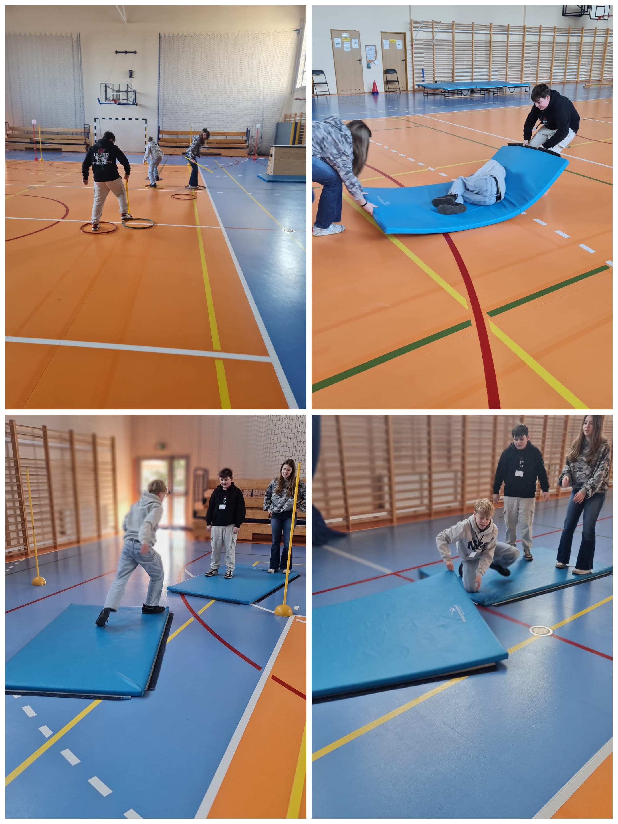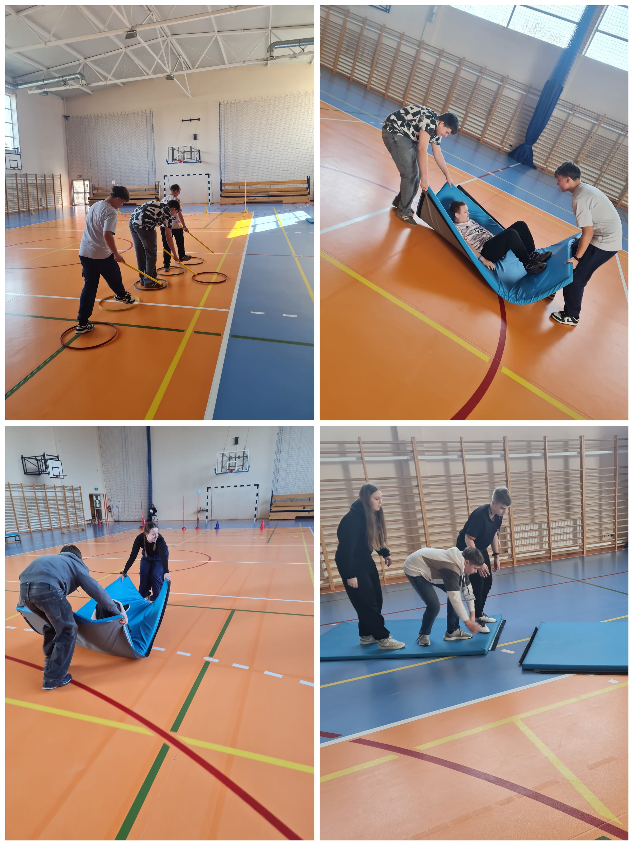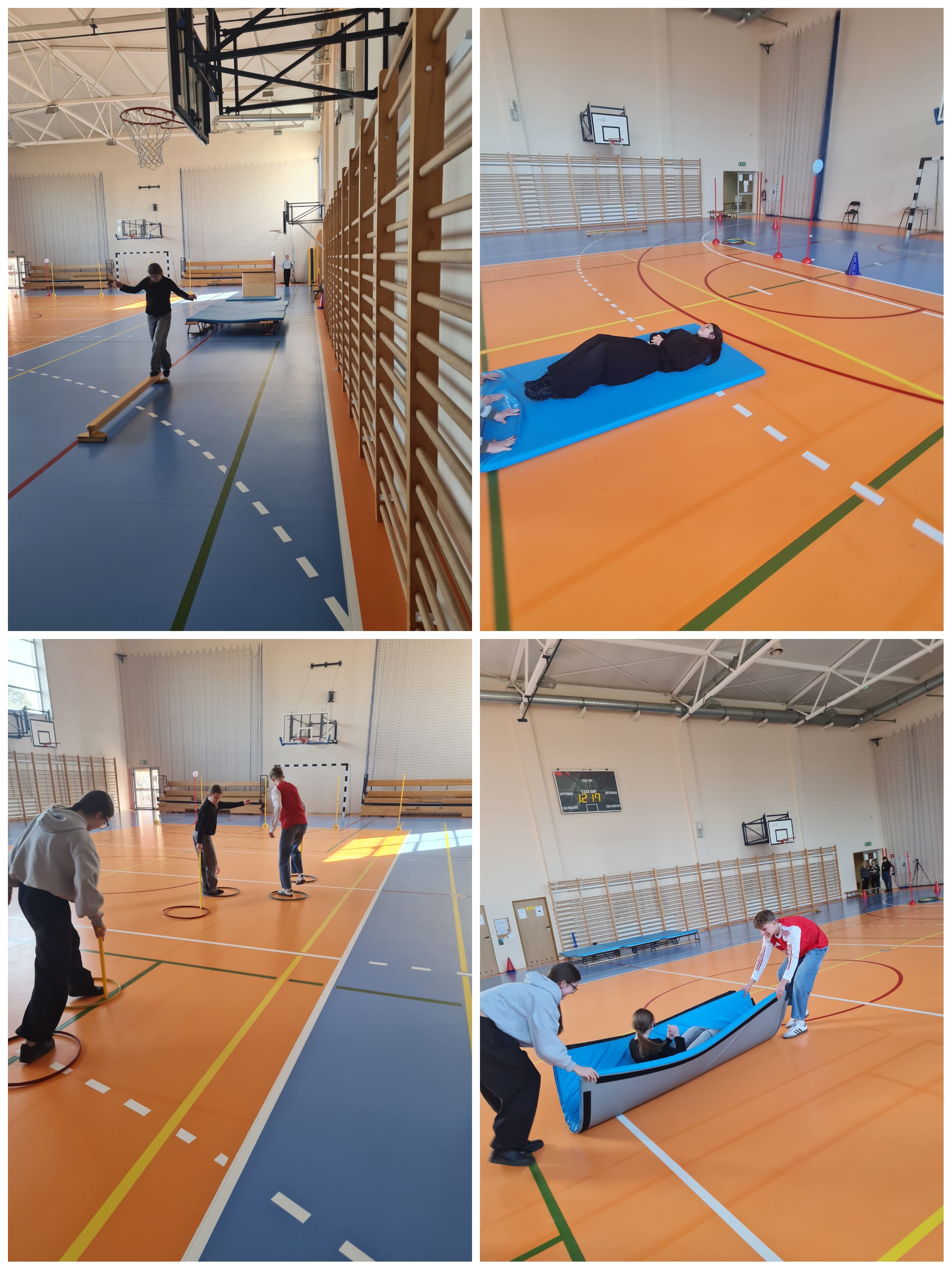 Kolejnym punktem zmagań była szkoła, gdzie na sali gimnastycznej drużyny realizowały zadania o charakterze sprawnościowym w ramach „Misji ratunkowej”. Konkurencje te wymagały od uczestników dobrej współpracy, zaangażowania, sprytu oraz umiejętności sprawnej organizacji działań w zespole.