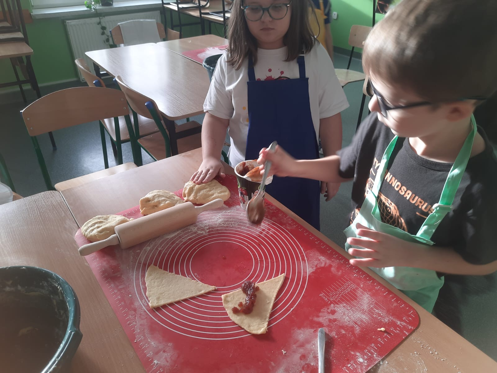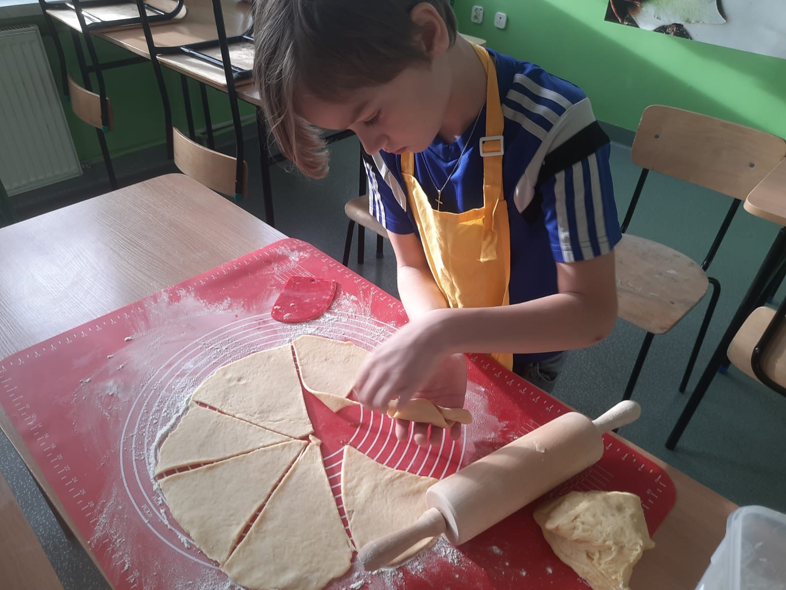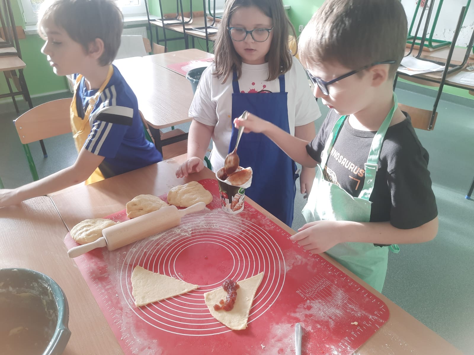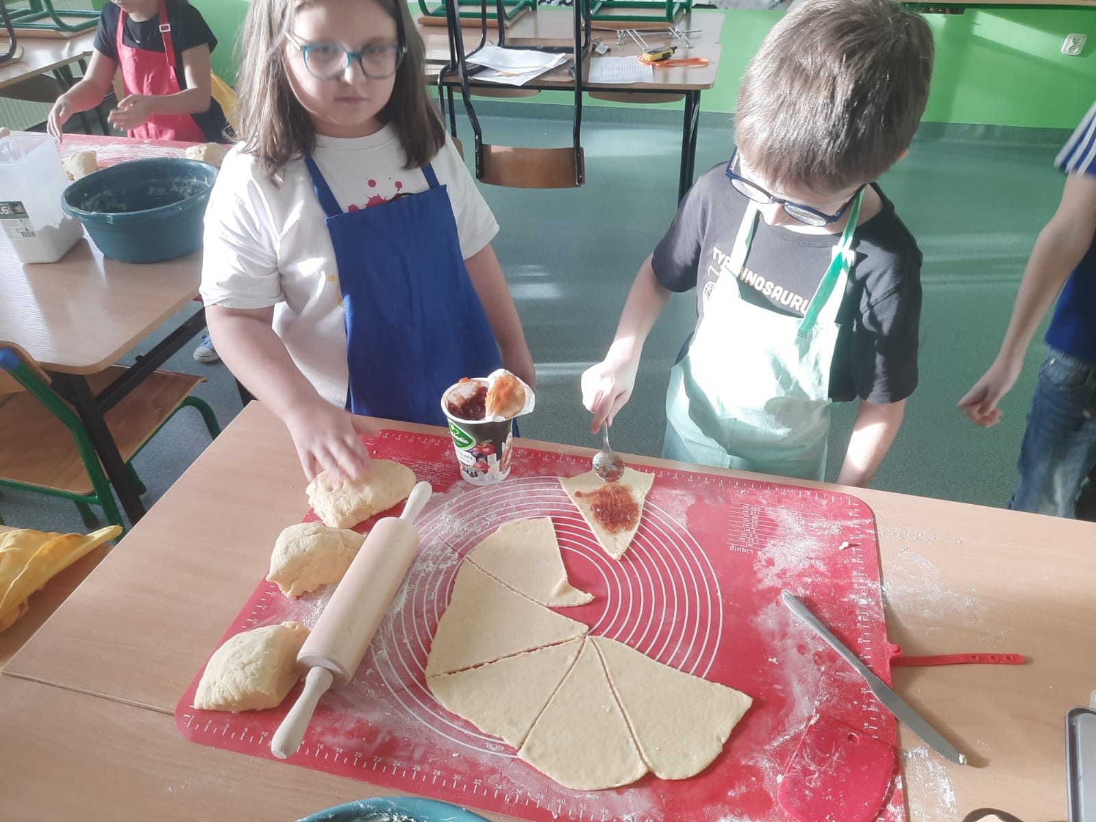 W piątek odbyły się już trzecie zajęcia kulinarne w świetlicy szkolnej, prowadzone przez panią Dobrosławę Tokarską. Tym razem dzieci z klasy 2 miały okazję spróbować swoich sił w przygotowywaniu rogalików drożdżowych z marmoladą.