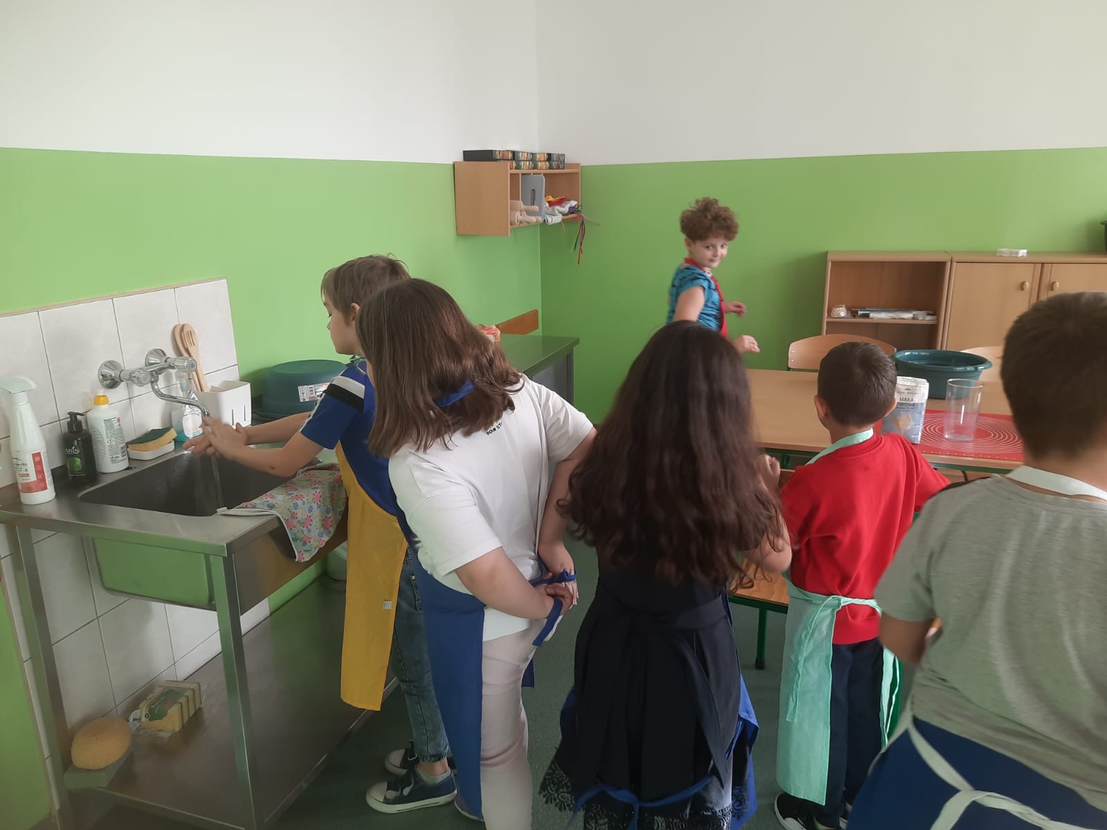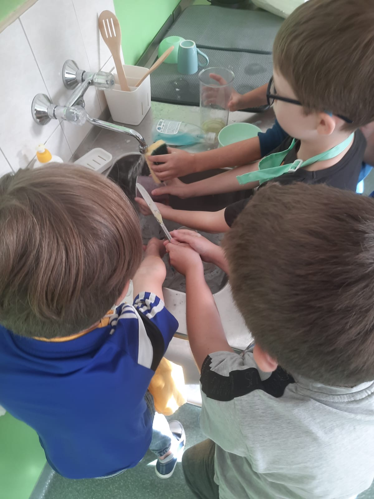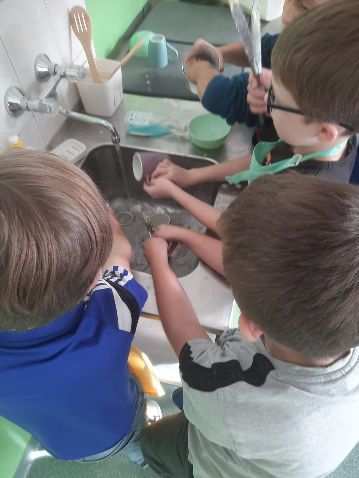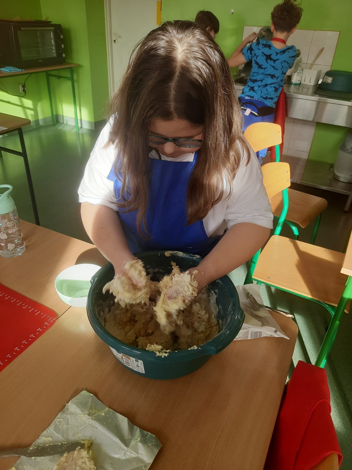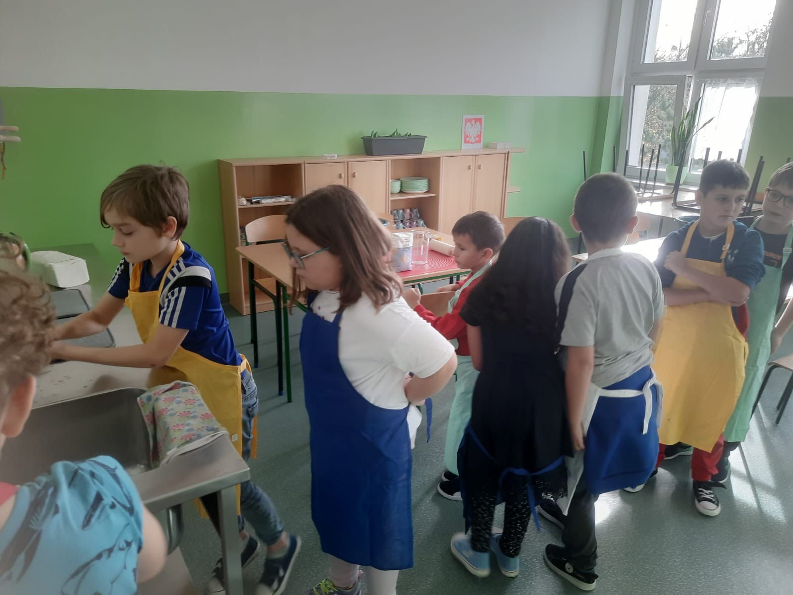Jak zawsze, zajęcia rozpoczęły się od przypomnienia zasad bezpieczeństwa i higieny pracy w kuchni. Uczniowie doskonalą nawyk mycia rąk przy każdym kontakcie z żywnością, organizowania swojego miejsca pracy i dbania o porządek na bieżąco. Po zakończonej pracy wszyscy pamiętali również o sprzątaniu po sobie – zmywaniu naczyń, odkładaniu przyborów na miejsce i porządkowaniu stołów.