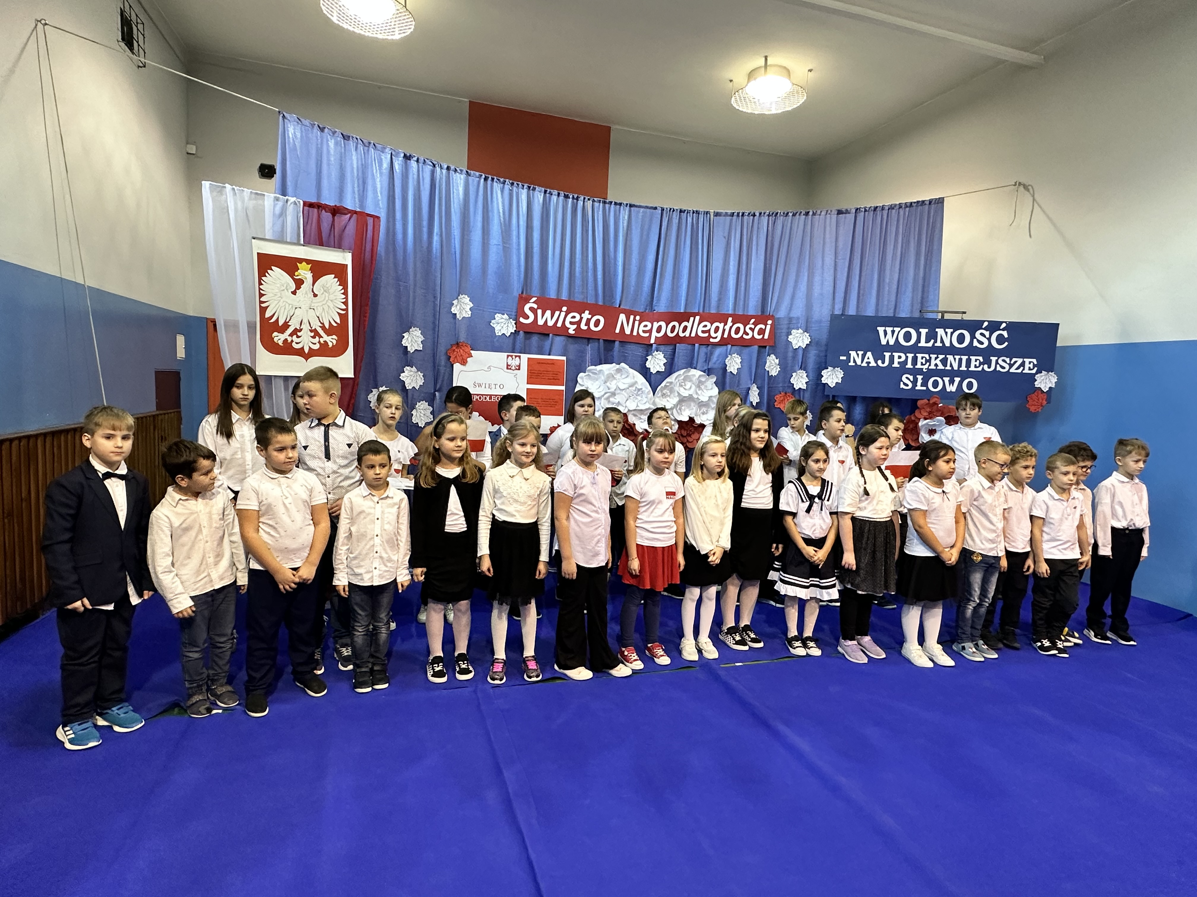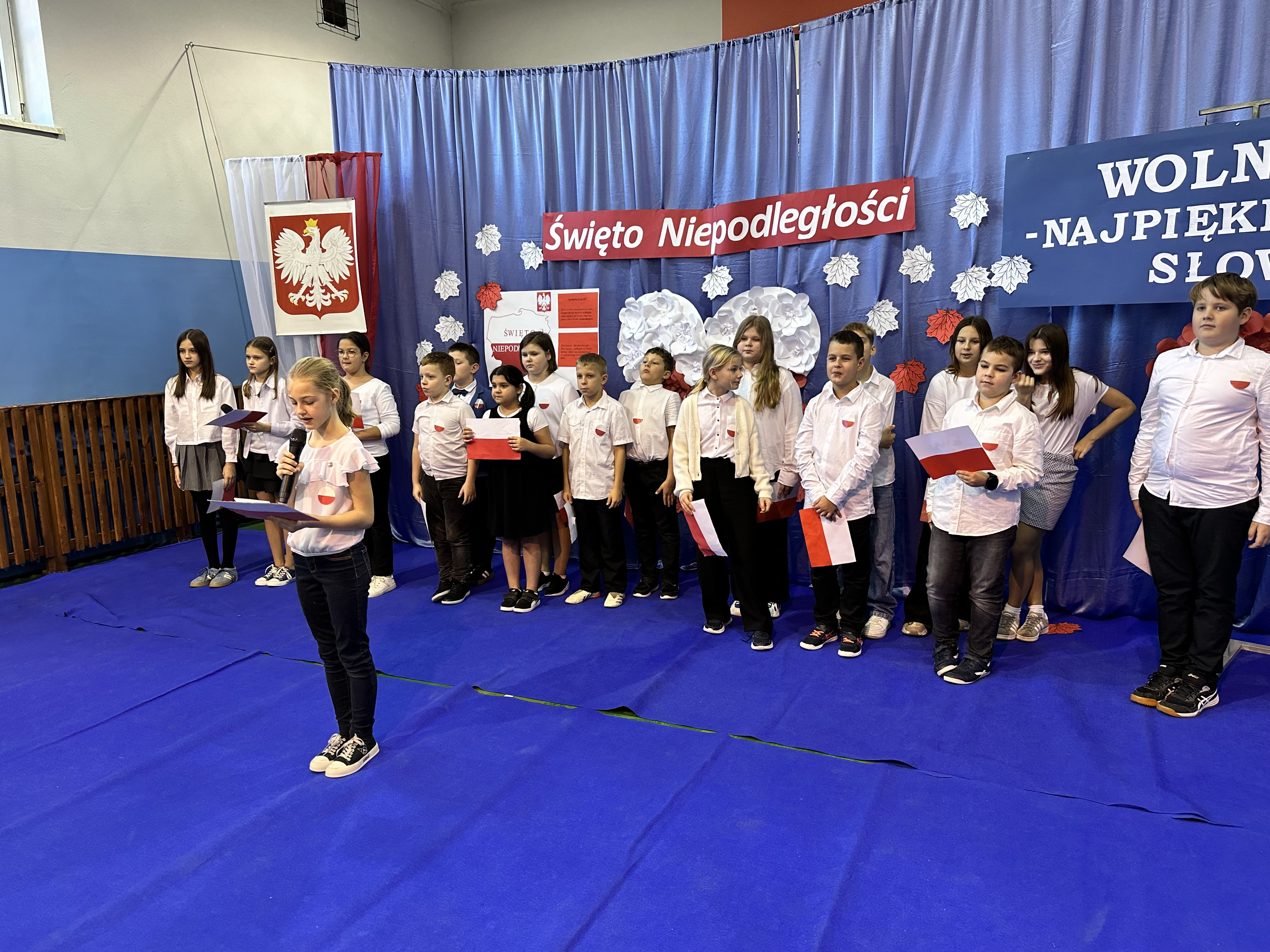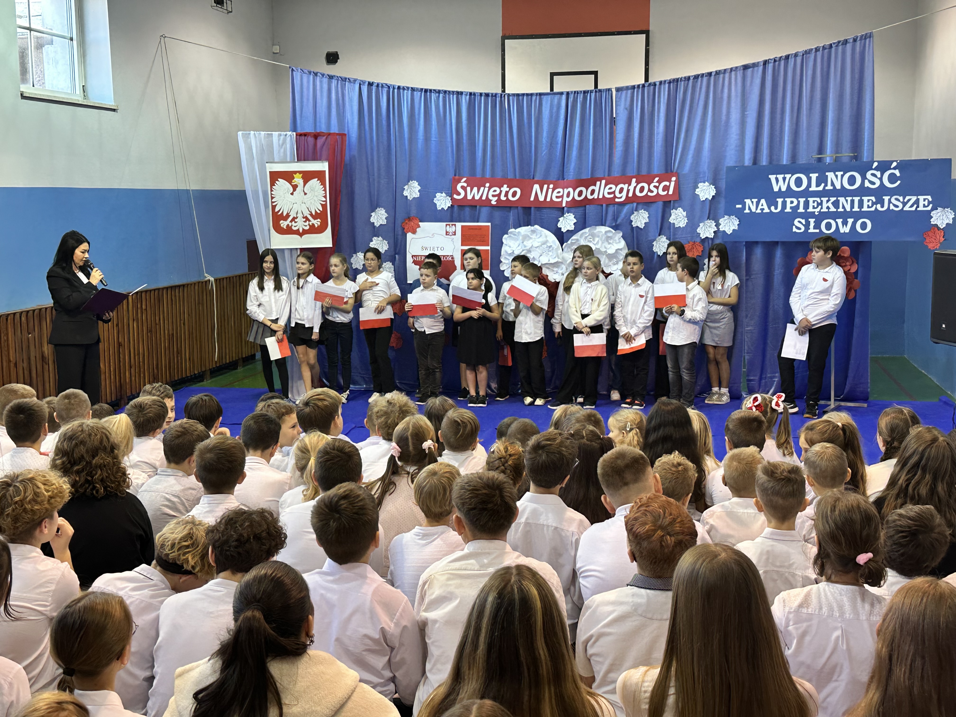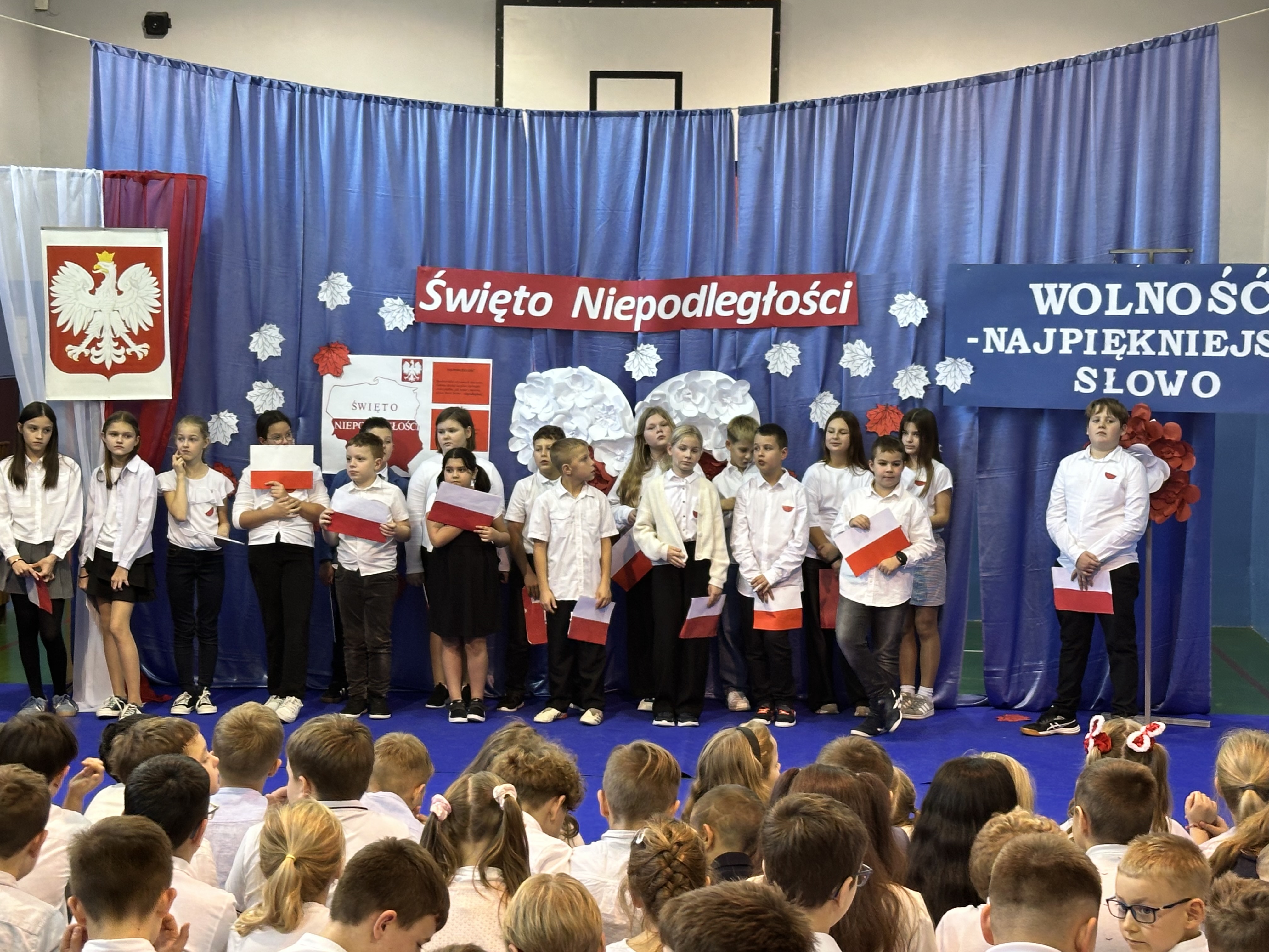 Uroczystość rozpoczęła się od powitania wszystkich przez panią Dyrektor oraz od pieśni patriotycznej, którą pięknie zaprezentowała klasa 1. O godzinie 11:11 wszyscy wspólnie odśpiewaliśmy hymn państwowy, włączając się tym samym w ogólnopolską akcję „Szkoła do hymnu”. Następnie uczniowie klasy 4 oraz uczennice klasy 5 zaprezentowali program artystyczny, przypominający trudną drogę Polaków do wolności oraz znaczenie patriotyzmu w dzisiejszych czasach.