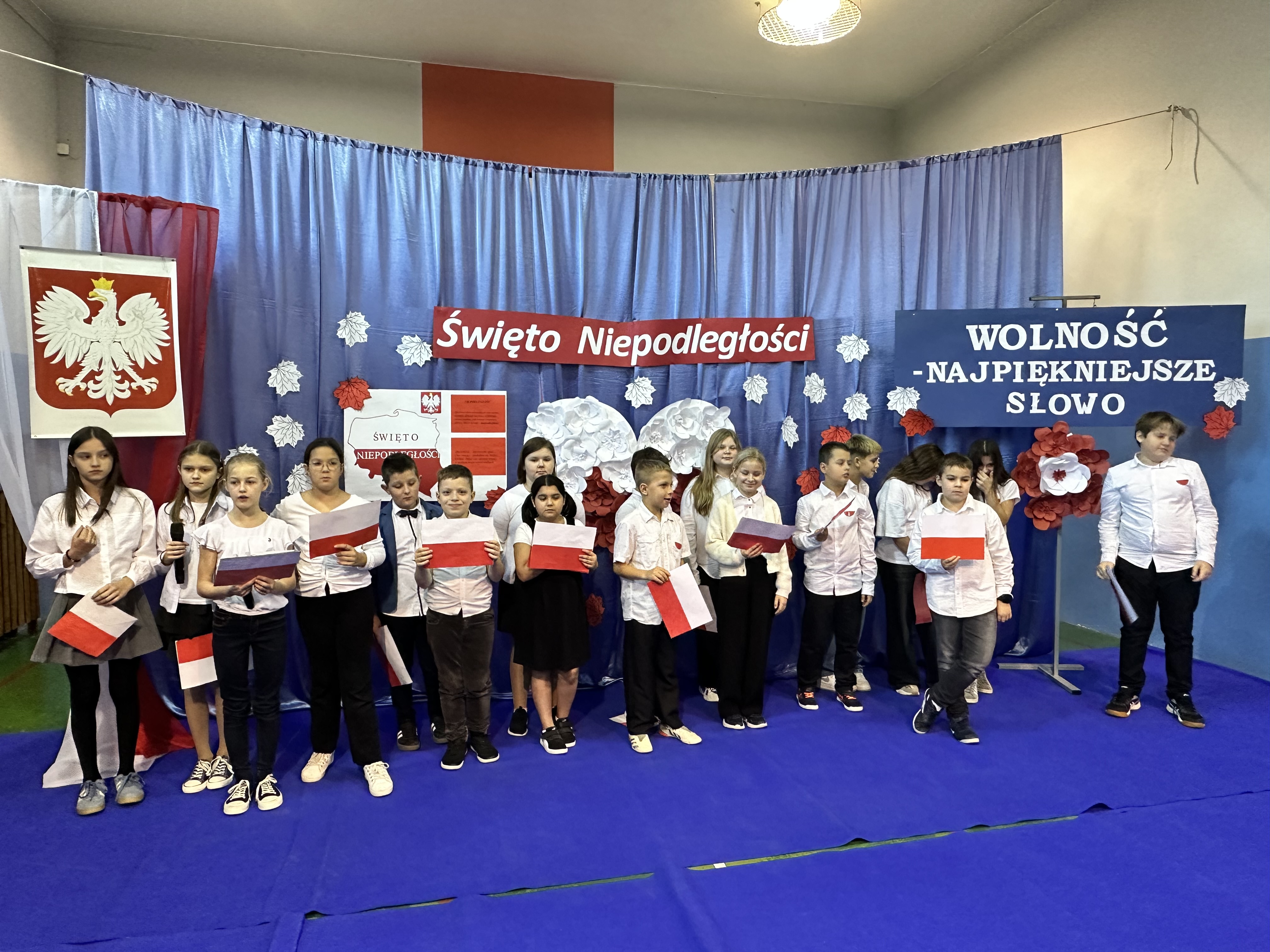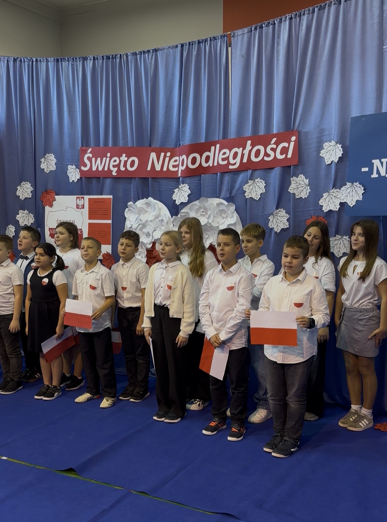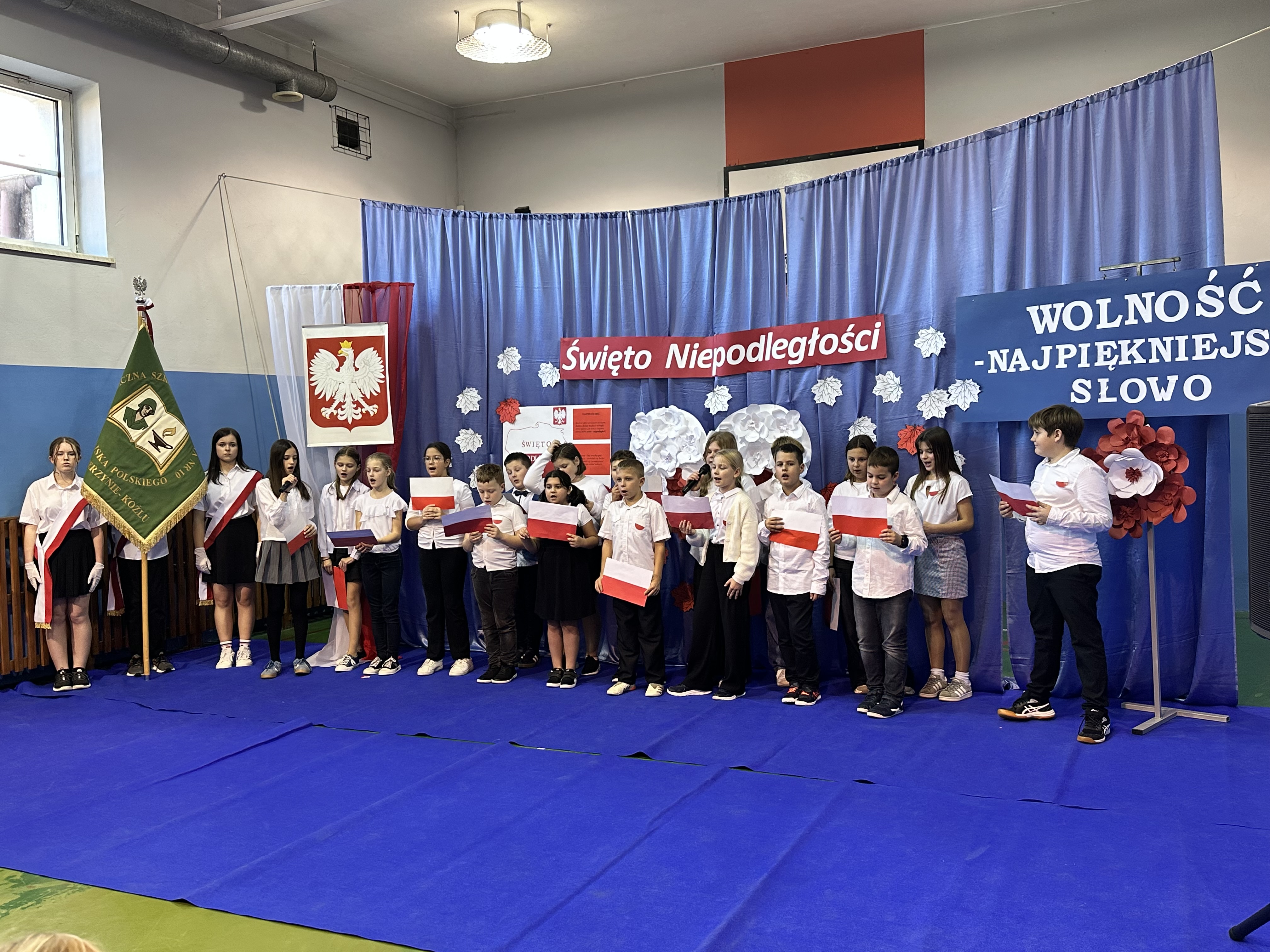 Uroczystość rozpoczęła się od powitania wszystkich przez panią Dyrektor oraz od pieśni patriotycznej, którą pięknie zaprezentowała klasa 1. O godzinie 11:11 wszyscy wspólnie odśpiewaliśmy hymn państwowy, włączając się tym samym w ogólnopolską akcję „Szkoła do hymnu”. Następnie uczniowie klasy 4 oraz uczennice klasy 5 zaprezentowali program artystyczny, przypominający trudną drogę Polaków do wolności oraz znaczenie patriotyzmu w dzisiejszych czasach.