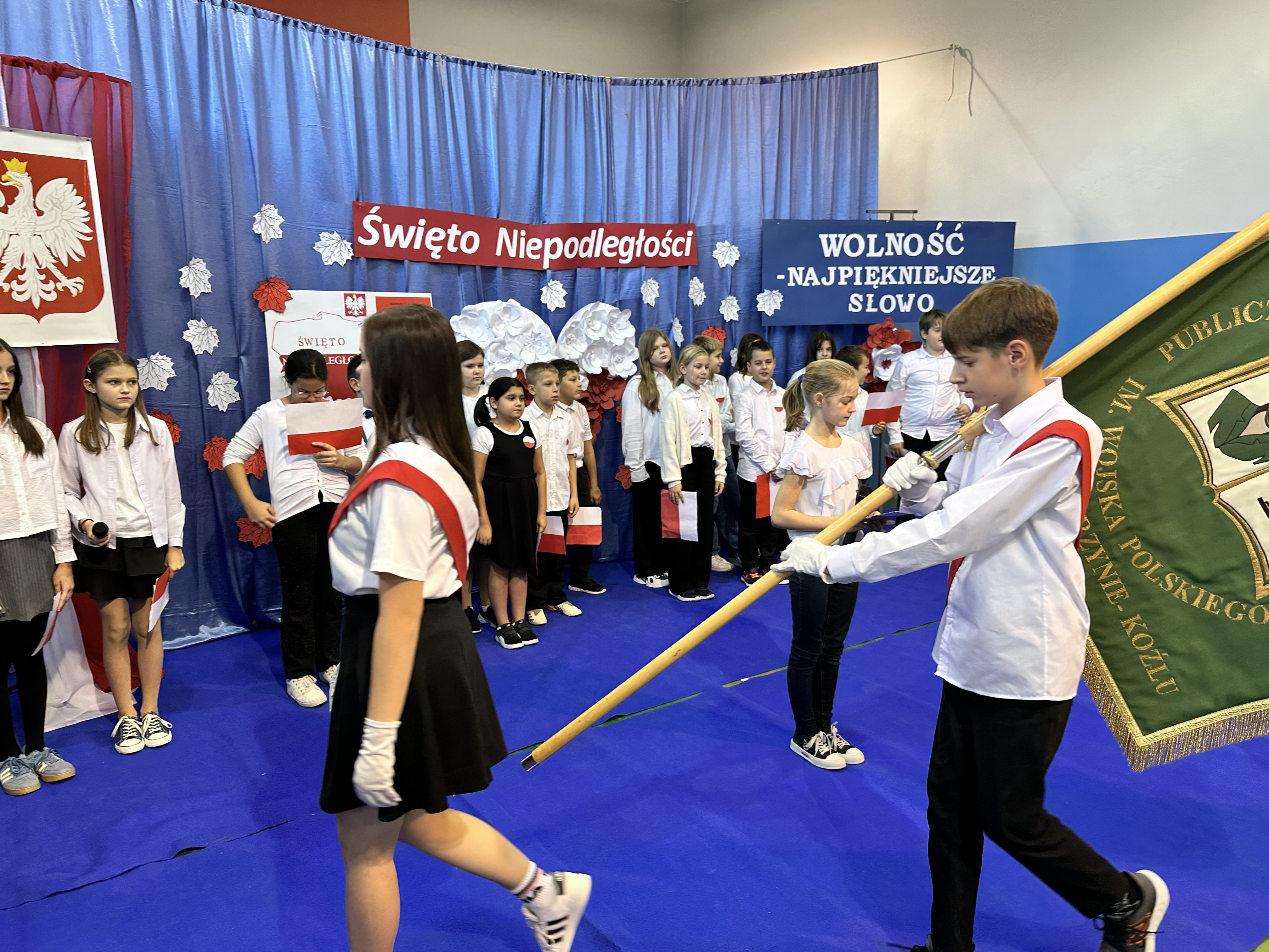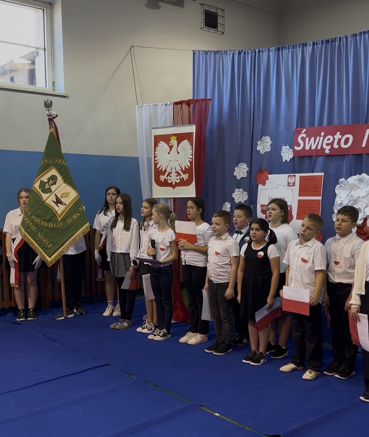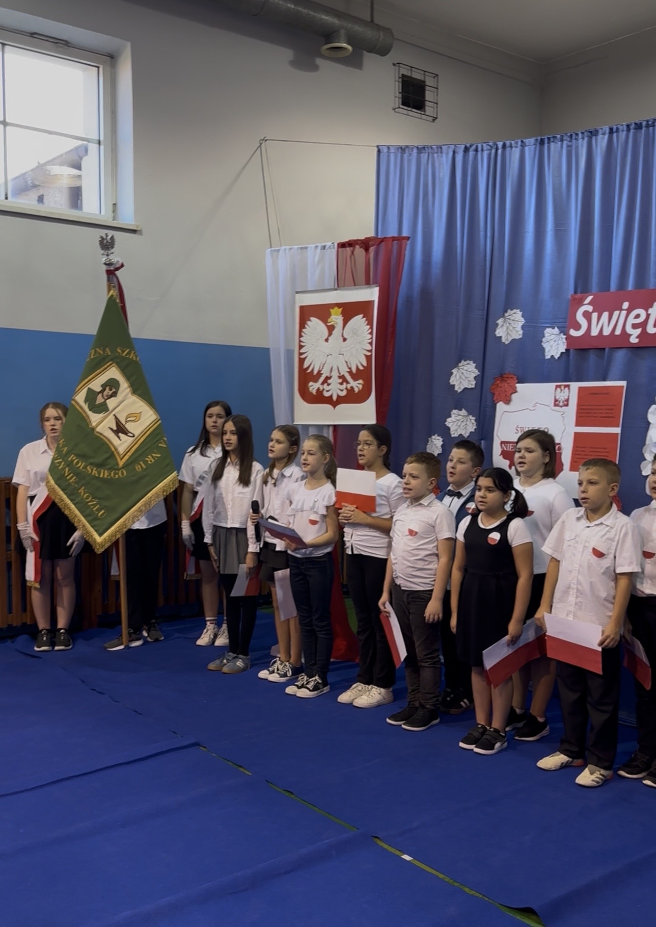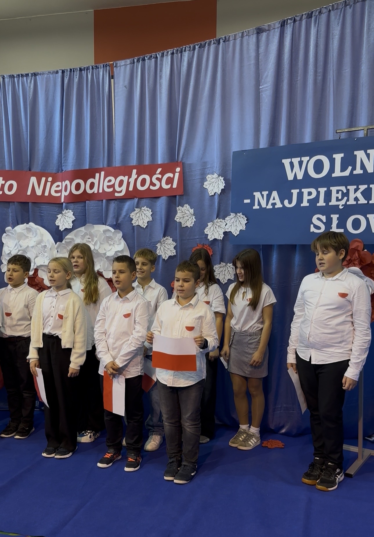 Uroczystość rozpoczęła się od powitania wszystkich przez panią Dyrektor oraz od pieśni patriotycznej, którą pięknie zaprezentowała klasa 1. O godzinie 11:11 wszyscy wspólnie odśpiewaliśmy hymn państwowy, włączając się tym samym w ogólnopolską akcję „Szkoła do hymnu”. Następnie uczniowie klasy 4 oraz uczennice klasy 5 zaprezentowali program artystyczny, przypominający trudną drogę Polaków do wolności oraz znaczenie patriotyzmu w dzisiejszych czasach.