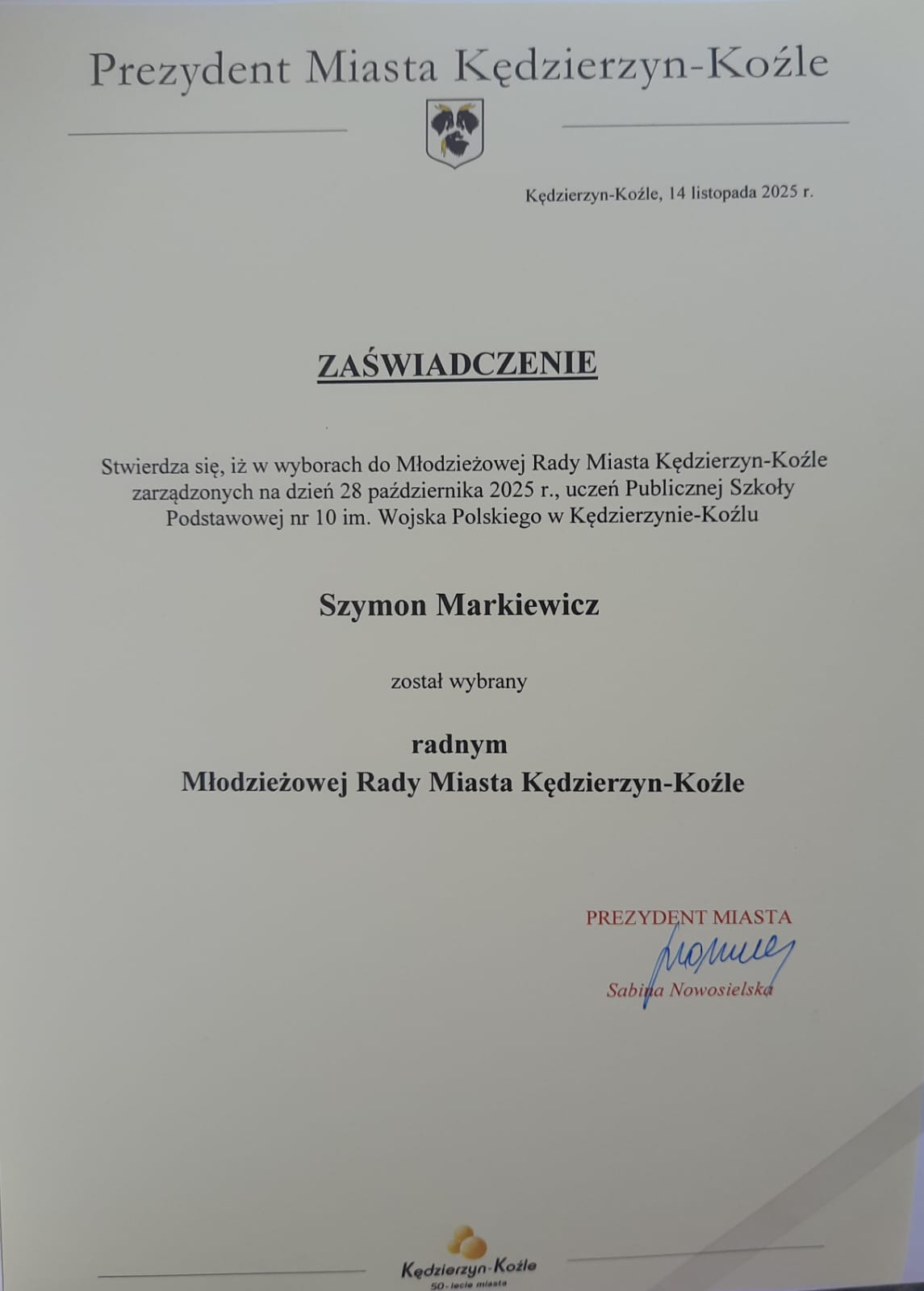 Z dumą informujemy, że Szymon, uczeń klasy 8, został wybrany radnym Młodzieżowej Rady Miasta z okręgu wyborczego obejmującego naszą szkołę. To ogromne wyróżnienie i dowód zaufania, jakim obdarzyli go jego rówieśnicy.