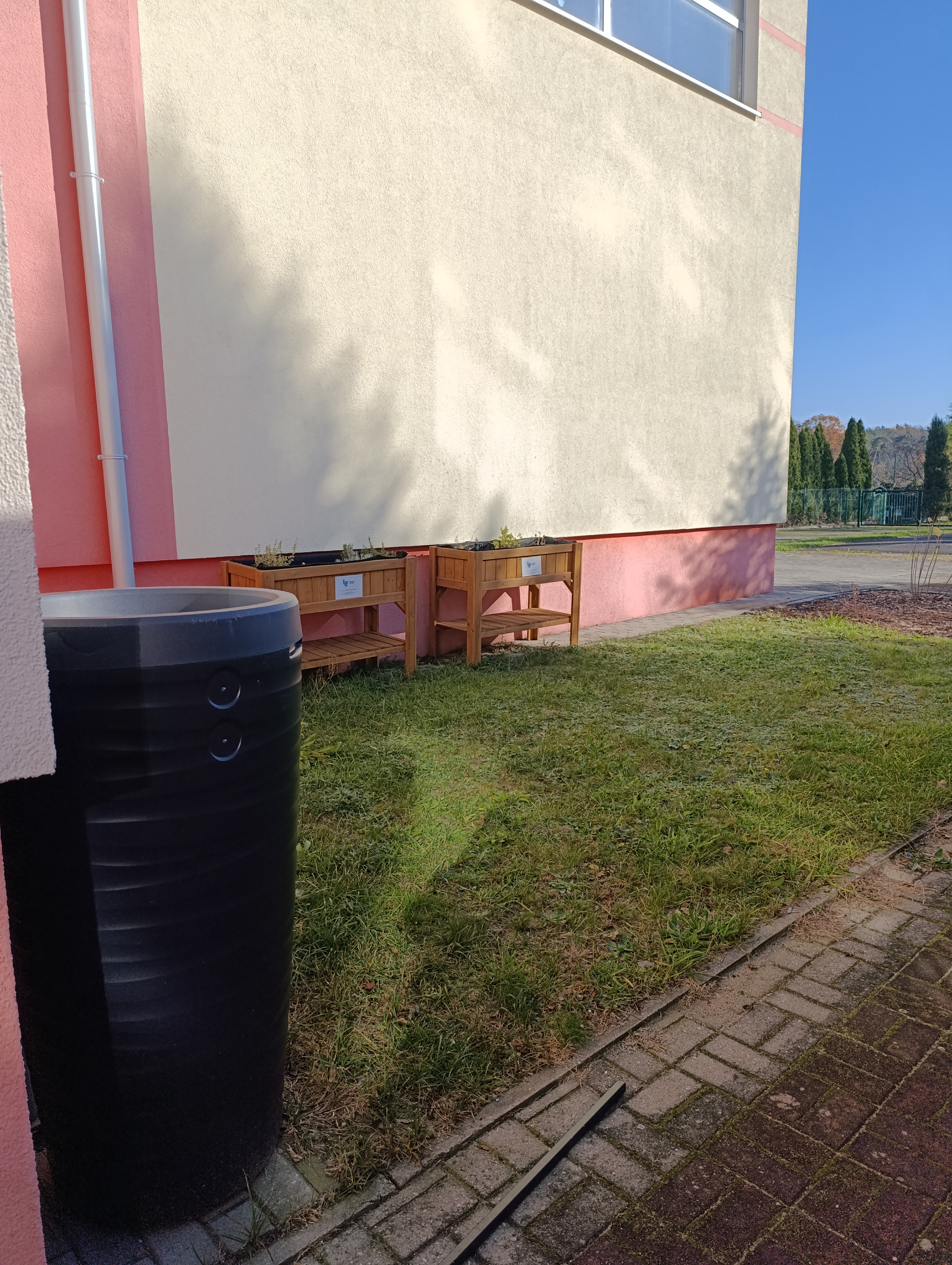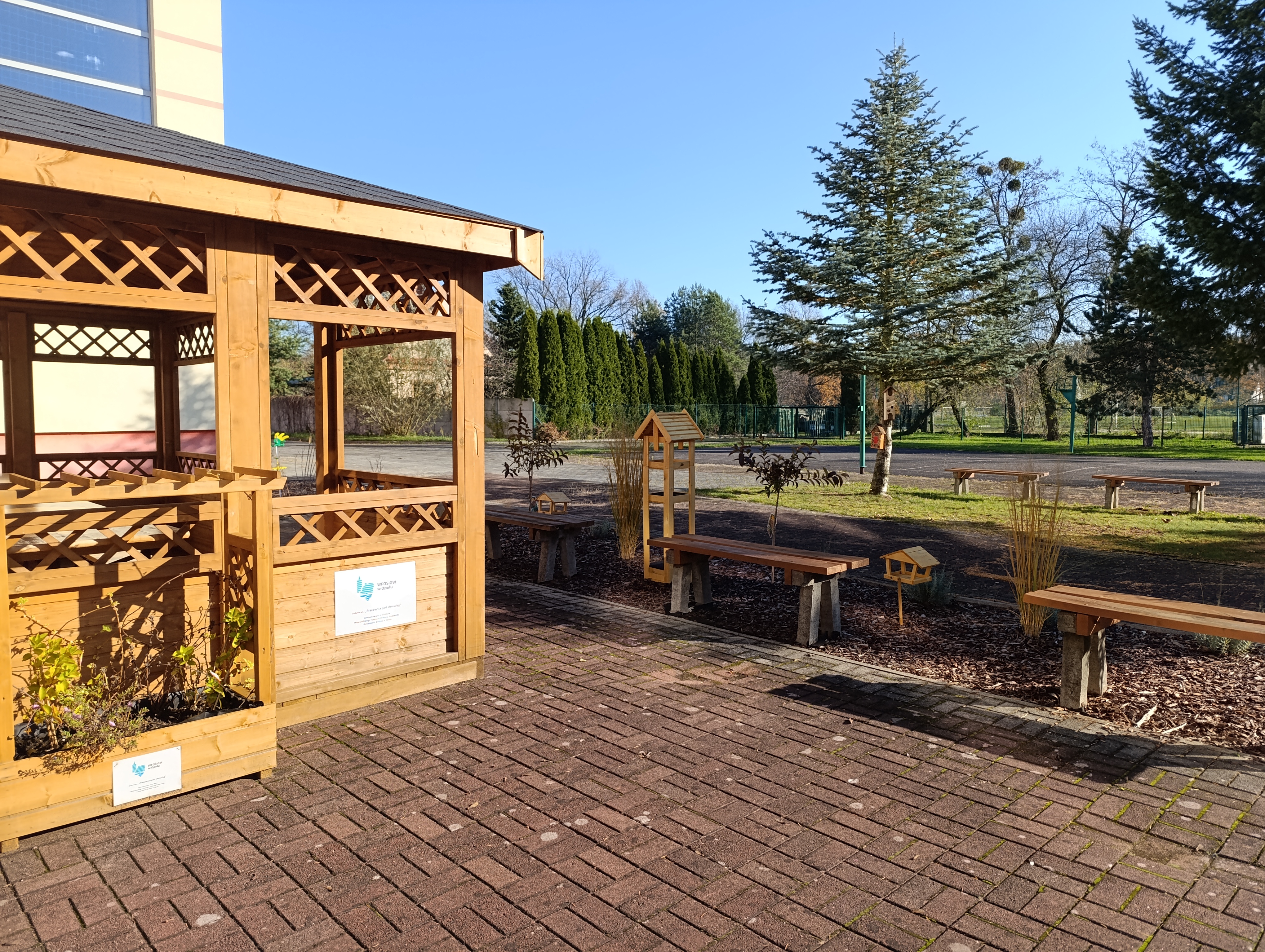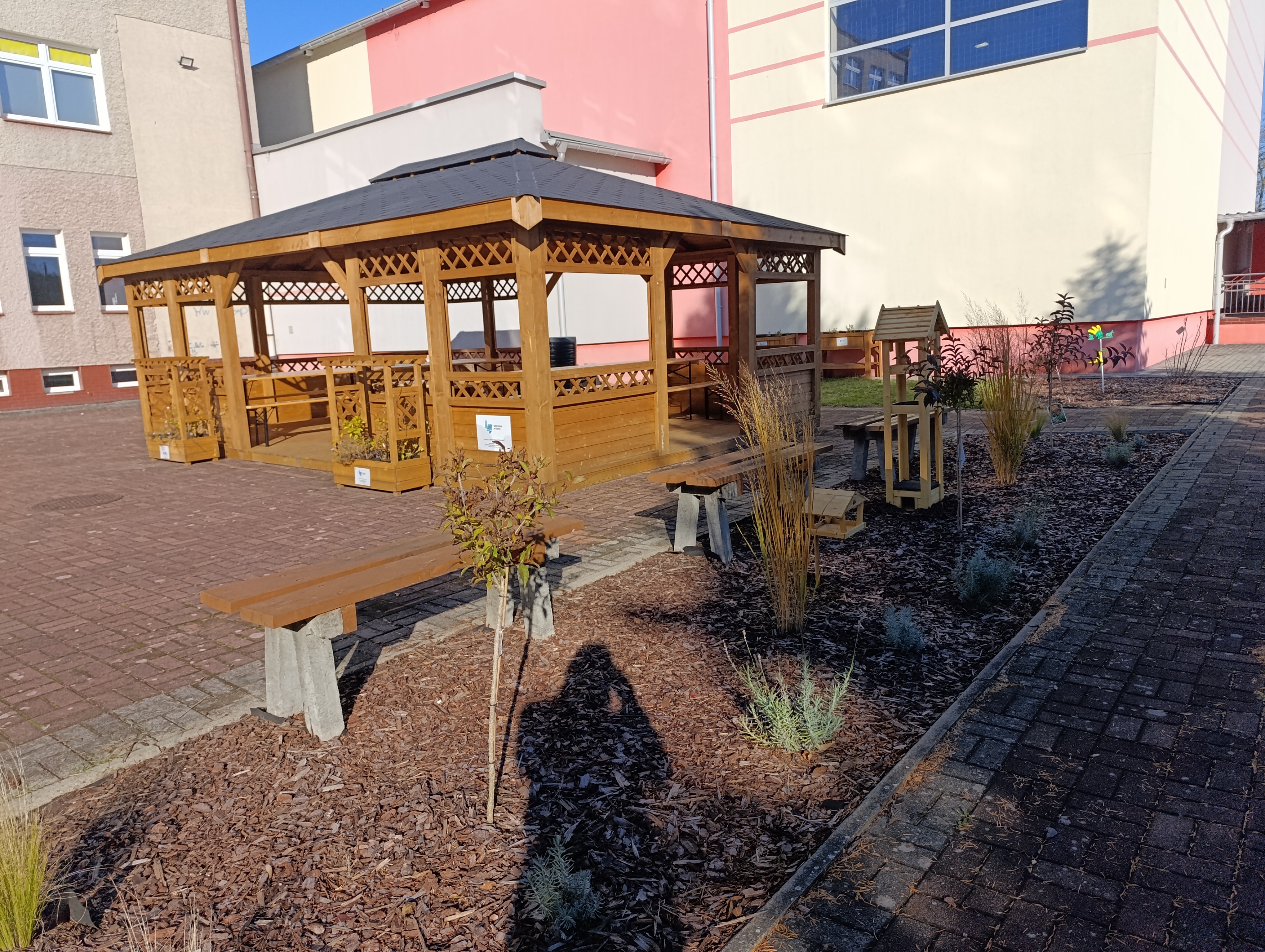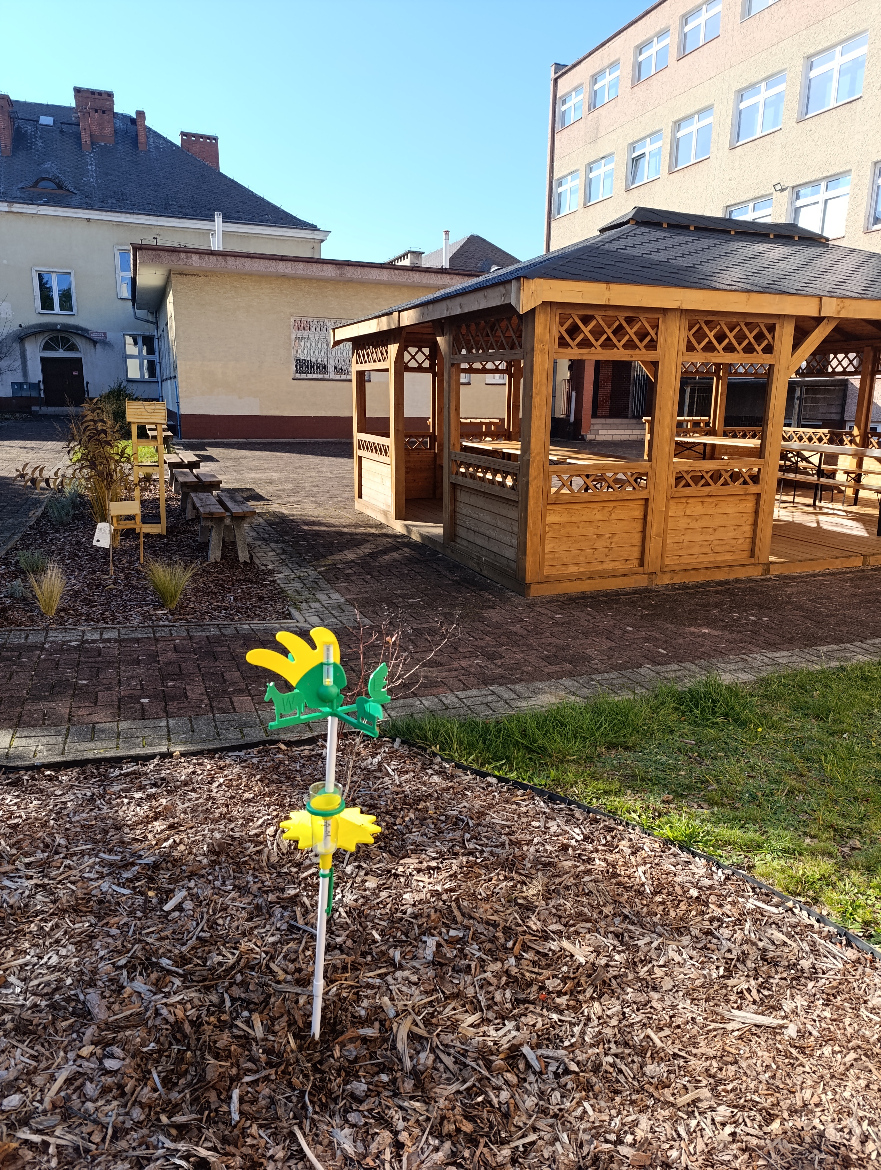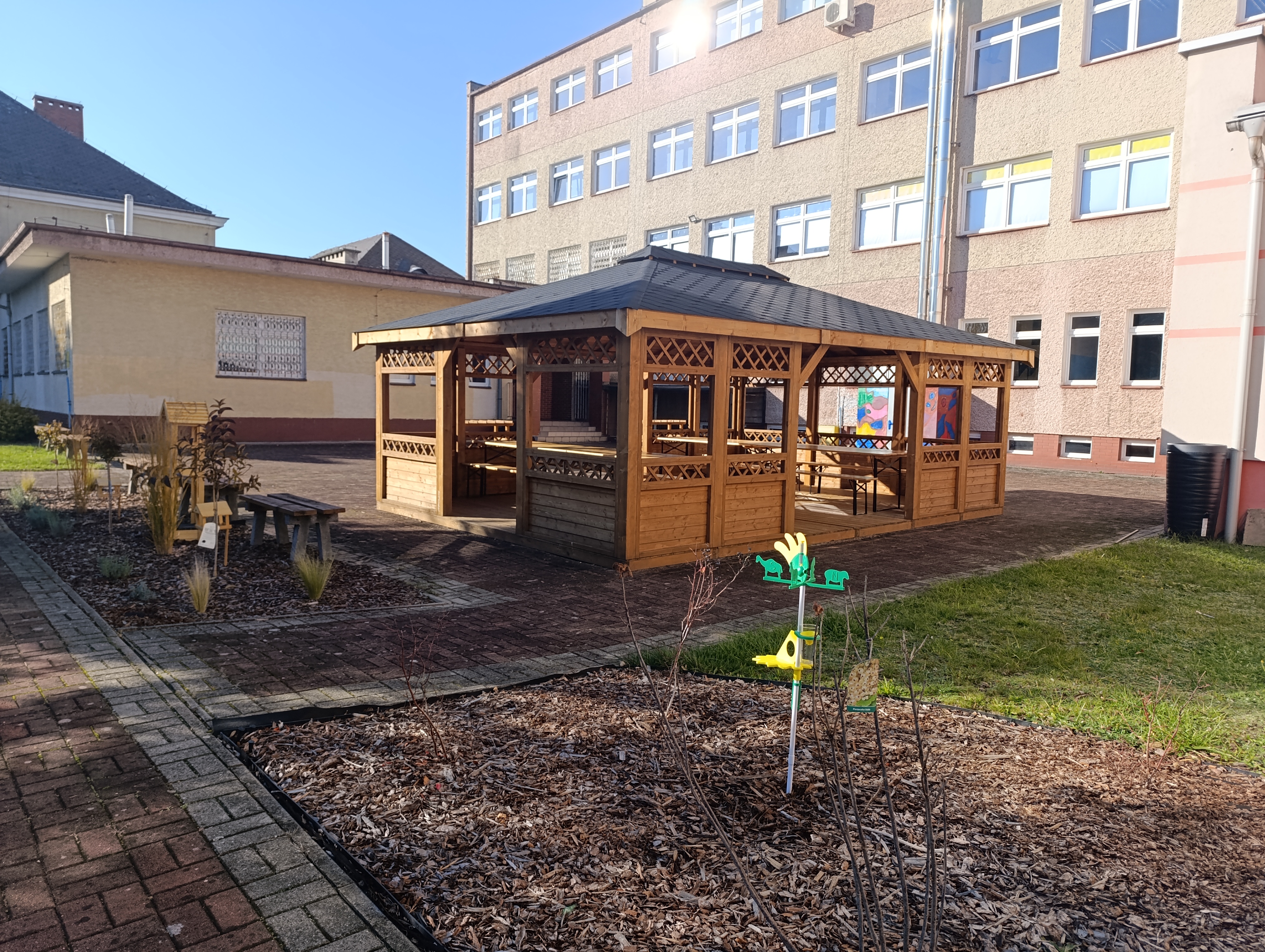 Najważniejszym elementem nowej przestrzeni jest altana ze stołami – „Zielona klasa” – mieszcząca 30 osób, która stała się centrum naszych plenerowych lekcji. Obok altany ustawiliśmy donice z kwiatami i ziołami, a także założyliśmy kwietne rabaty zarówno wokół altany, jak i przed szkołą. Nie zabrakło również miejsca na kwietną łąkę, która będzie przyciągać owady zapylające i wzbogacać nasze otoczenie o kolory i zapachy.
