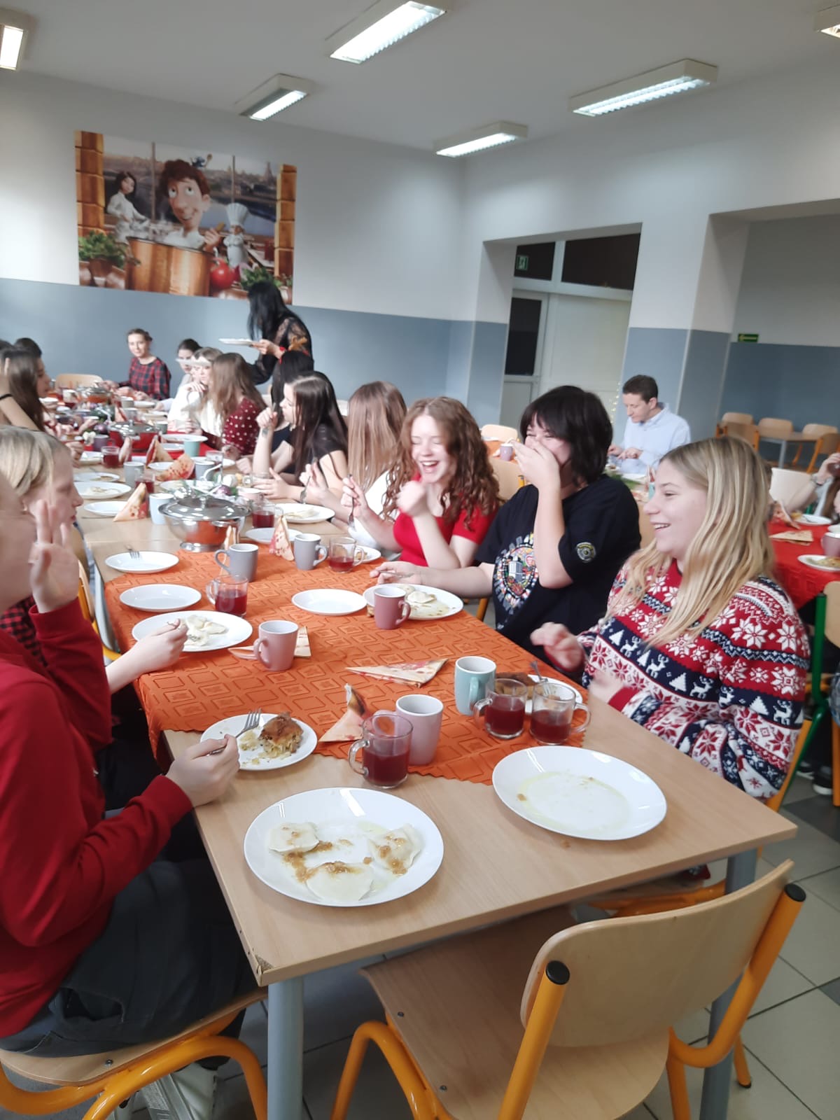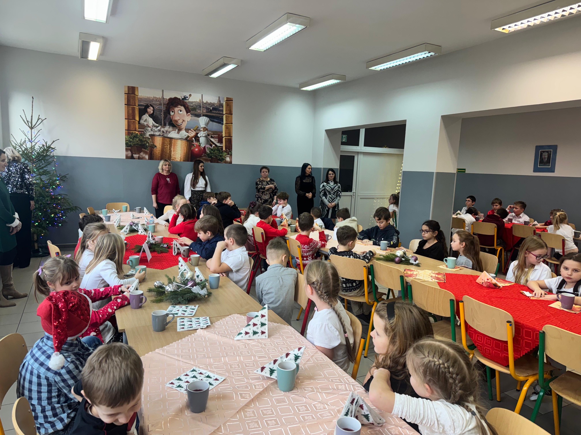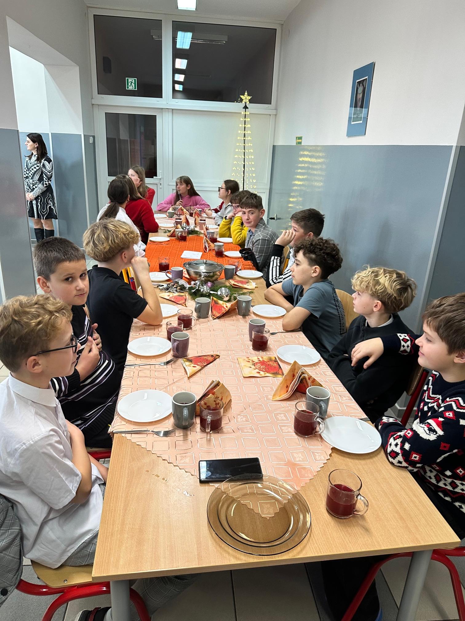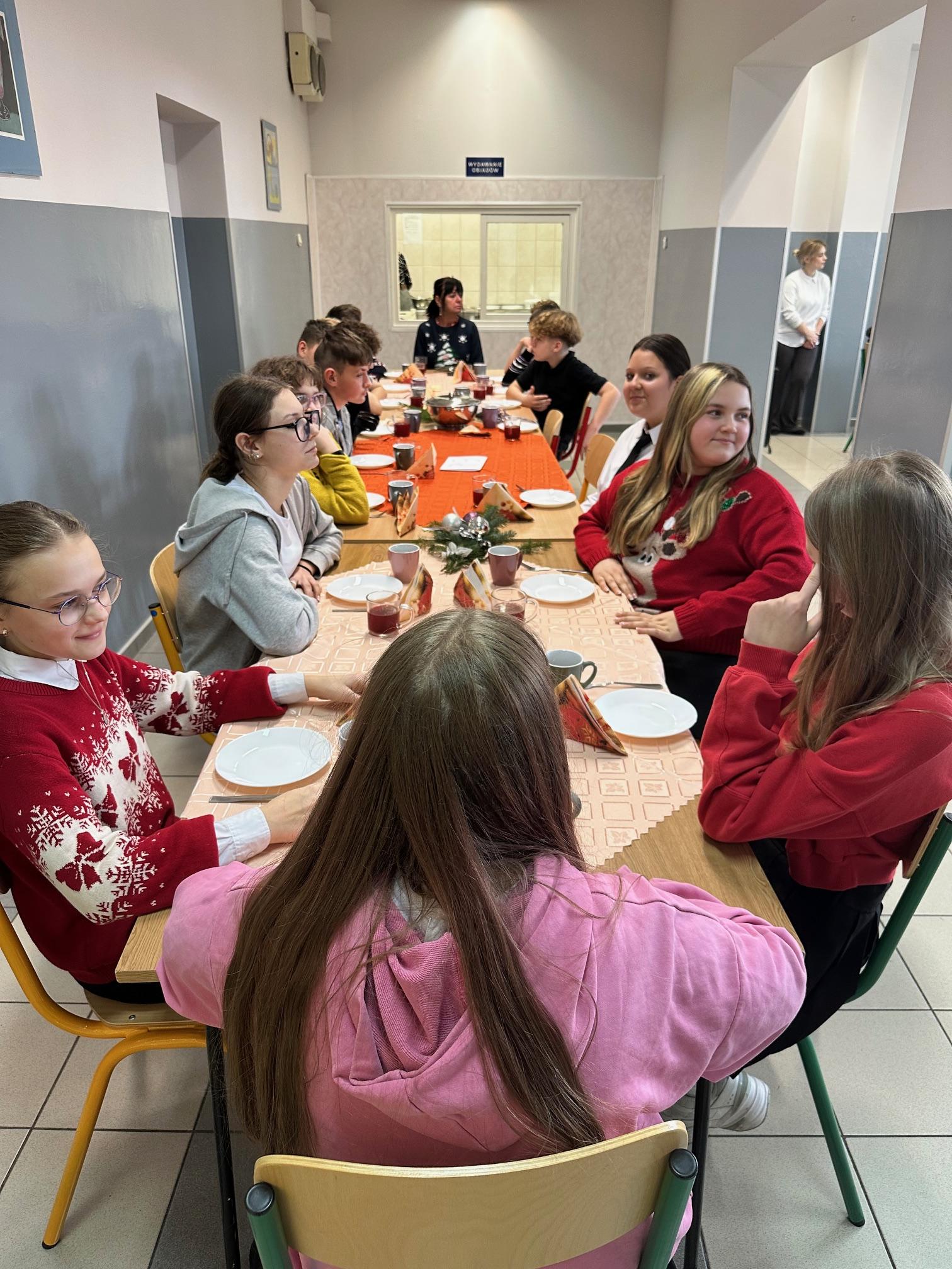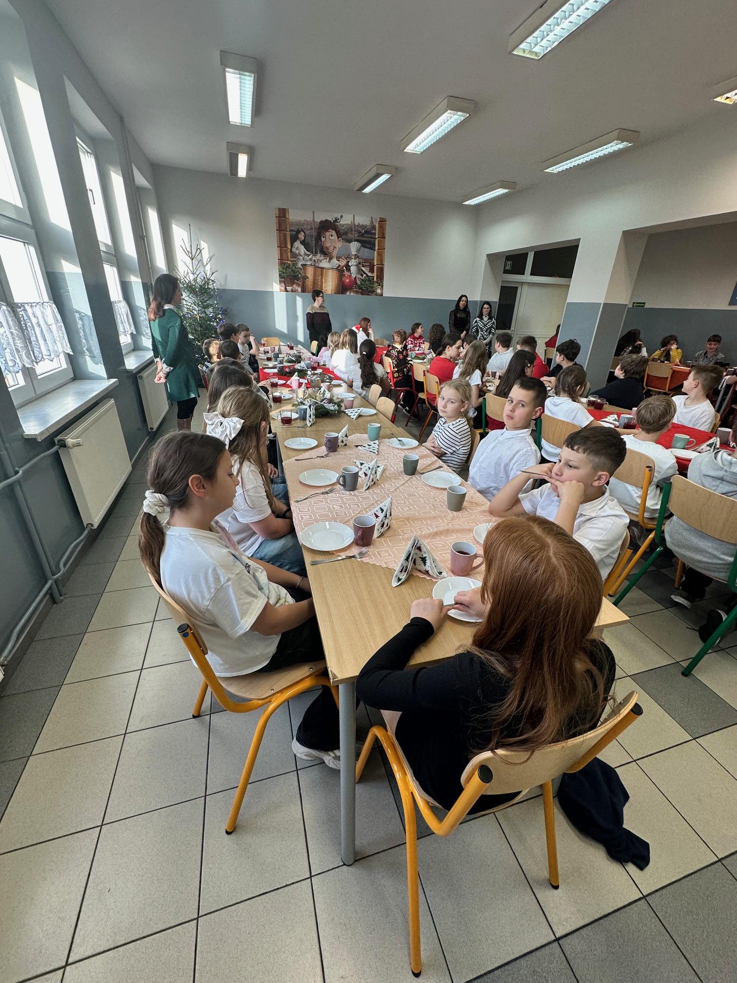 Ważnym elementem tego dnia był wspólny świąteczny obiad. Barszcz czerwony z krokietem oraz pierogi, przygotowane przez Panie z kuchni szkolnej, wprowadziły wszystkich w prawdziwie bożonarodzeniowy nastrój. Podczas tego obiadu Dyrektor Szkoły, Pani Karolina Pietrzyk, oraz Wicedyrektor, Pani Agnieszka Wojtyła-Melson, złożyły uczniom i nauczycielom ciepłe, pełne wzruszeń życzenia świąteczne. Po obiedzie uczniowie i nauczyciele wspólnie śpiewali kolędy, podkreślając radosny i integrujący charakter tego spotkania.