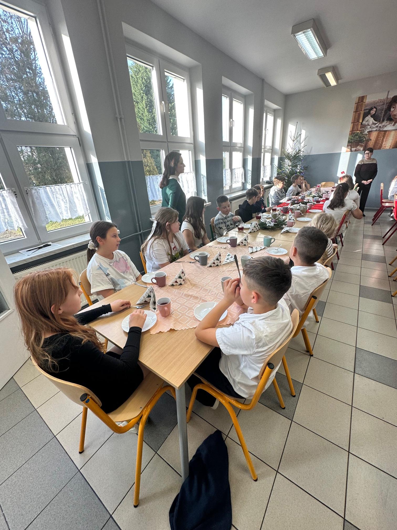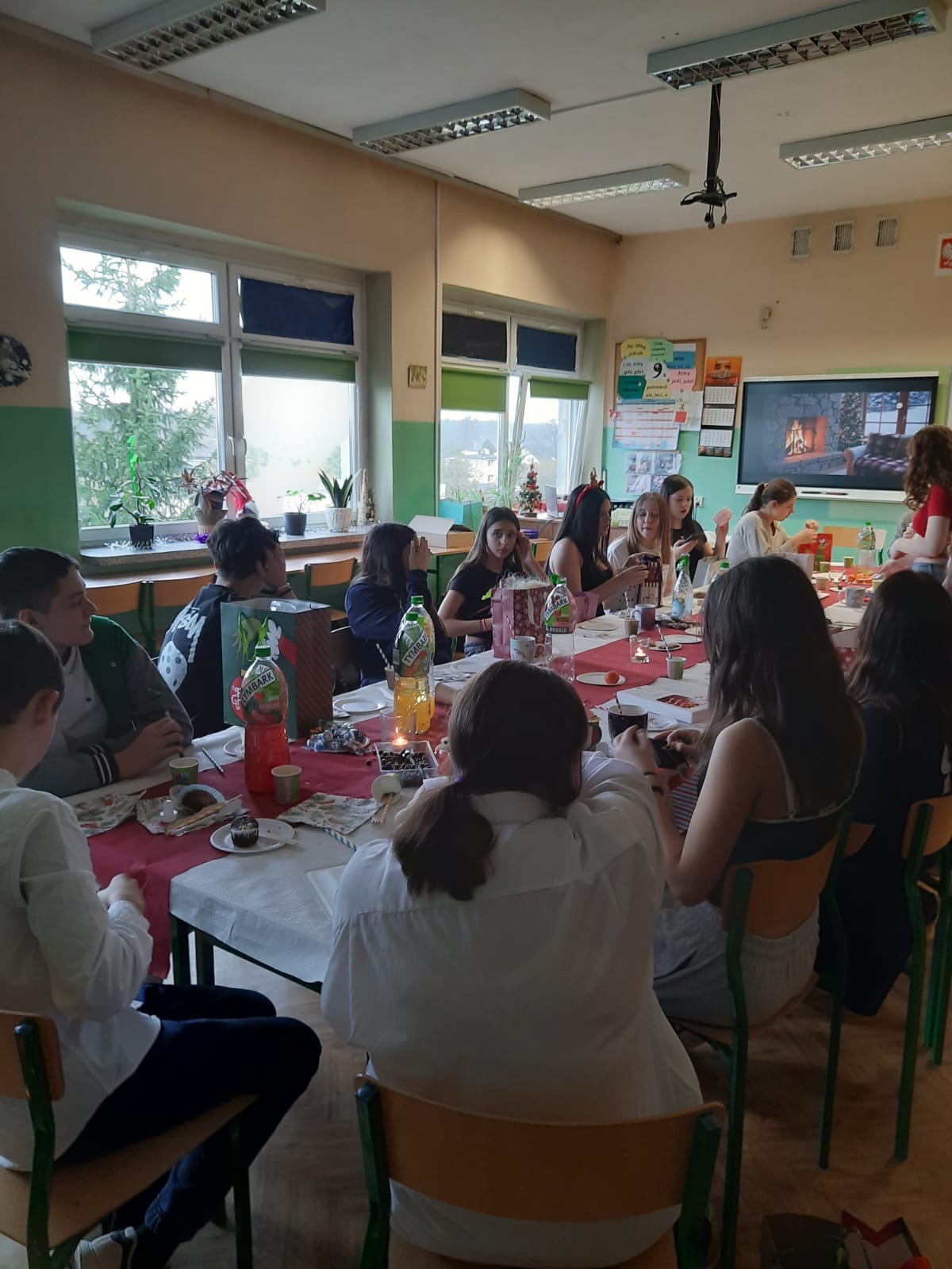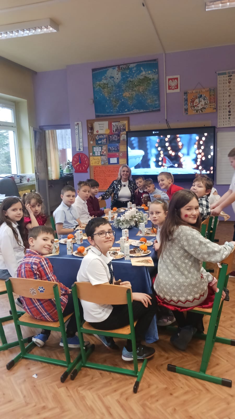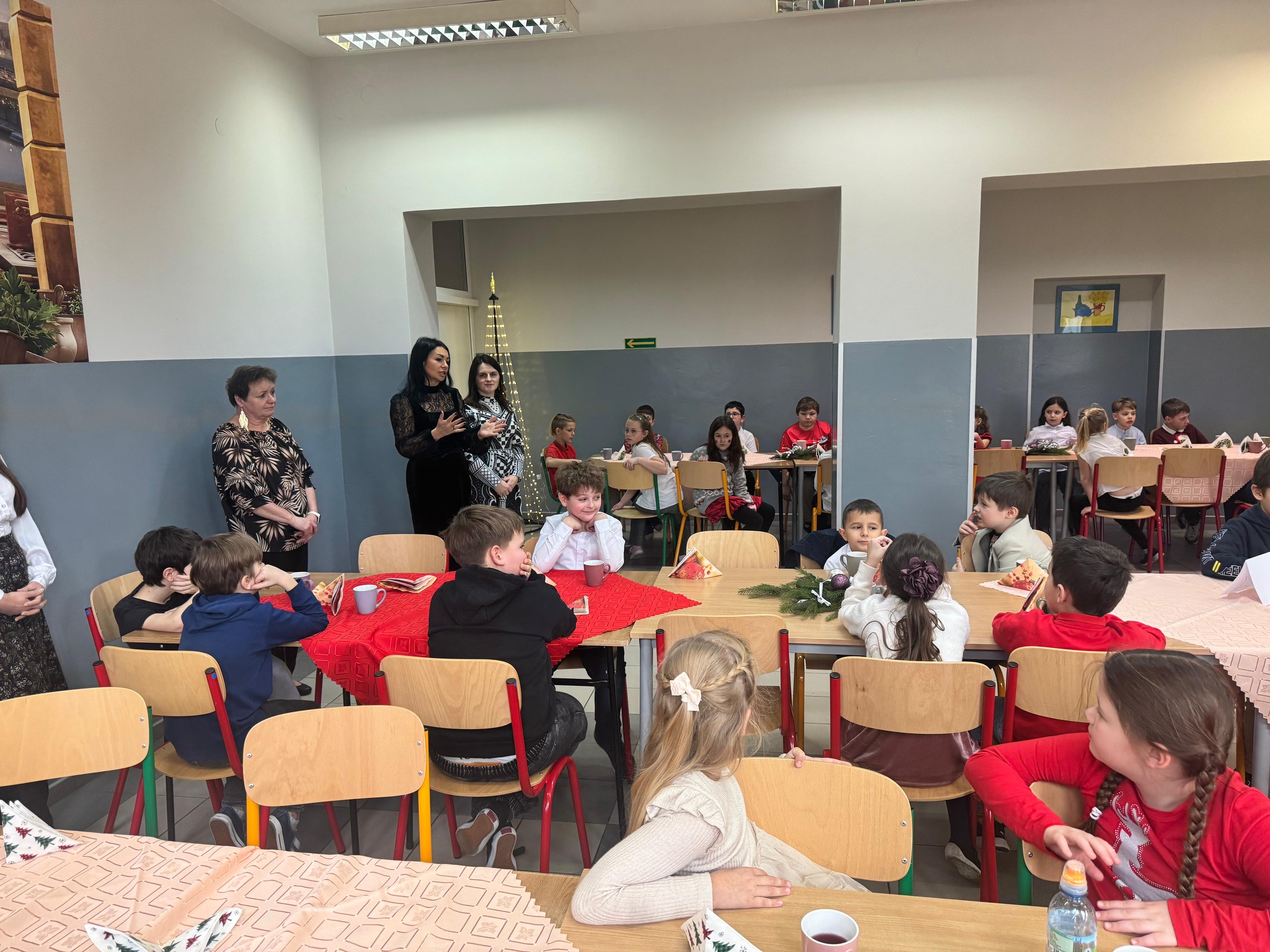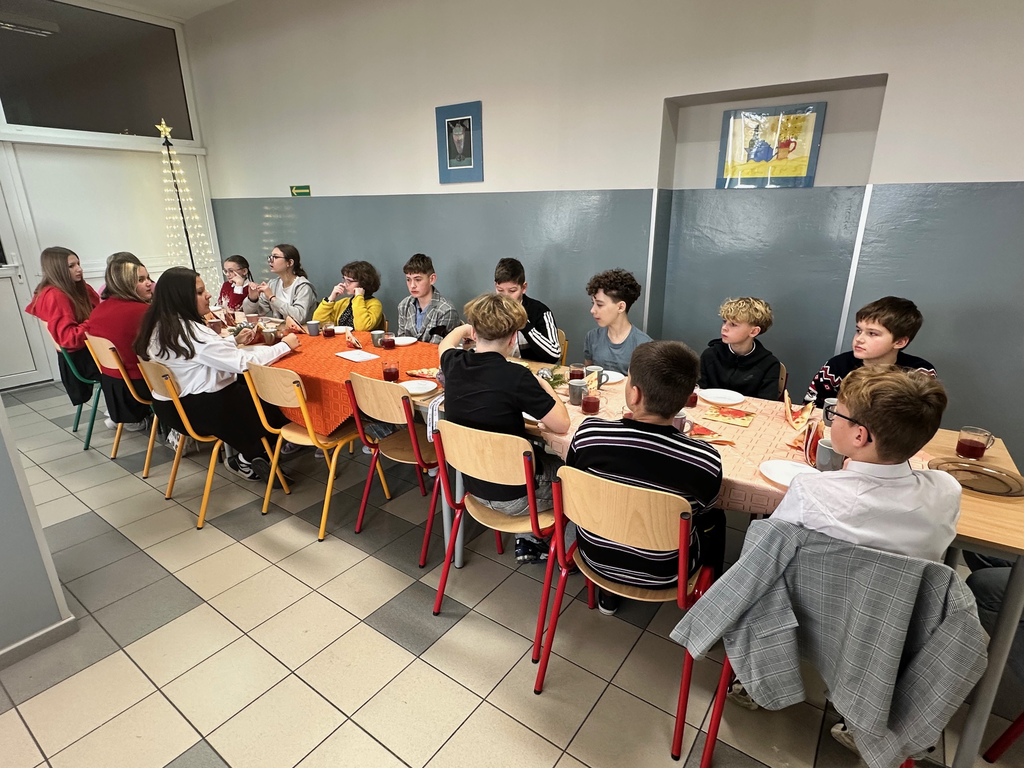Ważnym elementem tego dnia był wspólny świąteczny obiad. Barszcz czerwony z krokietem oraz pierogi, przygotowane przez Panie z kuchni szkolnej, wprowadziły wszystkich w prawdziwie bożonarodzeniowy nastrój. Podczas tego obiadu Dyrektor Szkoły, Pani Karolina Pietrzyk, oraz Wicedyrektor, Pani Agnieszka Wojtyła-Melson, złożyły uczniom i nauczycielom ciepłe, pełne wzruszeń życzenia świąteczne. Po obiedzie uczniowie i nauczyciele wspólnie śpiewali kolędy, podkreślając radosny i integrujący charakter tego spotkania.