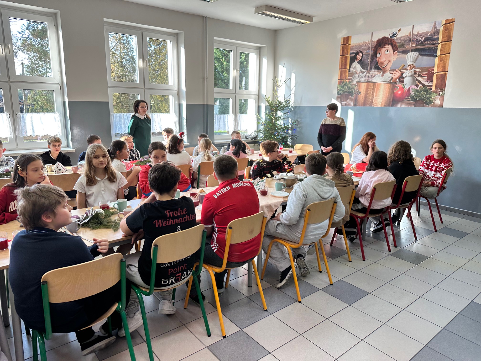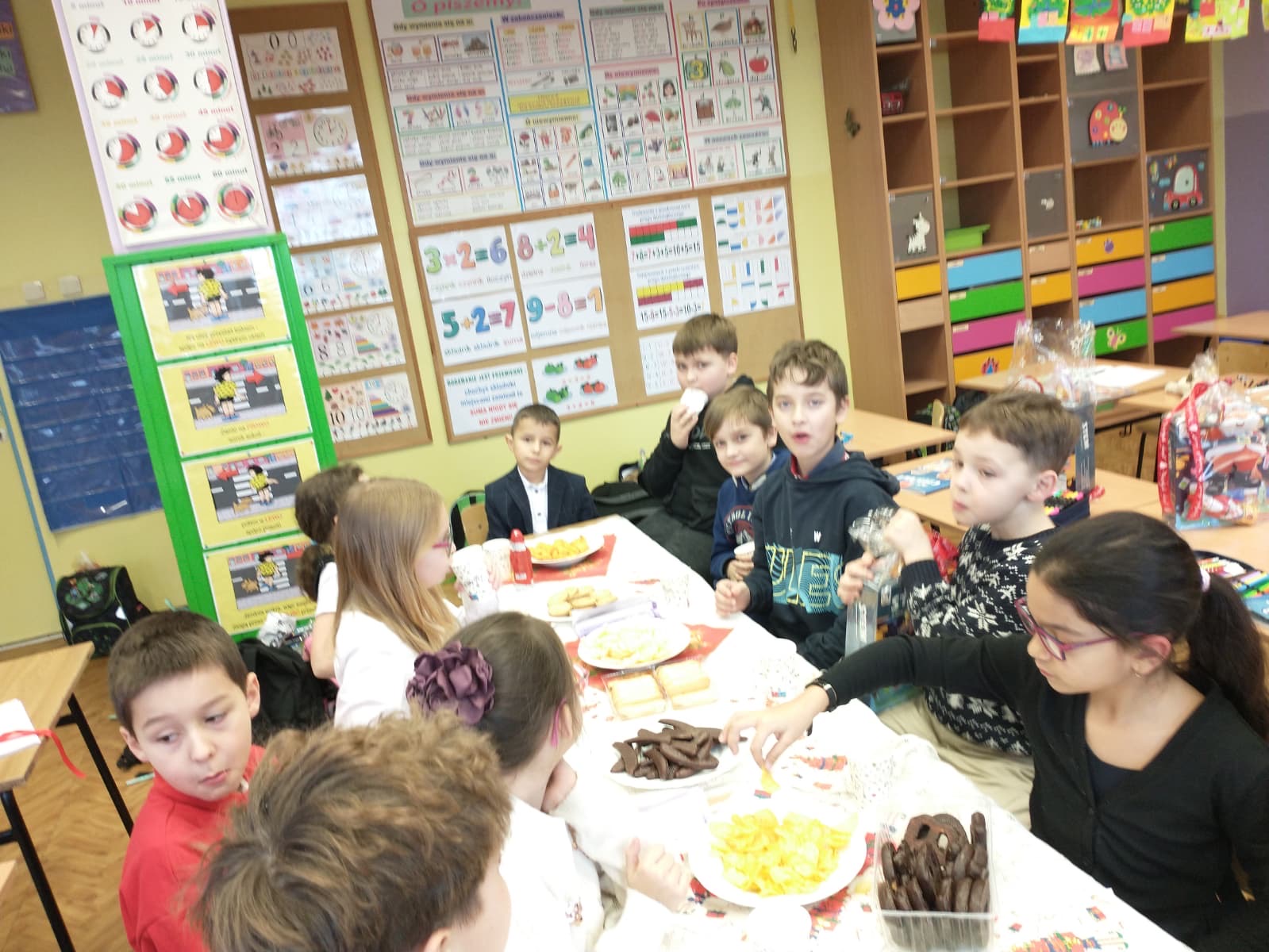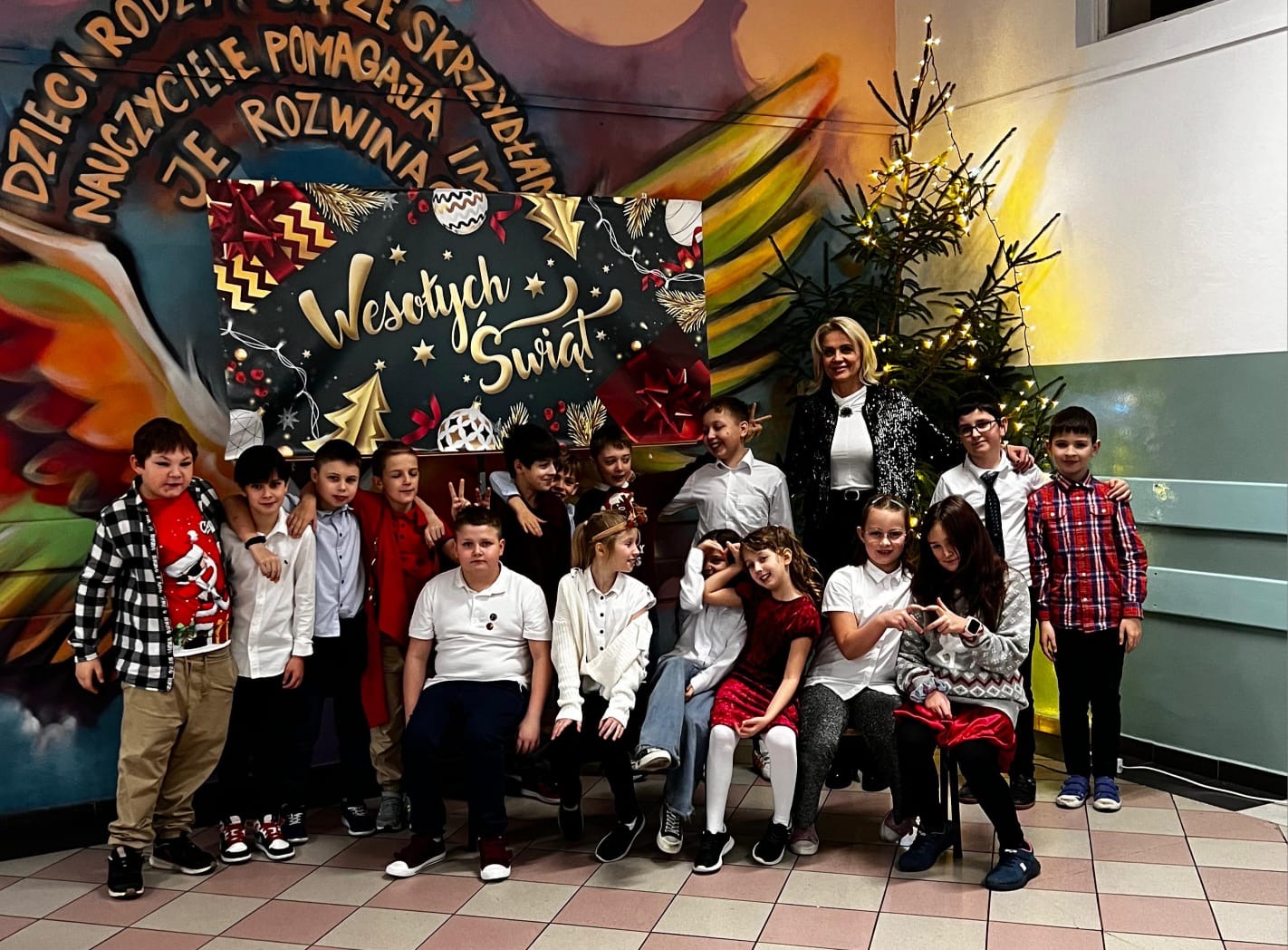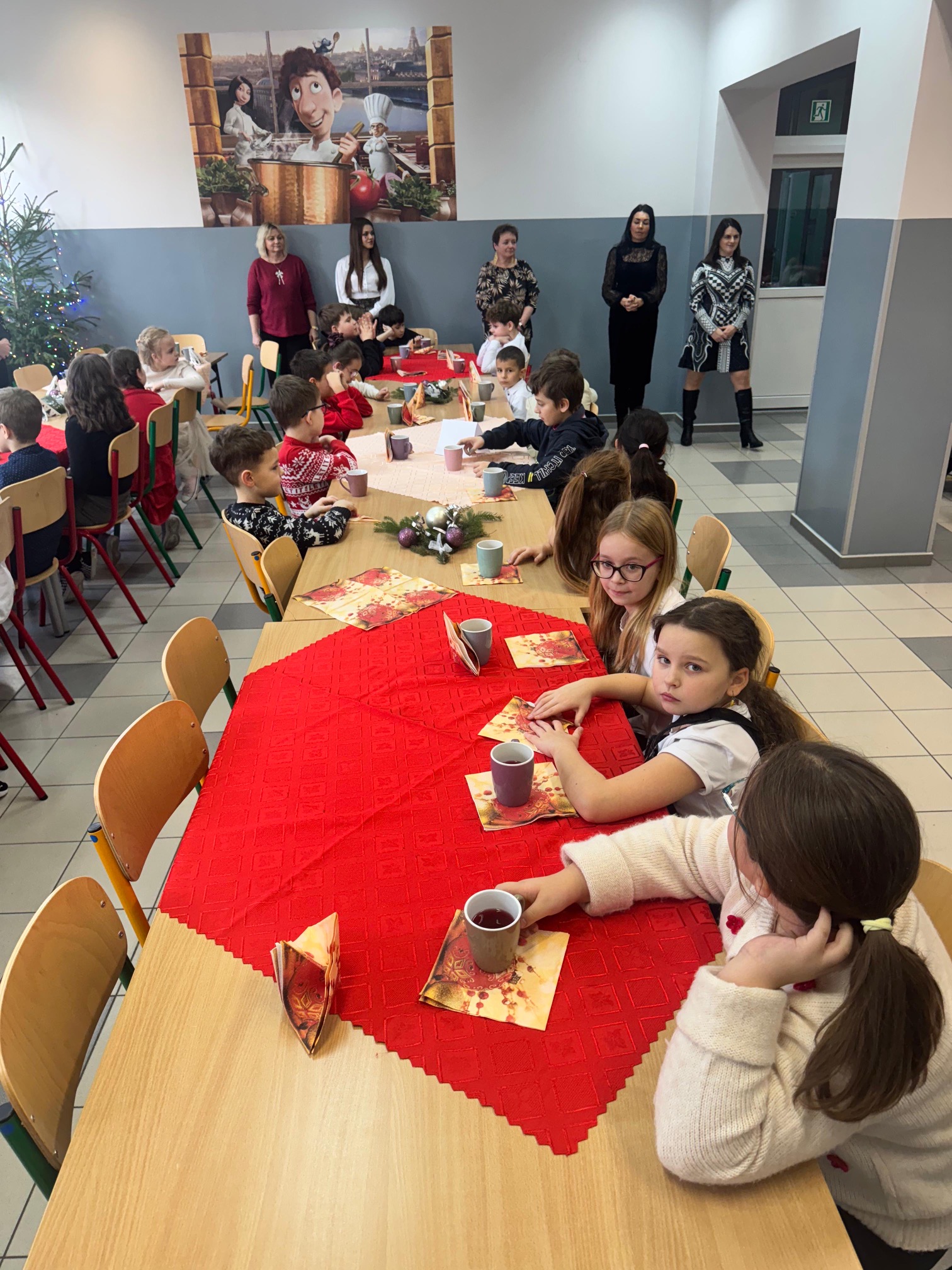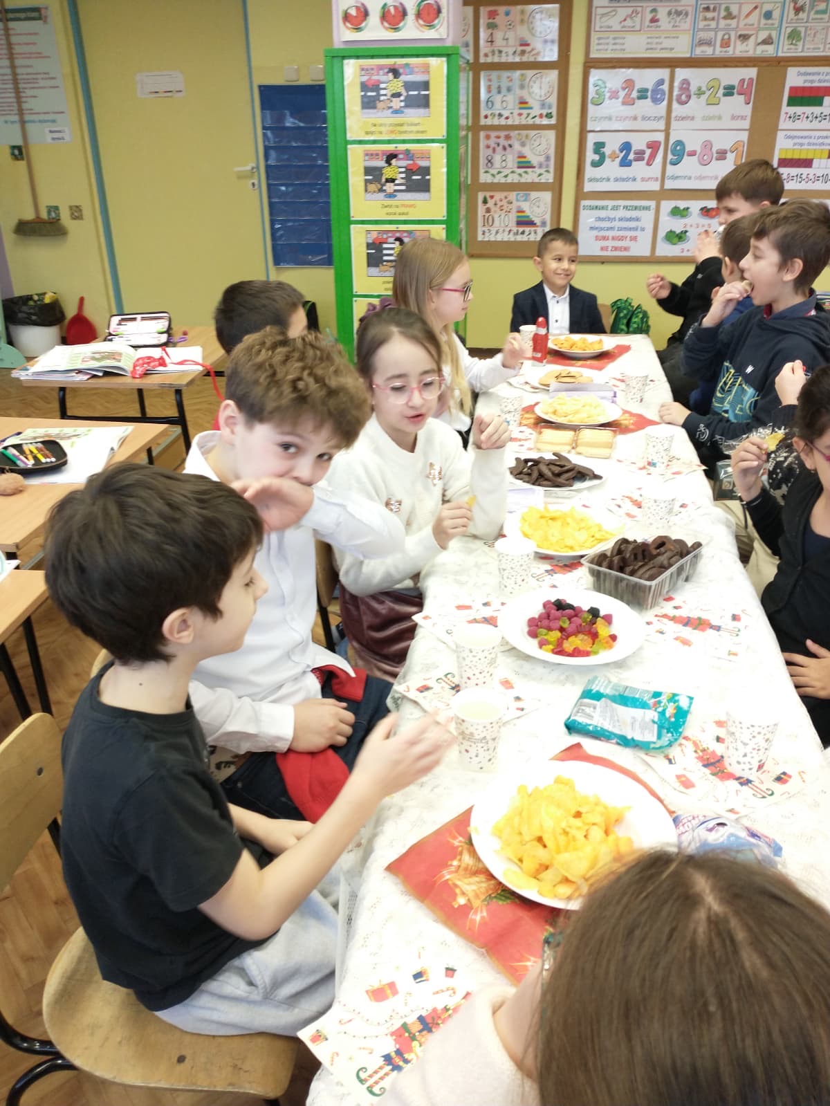 Ważnym elementem tego dnia był wspólny świąteczny obiad. Barszcz czerwony z krokietem oraz pierogi, przygotowane przez Panie z kuchni szkolnej, wprowadziły wszystkich w prawdziwie bożonarodzeniowy nastrój. Podczas tego obiadu Dyrektor Szkoły, Pani Karolina Pietrzyk, oraz Wicedyrektor, Pani Agnieszka Wojtyła-Melson, złożyły uczniom i nauczycielom ciepłe, pełne wzruszeń życzenia świąteczne. Po obiedzie uczniowie i nauczyciele wspólnie śpiewali kolędy, podkreślając radosny i integrujący charakter tego spotkania.