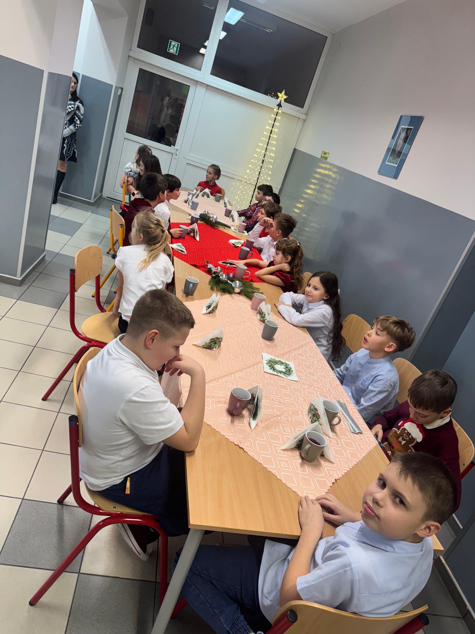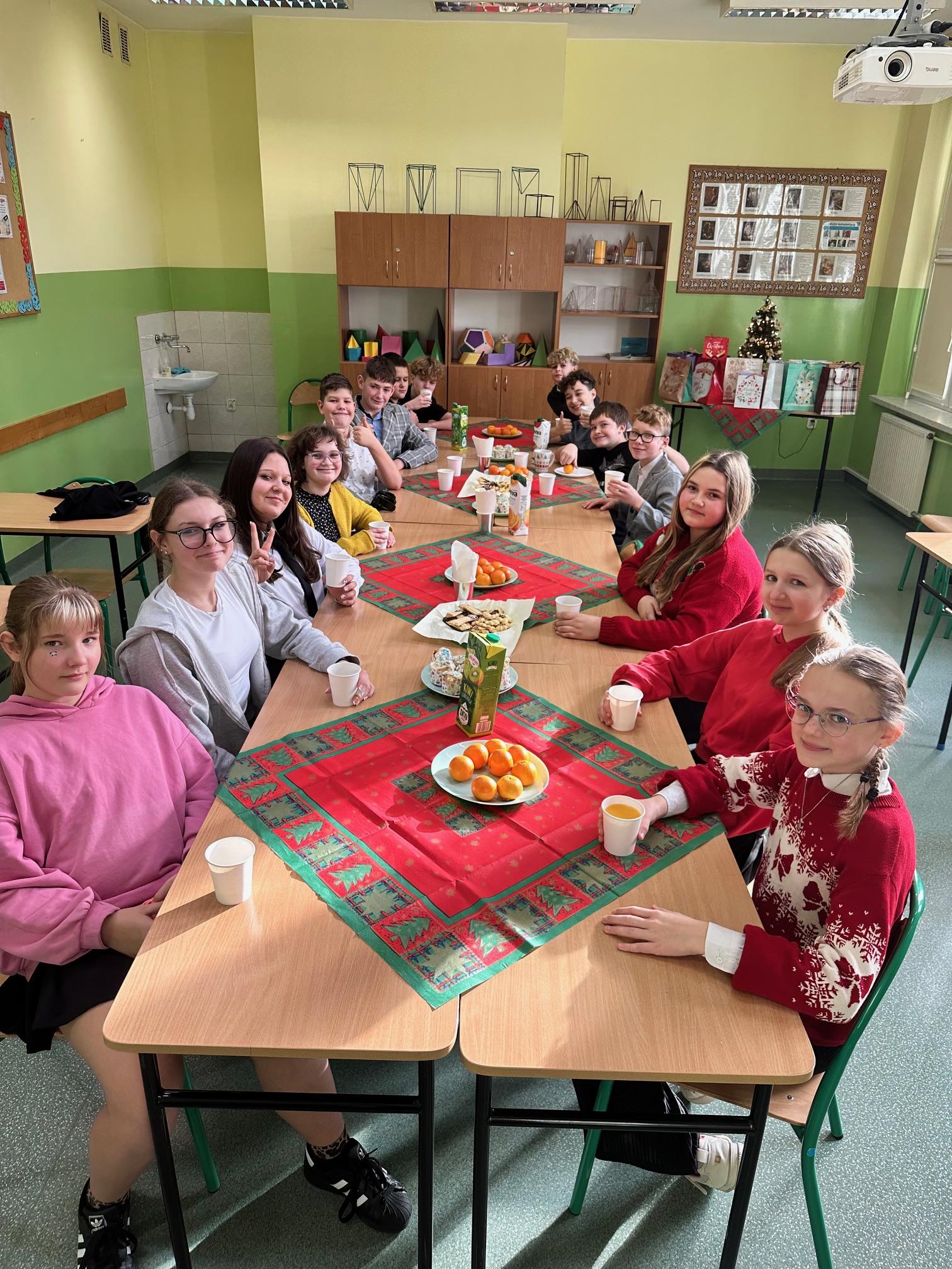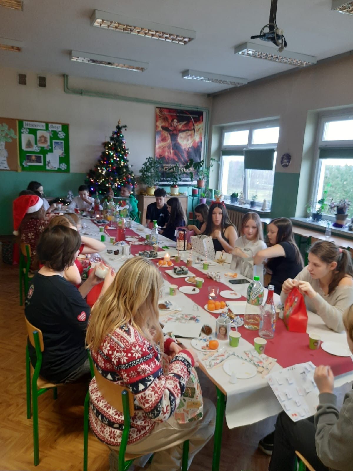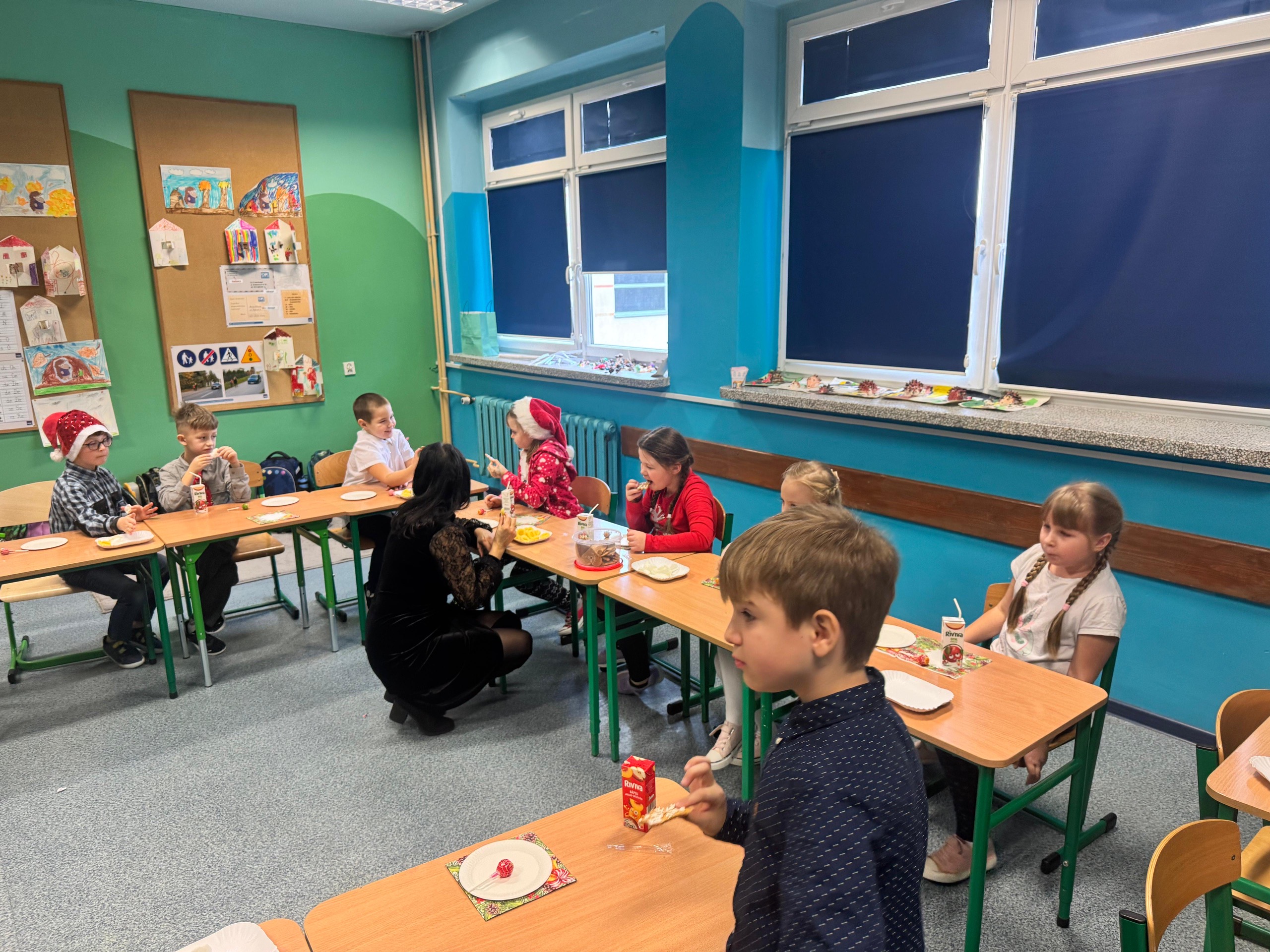 Następnie odbyły się klasowe spotkania bożonarodzeniowe. Dzięki zaangażowaniu rodziców, uczniów oraz nauczycieli sale lekcyjne zostały pięknie udekorowane, a ławki zamieniły się w symboliczne, świąteczne stoły. Uczniowie mieli okazję przełamać się opłatkiem, złożyć sobie życzenia, otrzymać drobne upominki oraz skosztować przygotowanych słodkości. Jednocześnie cała społeczność szkolna włączyła się w akcję „Wigilia bez plastiku”, zorganizowaną przez panią Ilonę Dudyk, dbając o ekologiczny charakter spotkań i rezygnując z jednorazowych plastikowych naczyń oraz dekoracji.