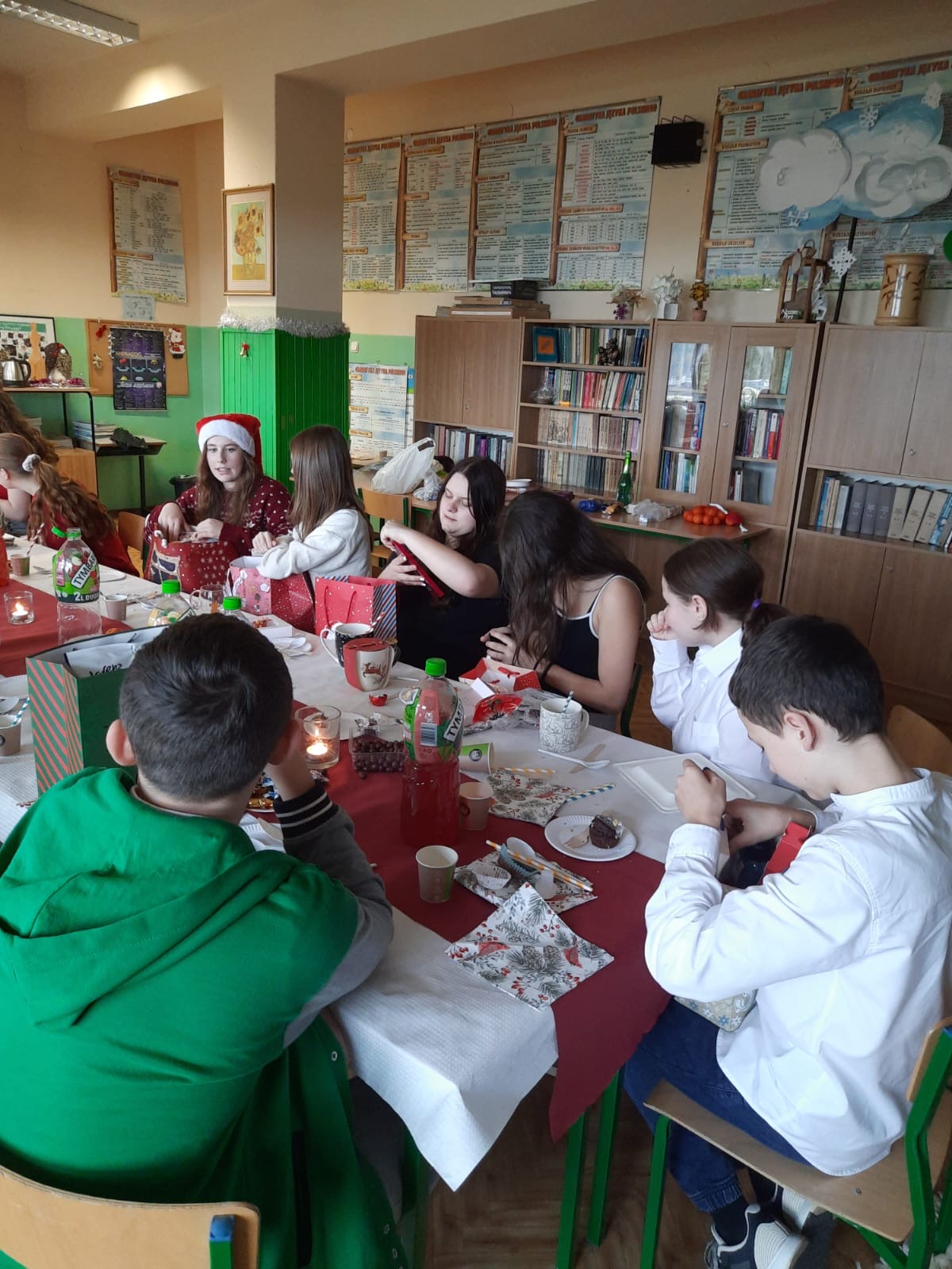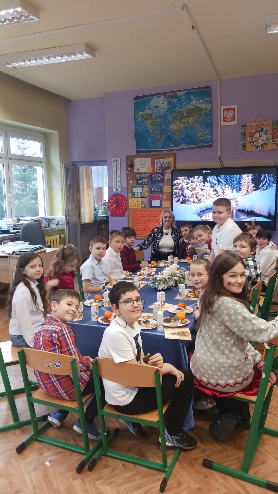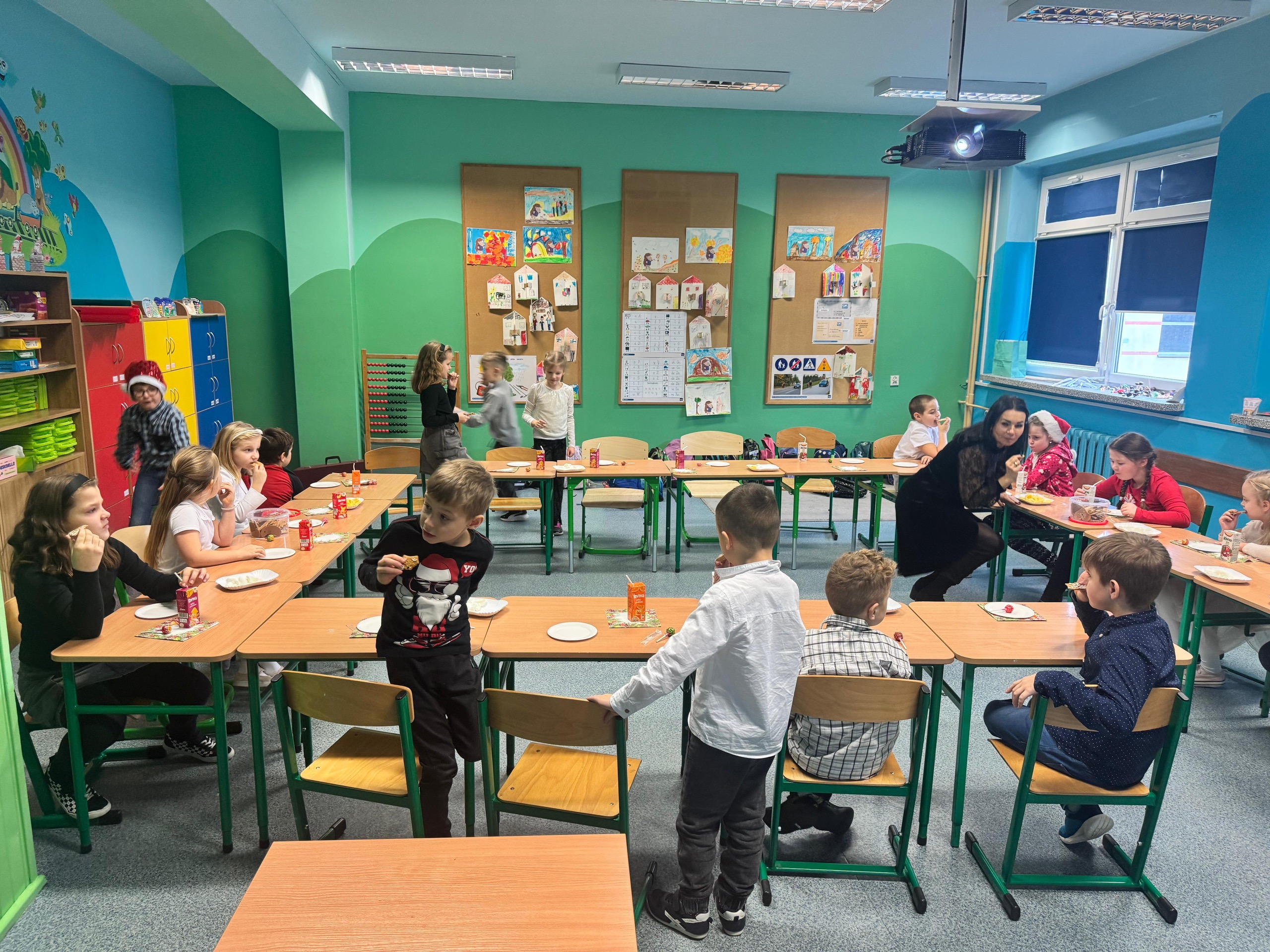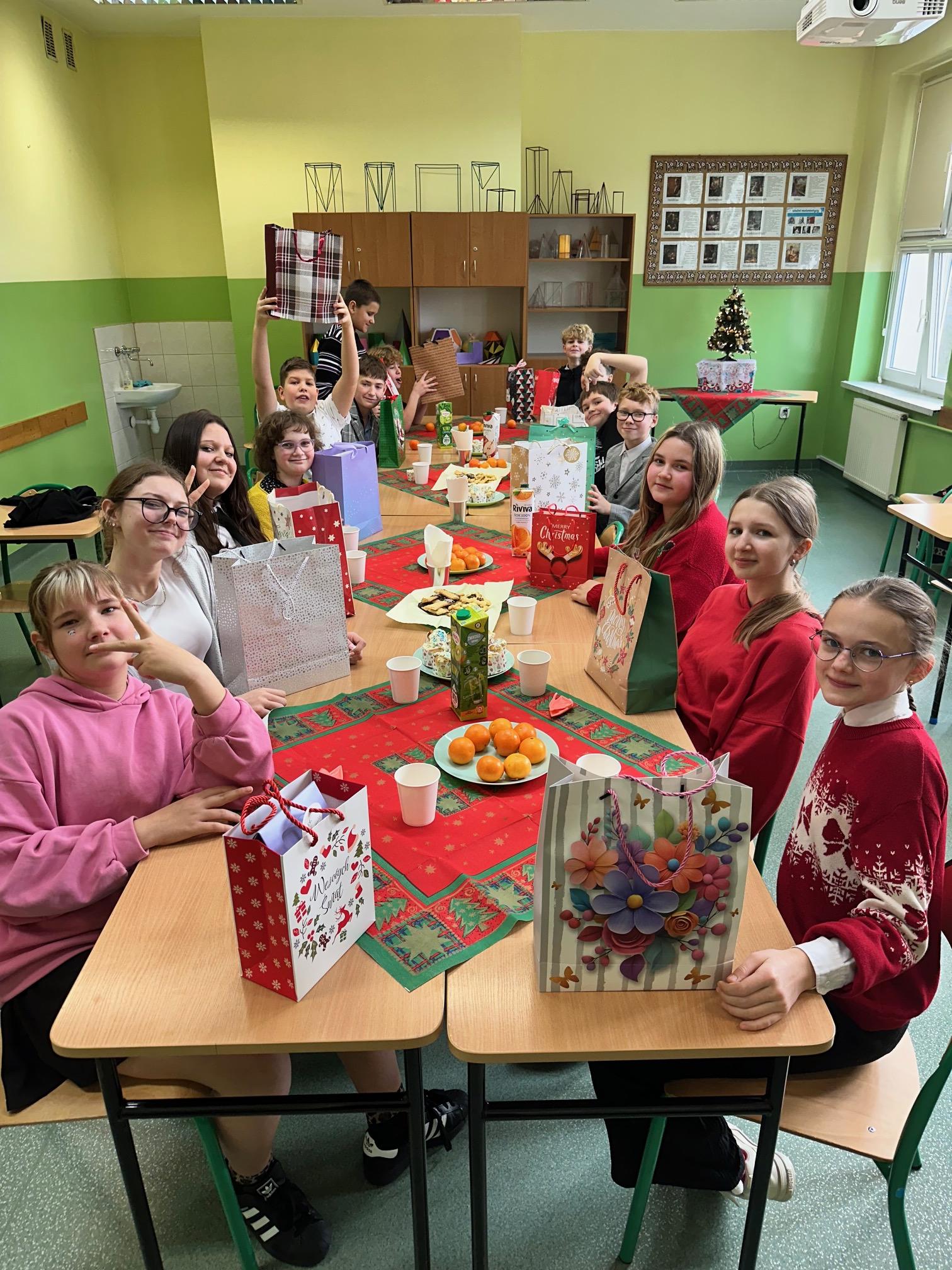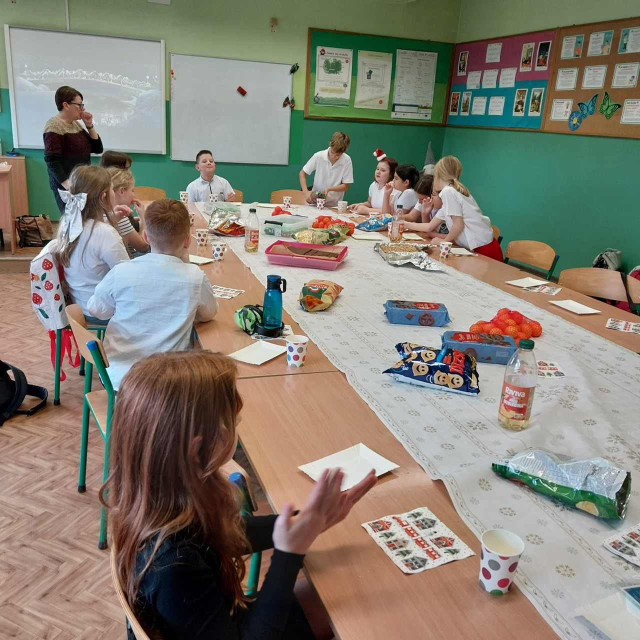 Następnie odbyły się klasowe spotkania bożonarodzeniowe. Dzięki zaangażowaniu rodziców, uczniów oraz nauczycieli sale lekcyjne zostały pięknie udekorowane, a ławki zamieniły się w symboliczne, świąteczne stoły. Uczniowie mieli okazję przełamać się opłatkiem, złożyć sobie życzenia, otrzymać drobne upominki oraz skosztować przygotowanych słodkości. Jednocześnie cała społeczność szkolna włączyła się w akcję „Wigilia bez plastiku”, zorganizowaną przez panią Ilonę Dudyk, dbając o ekologiczny charakter spotkań i rezygnując z jednorazowych plastikowych naczyń oraz dekoracji.