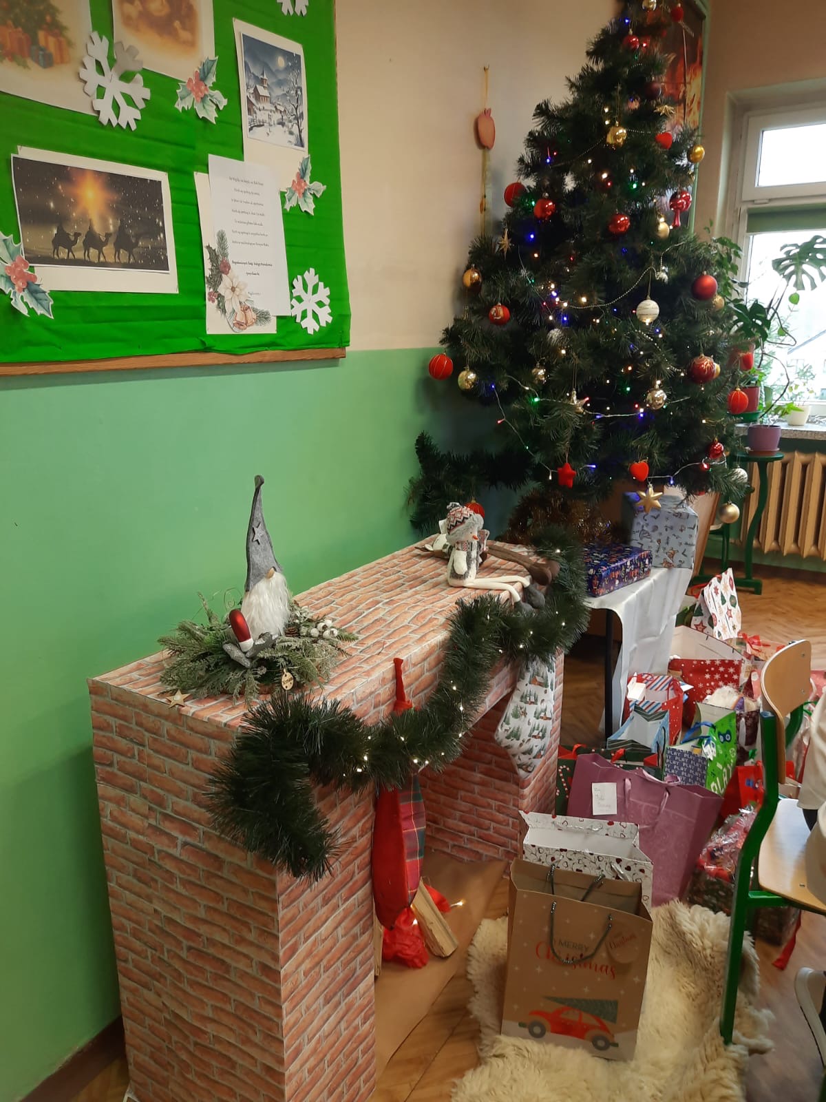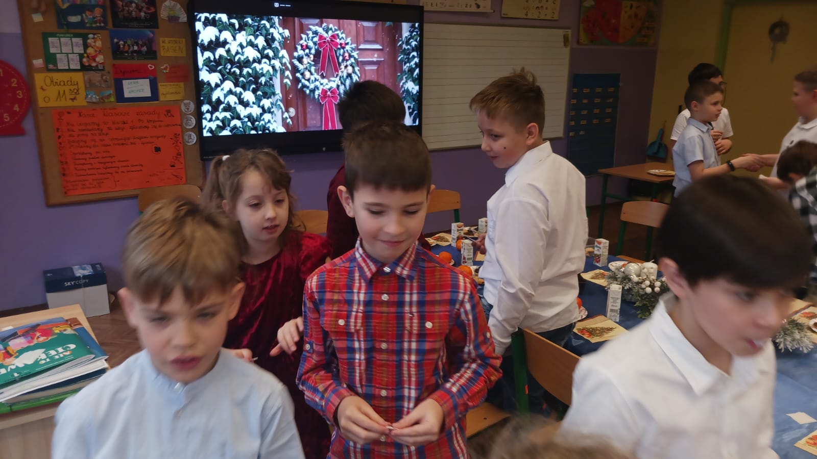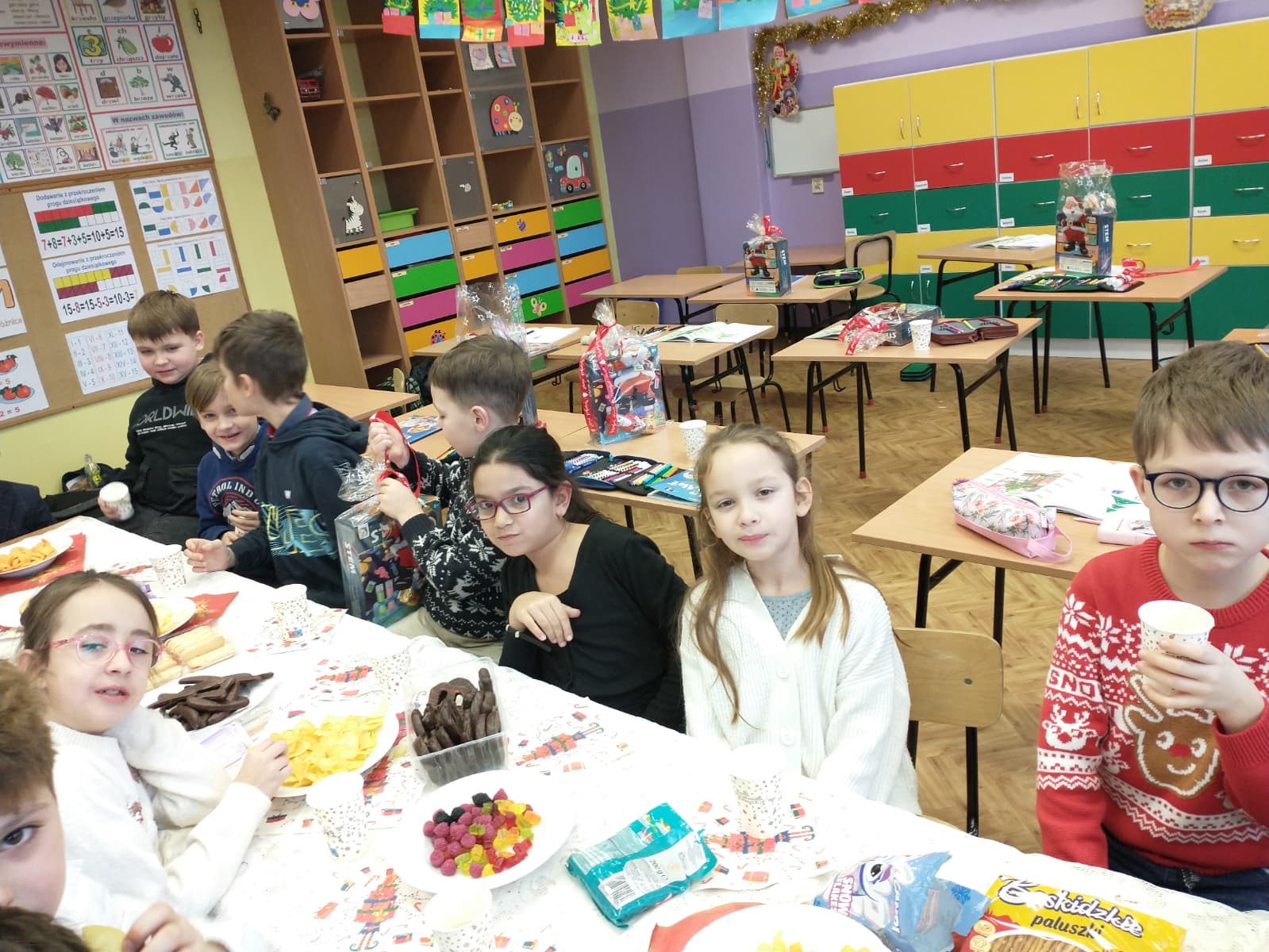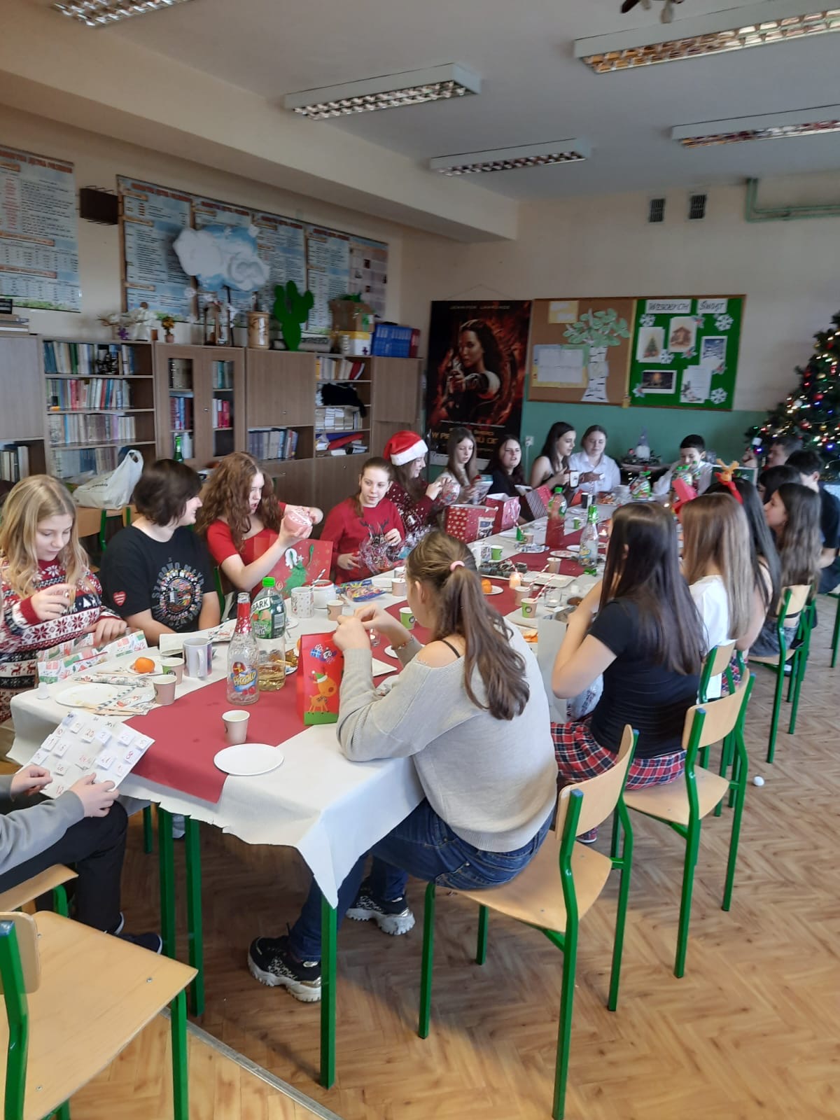 Następnie odbyły się klasowe spotkania bożonarodzeniowe. Dzięki zaangażowaniu rodziców, uczniów oraz nauczycieli sale lekcyjne zostały pięknie udekorowane, a ławki zamieniły się w symboliczne, świąteczne stoły. Uczniowie mieli okazję przełamać się opłatkiem, złożyć sobie życzenia, otrzymać drobne upominki oraz skosztować przygotowanych słodkości. Jednocześnie cała społeczność szkolna włączyła się w akcję „Wigilia bez plastiku”, zorganizowaną przez panią Ilonę Dudyk, dbając o ekologiczny charakter spotkań i rezygnując z jednorazowych plastikowych naczyń oraz dekoracji.