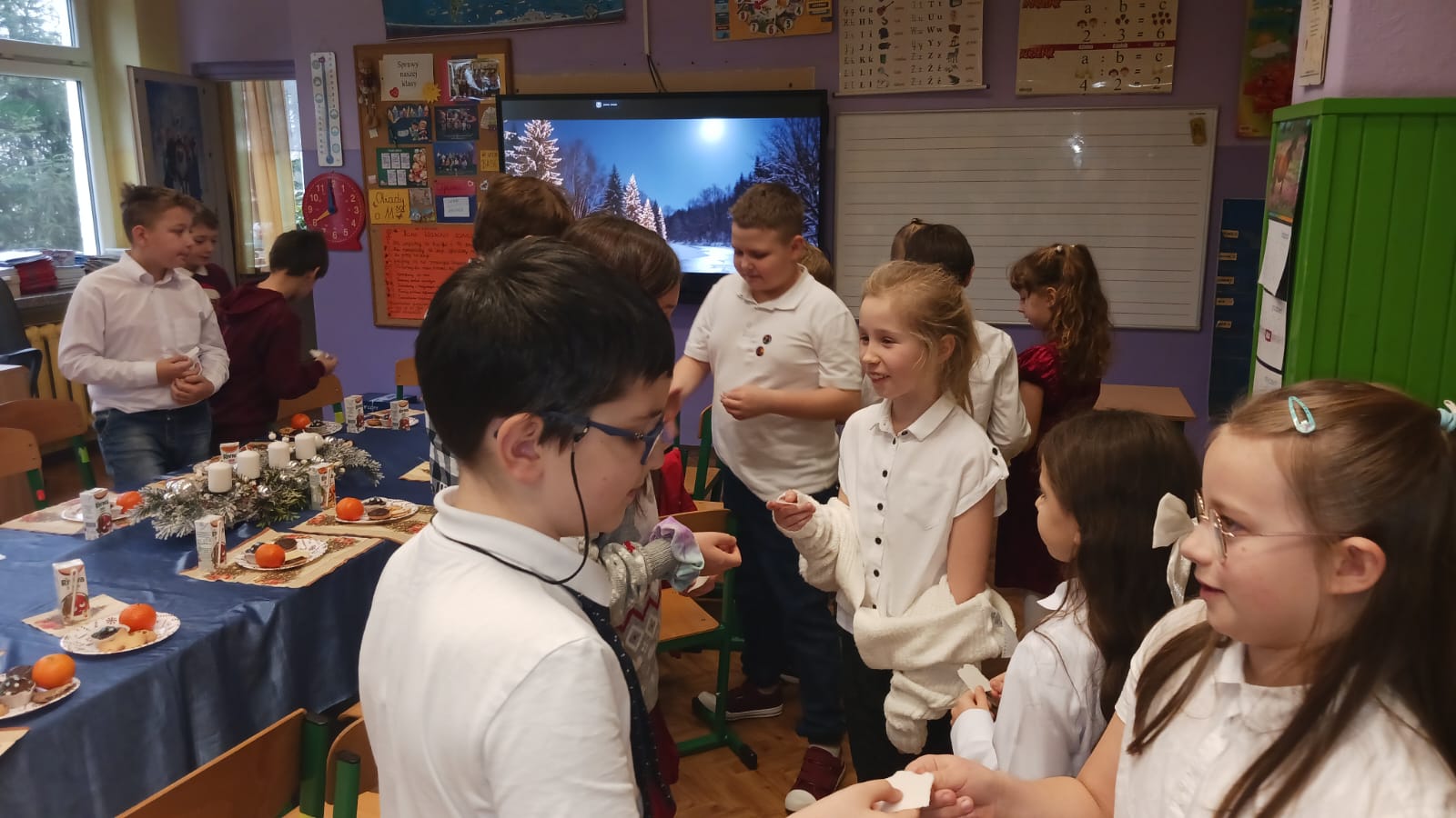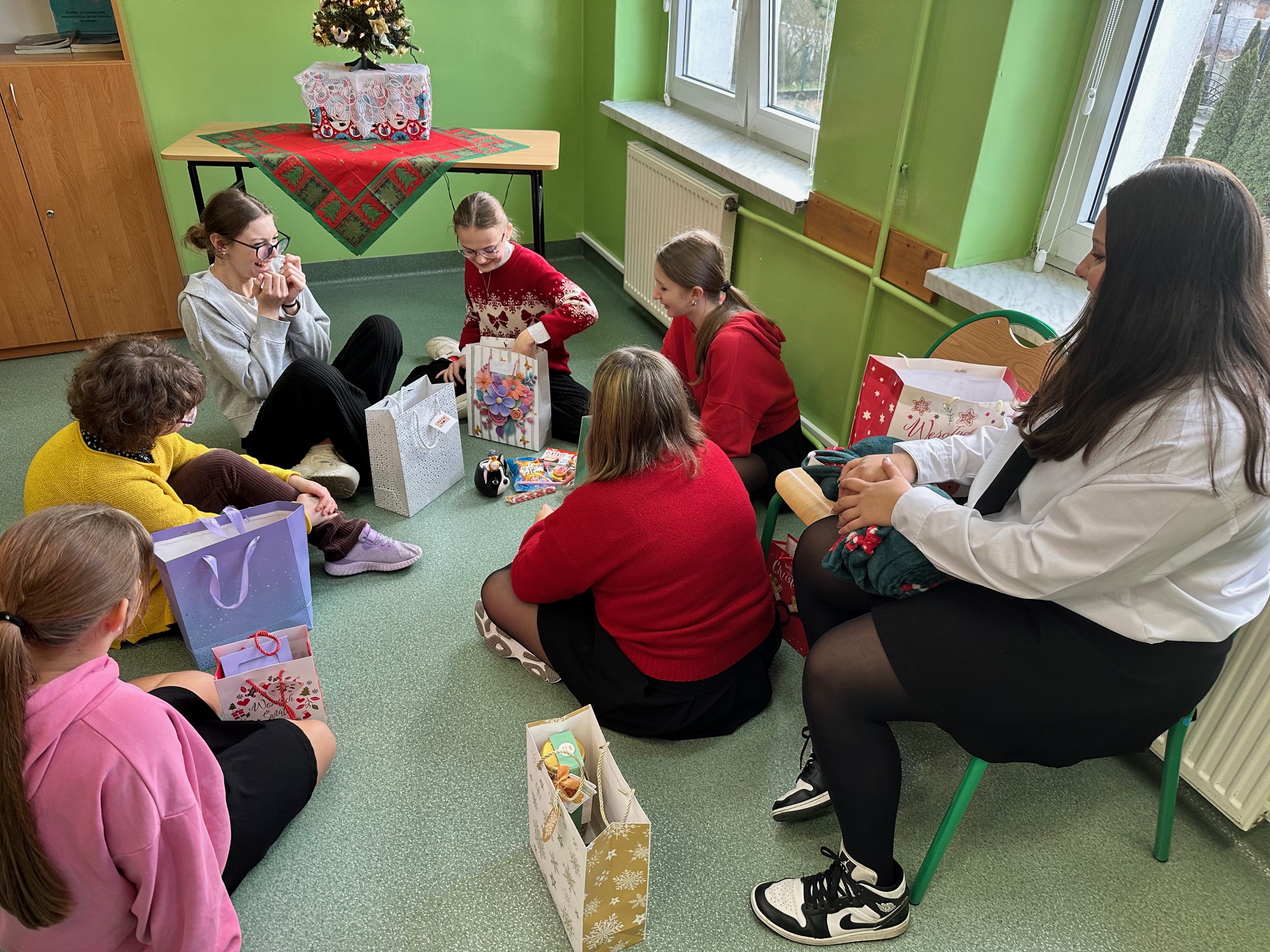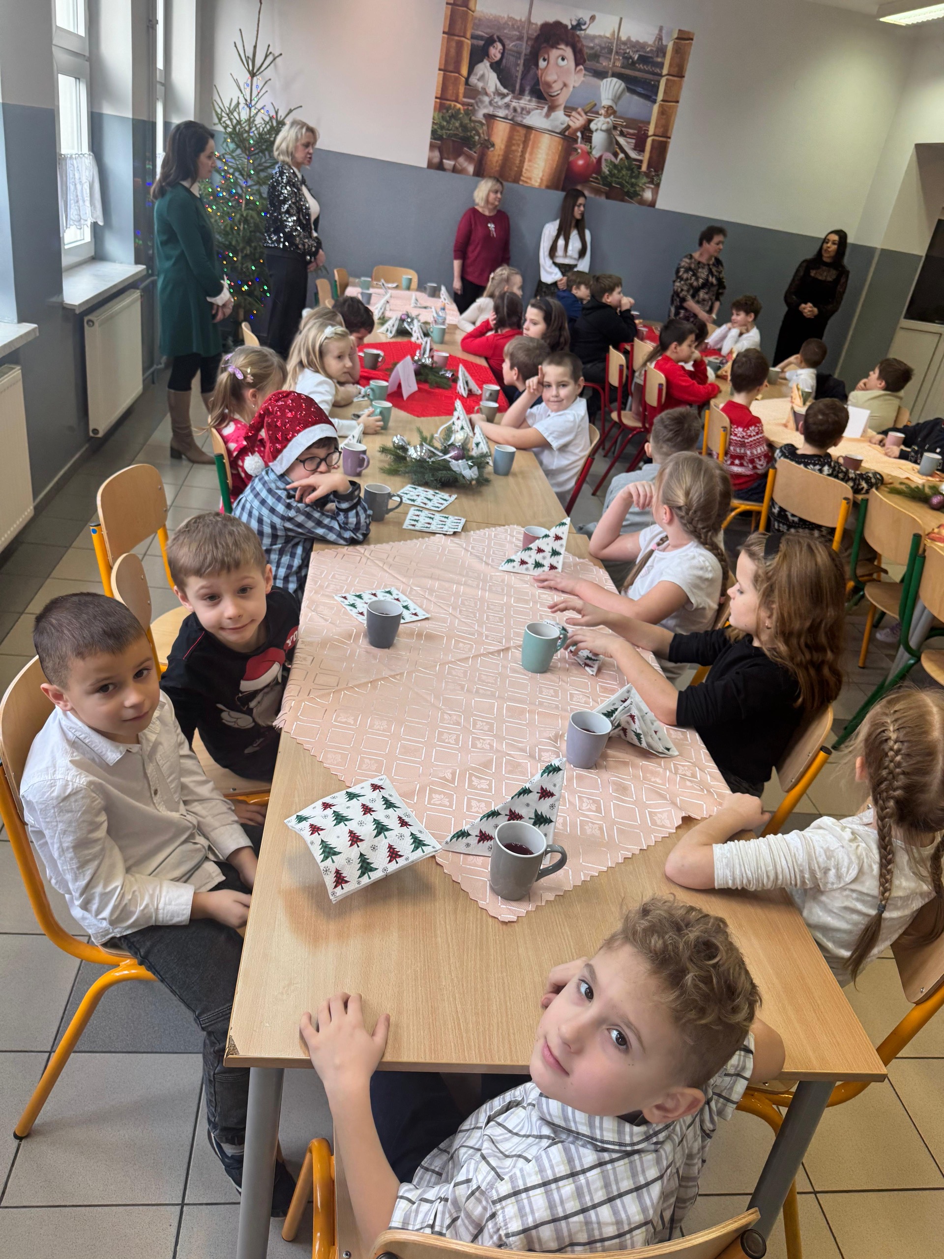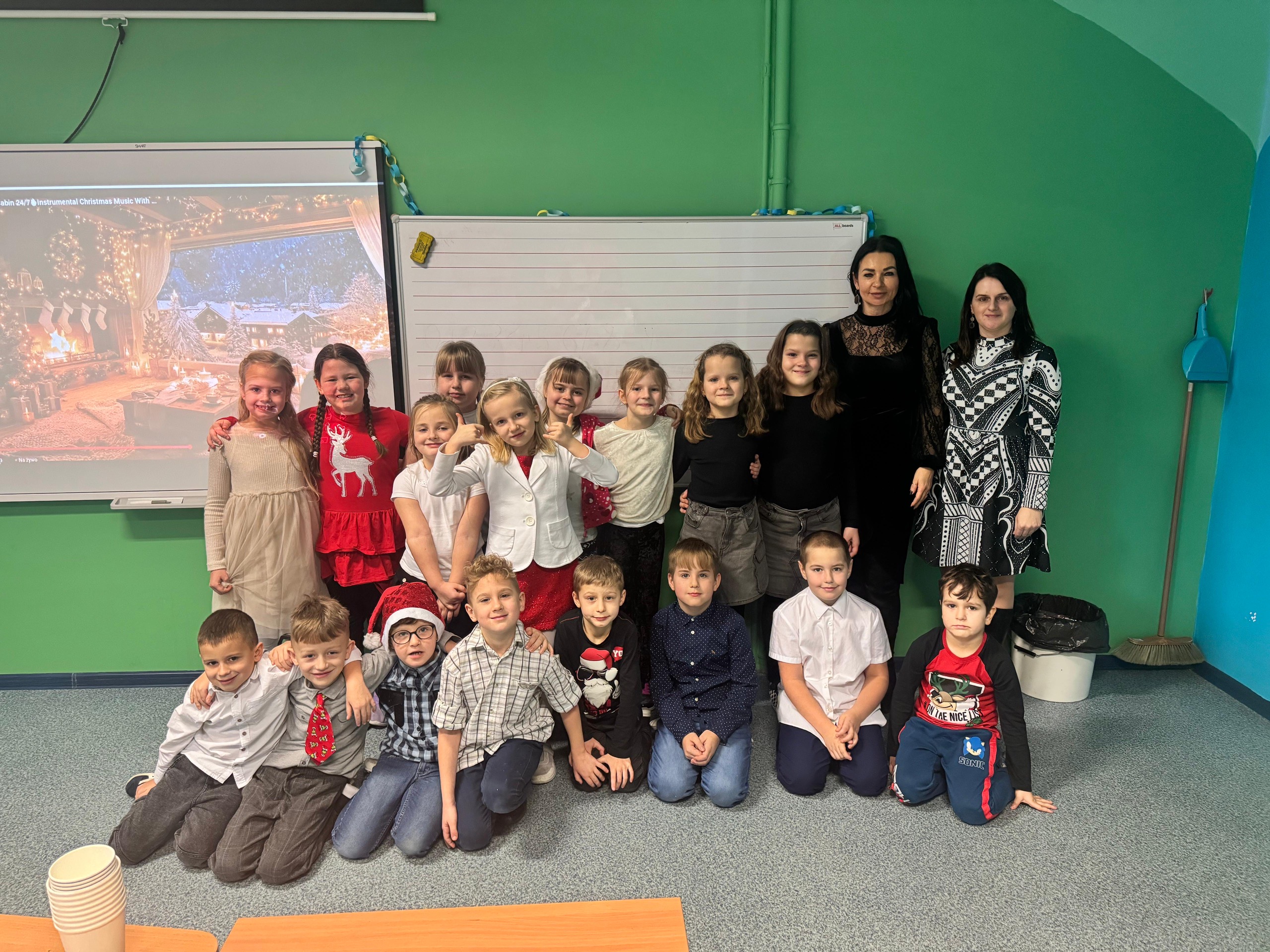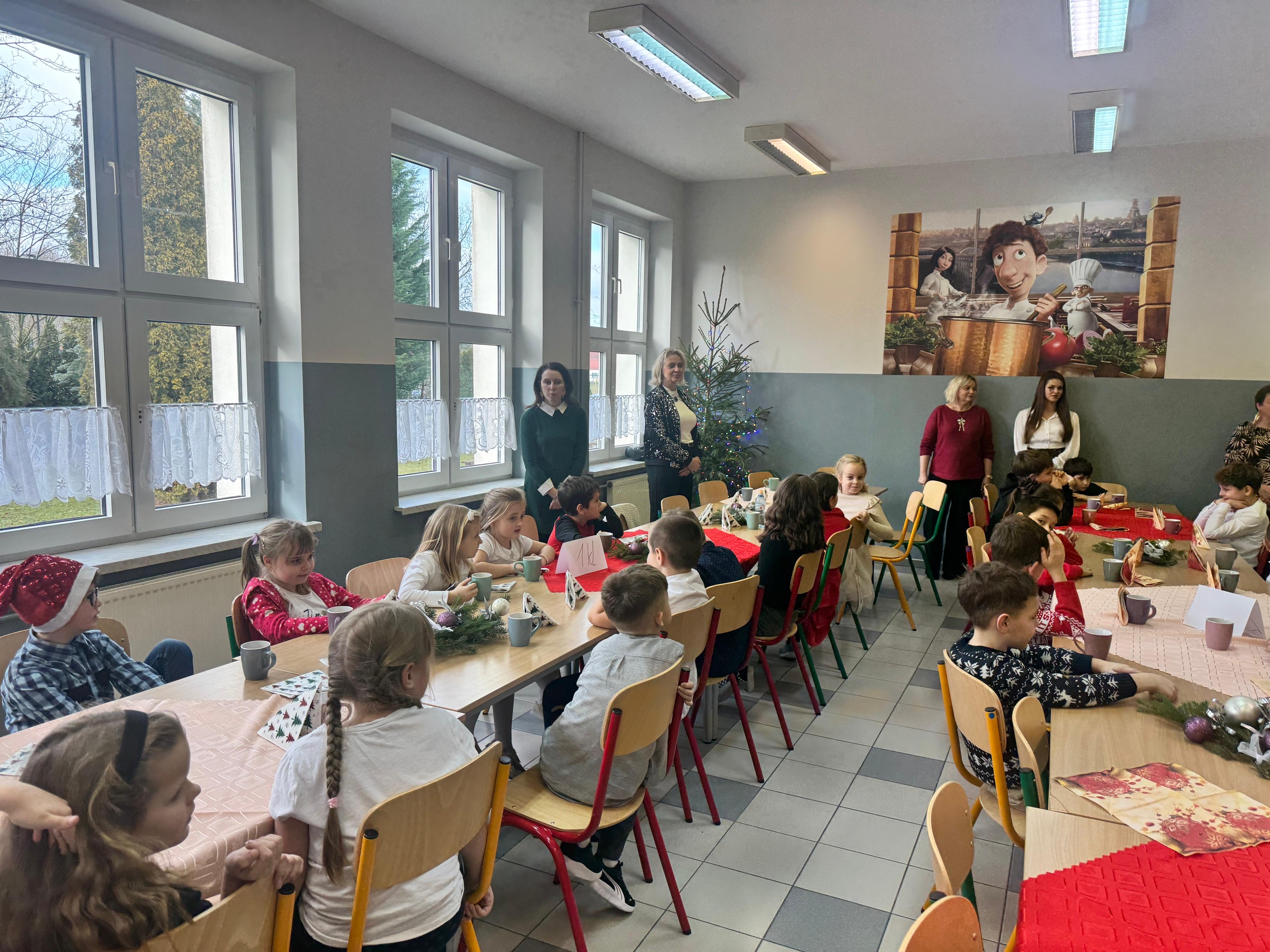 Następnie odbyły się klasowe spotkania bożonarodzeniowe. Dzięki zaangażowaniu rodziców, uczniów oraz nauczycieli sale lekcyjne zostały pięknie udekorowane, a ławki zamieniły się w symboliczne, świąteczne stoły. Uczniowie mieli okazję przełamać się opłatkiem, złożyć sobie życzenia, otrzymać drobne upominki oraz skosztować przygotowanych słodkości. Jednocześnie cała społeczność szkolna włączyła się w akcję „Wigilia bez plastiku”, zorganizowaną przez panią Ilonę Dudyk, dbając o ekologiczny charakter spotkań i rezygnując z jednorazowych plastikowych naczyń oraz dekoracji.