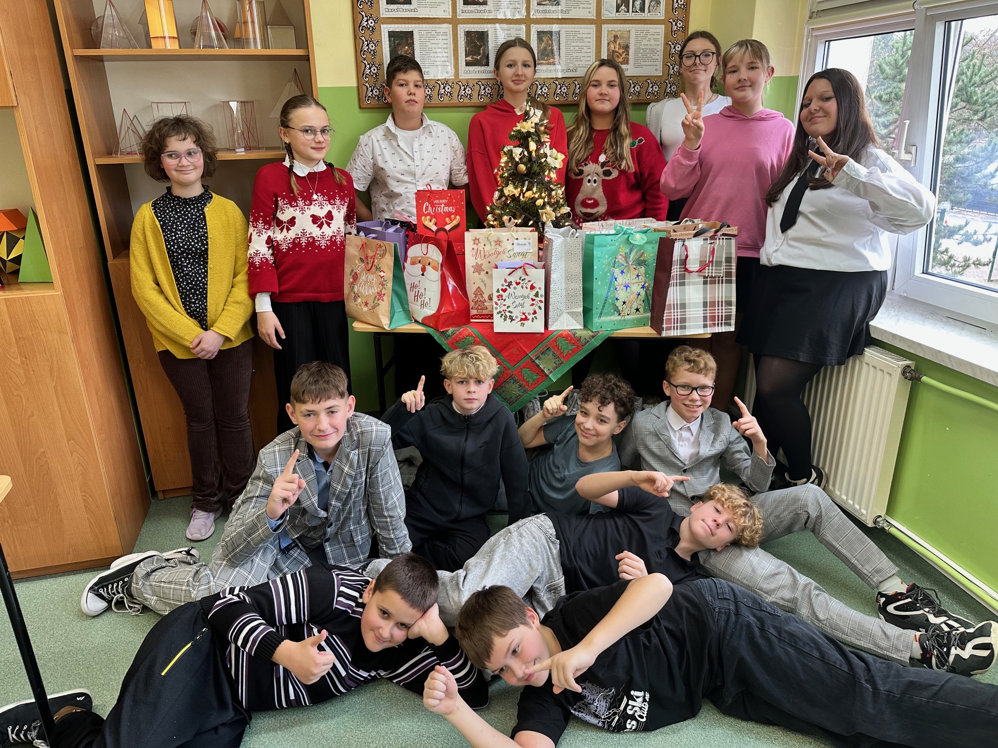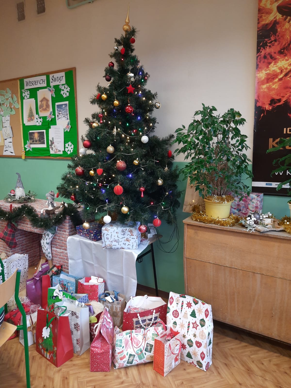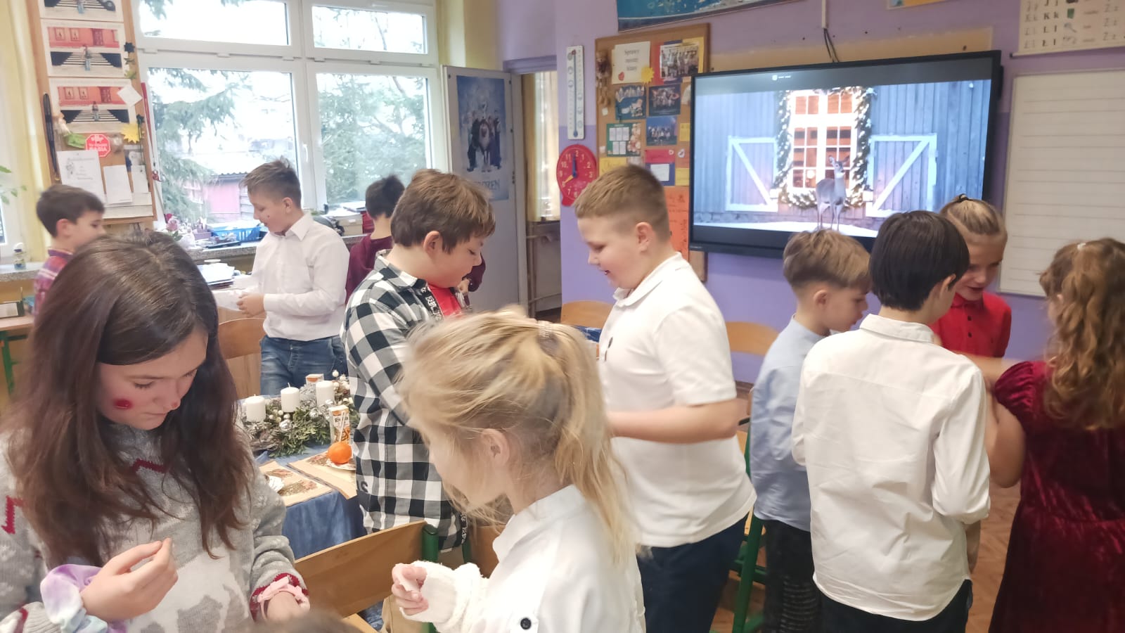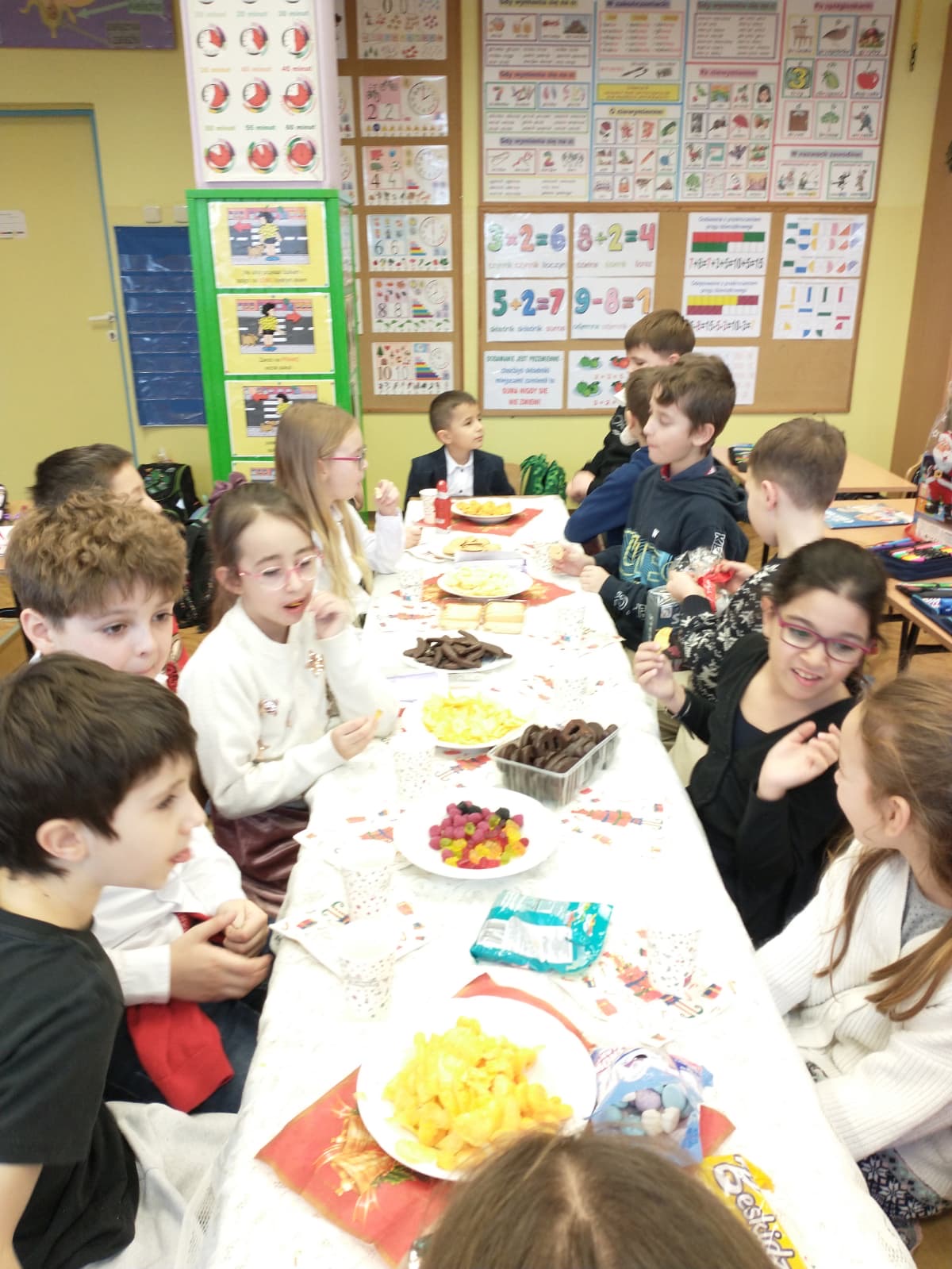 Następnie odbyły się klasowe spotkania bożonarodzeniowe. Dzięki zaangażowaniu rodziców, uczniów oraz nauczycieli sale lekcyjne zostały pięknie udekorowane, a ławki zamieniły się w symboliczne, świąteczne stoły. Uczniowie mieli okazję przełamać się opłatkiem, złożyć sobie życzenia, otrzymać drobne upominki oraz skosztować przygotowanych słodkości. Jednocześnie cała społeczność szkolna włączyła się w akcję „Wigilia bez plastiku”, zorganizowaną przez panią Ilonę Dudyk, dbając o ekologiczny charakter spotkań i rezygnując z jednorazowych plastikowych naczyń oraz dekoracji.