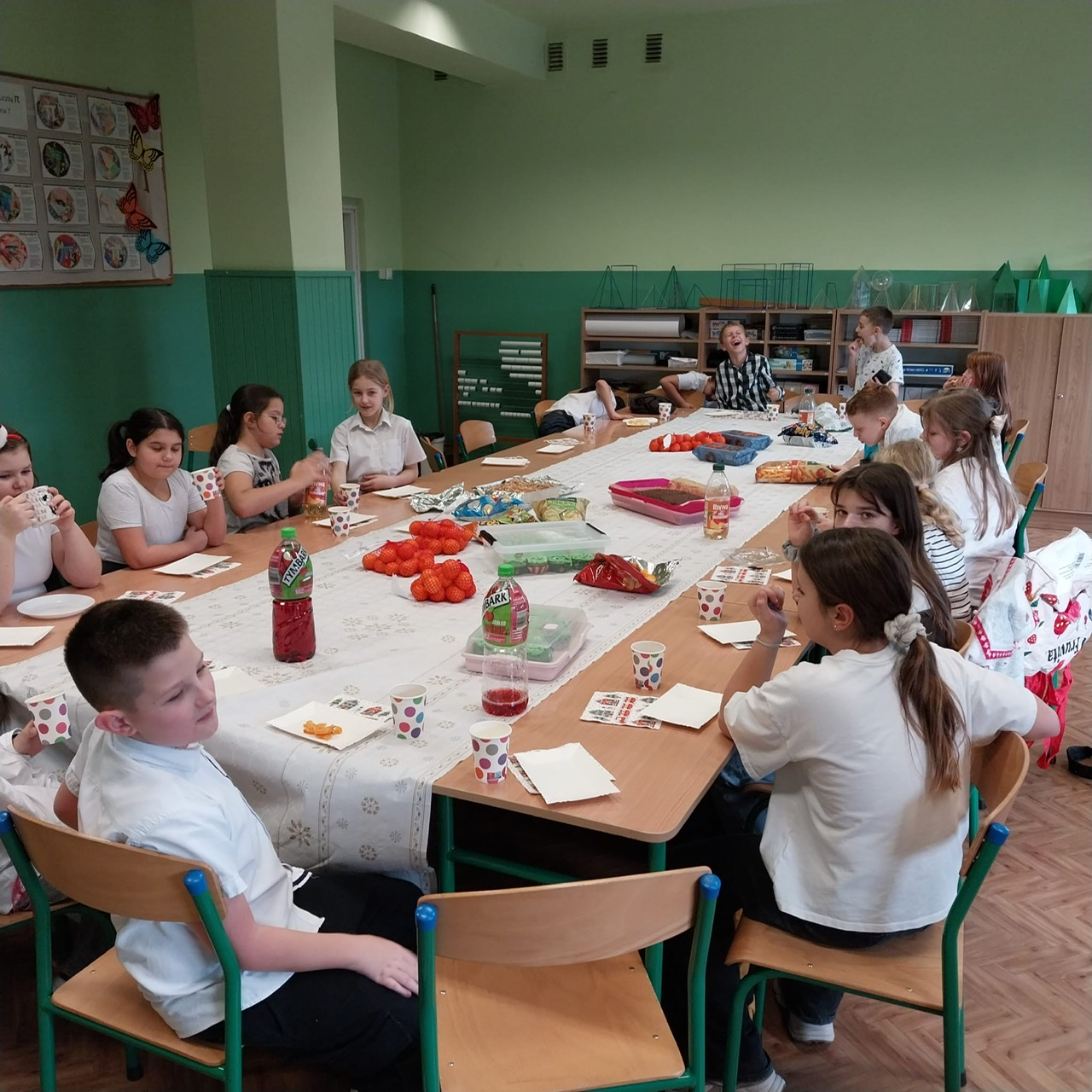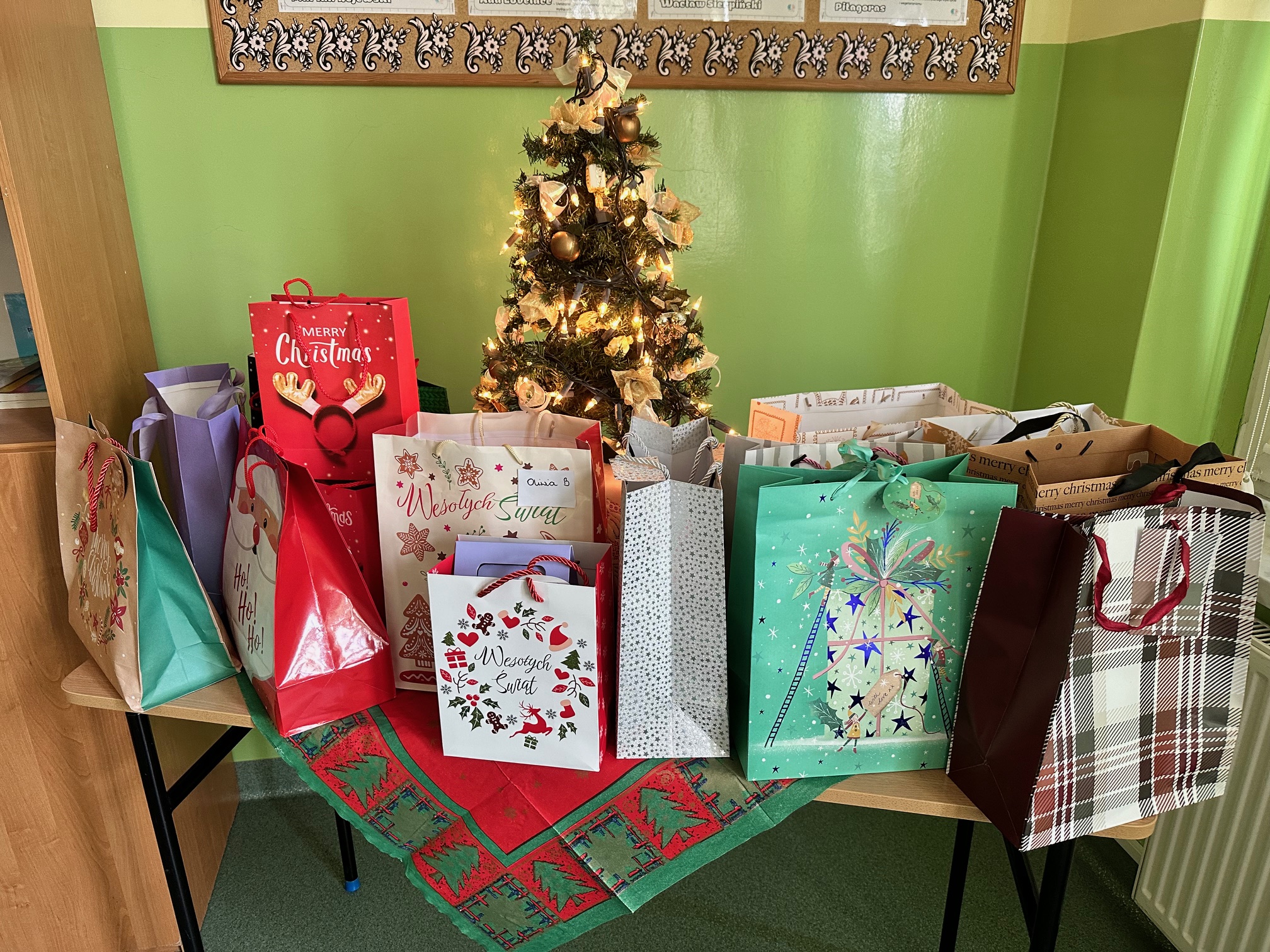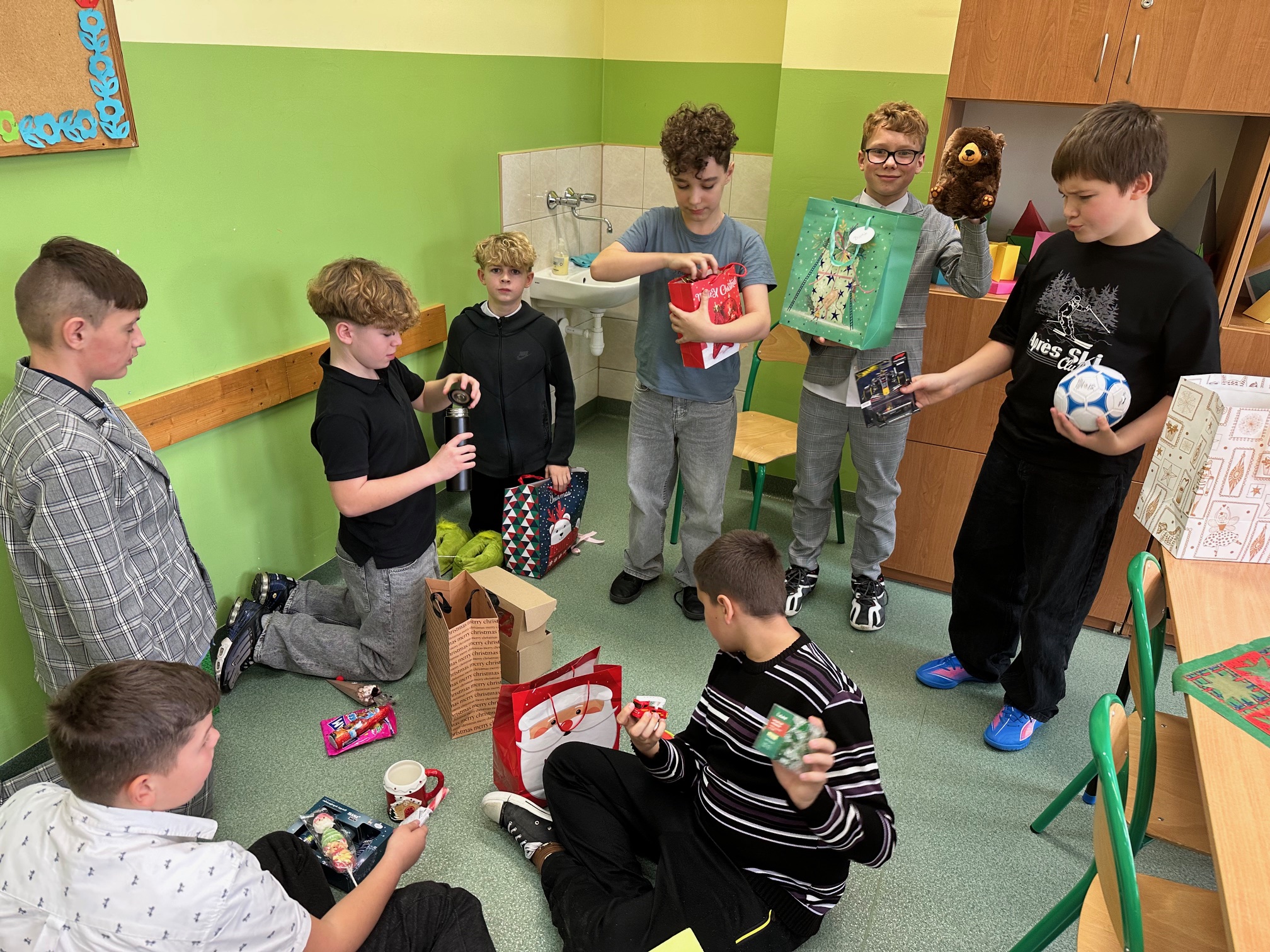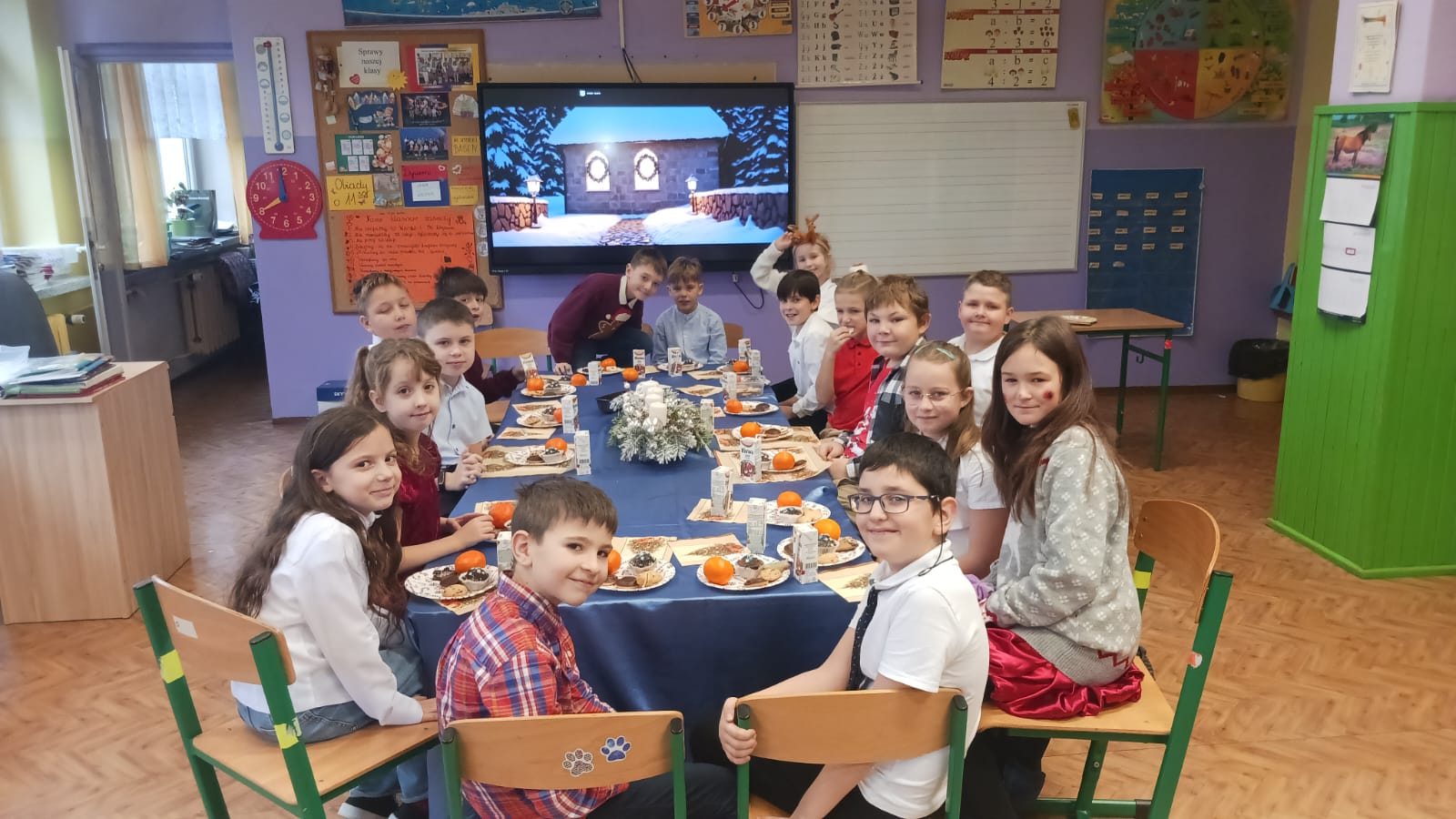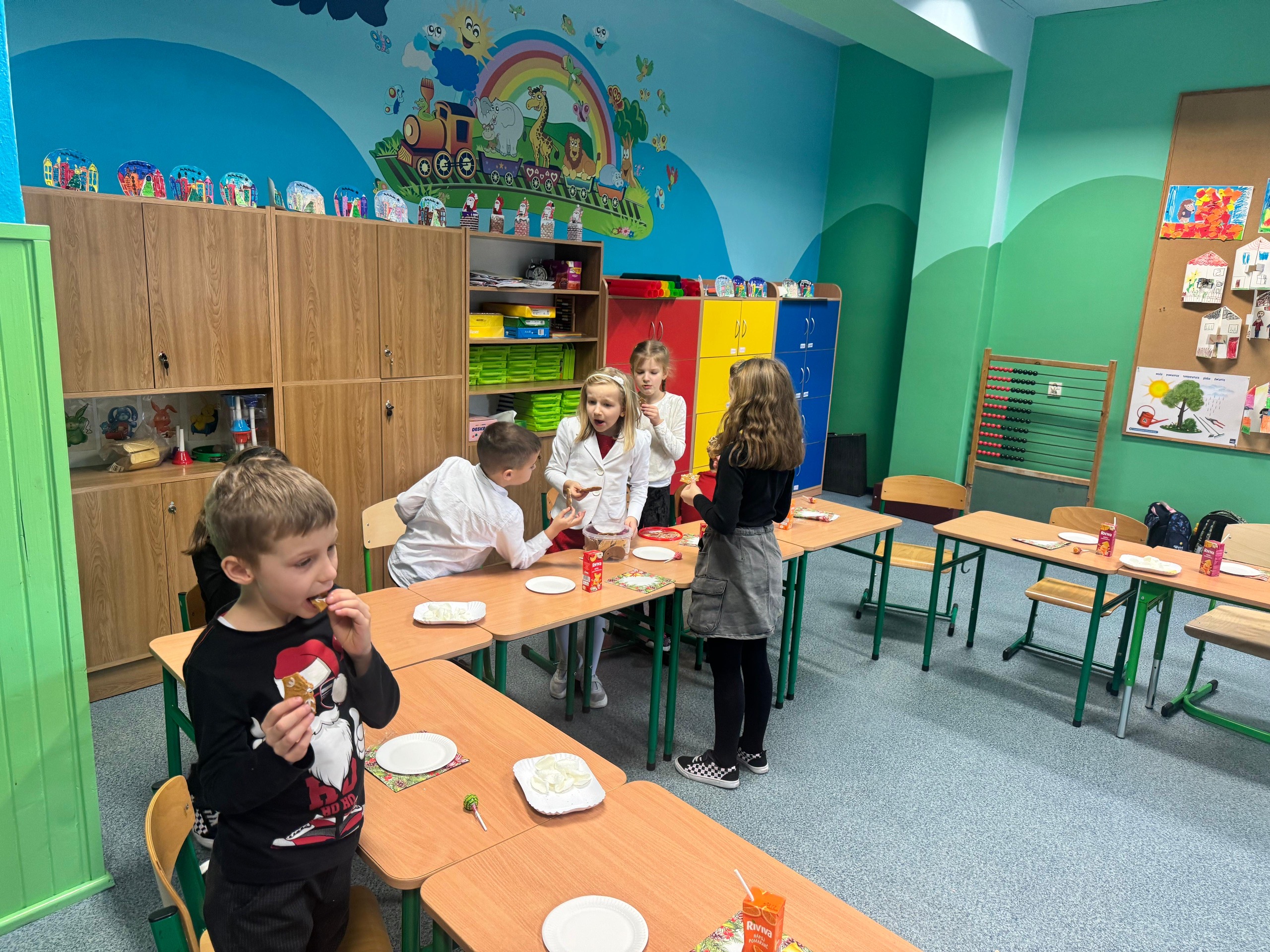 Następnie odbyły się klasowe spotkania bożonarodzeniowe. Dzięki zaangażowaniu rodziców, uczniów oraz nauczycieli sale lekcyjne zostały pięknie udekorowane, a ławki zamieniły się w symboliczne, świąteczne stoły. Uczniowie mieli okazję przełamać się opłatkiem, złożyć sobie życzenia, otrzymać drobne upominki oraz skosztować przygotowanych słodkości. Jednocześnie cała społeczność szkolna włączyła się w akcję „Wigilia bez plastiku”, zorganizowaną przez panią Ilonę Dudyk, dbając o ekologiczny charakter spotkań i rezygnując z jednorazowych plastikowych naczyń oraz dekoracji.