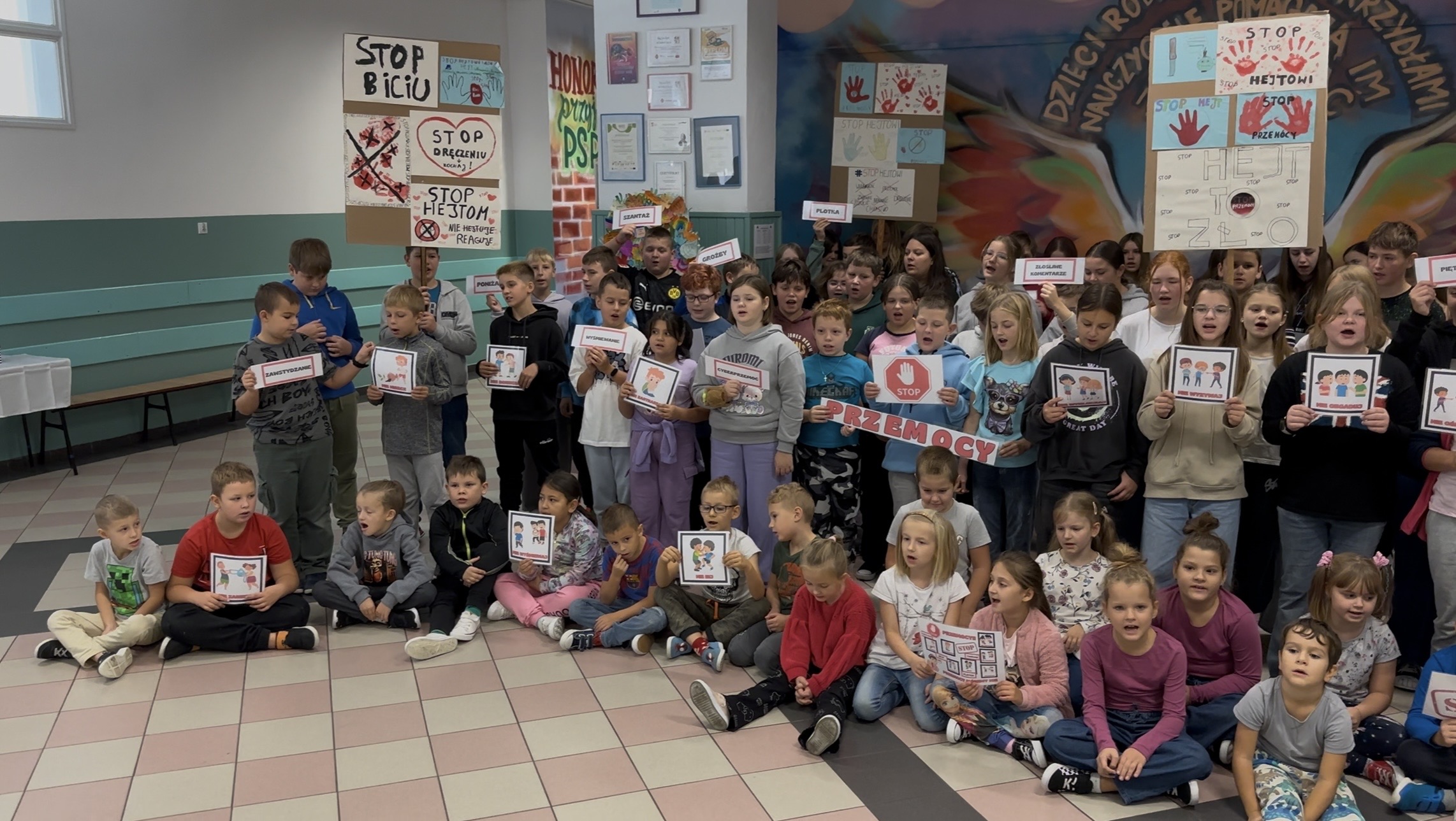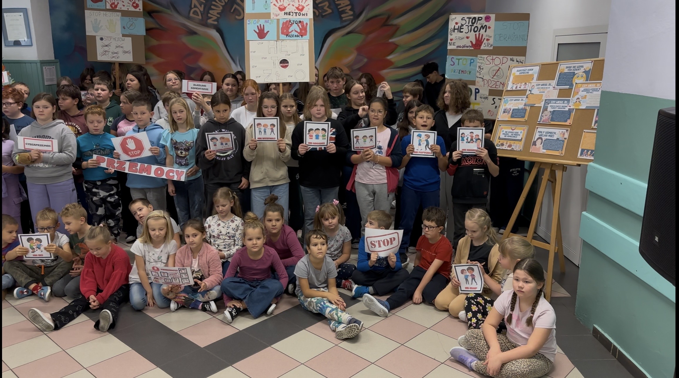 Zwieńczeniem całego tygodnia było wspólne odśpiewanie piosenki „Stop przemocy” w dniu 3 października. Cała społeczność szkolna zgromadziła się na holu przy skrzydłach, aby wyrazić swoje zaangażowanie w tworzenie bezpiecznej i przyjaznej szkoły. Piosenka "Stop przemocy" w wykonaniu naszych uczniów https://youtu.be/-543twwpSyI?si=FphOrVw3nzB9eQ8