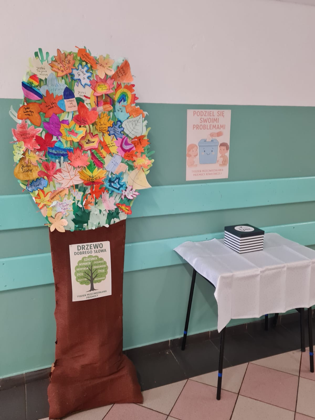 30 września obchodziliśmy Dzień Dobrego Słowa. Każdy uczeń losował imię kolegi lub koleżanki i miał za zadanie powiedzieć tej osobie coś miłego. W holu szkoły ustawione zostało „Drzewo Dobrego Słowa”, na którym zawisły przygotowane przez uczniów liście z życzliwymi hasłami. Dodatkowo uruchomiona została „Skrzynka Zaufania”, gdzie uczniowie mogą anonimowo zgłaszać swoje problemy i prosić o wsparcie.