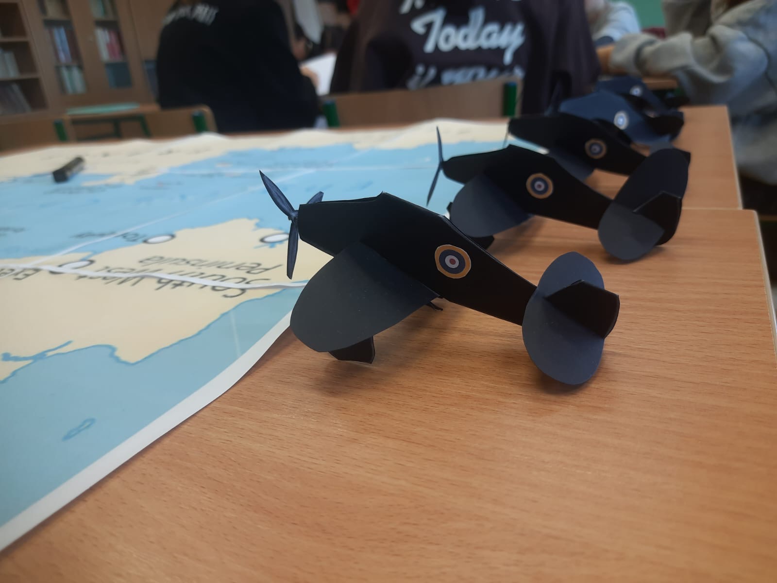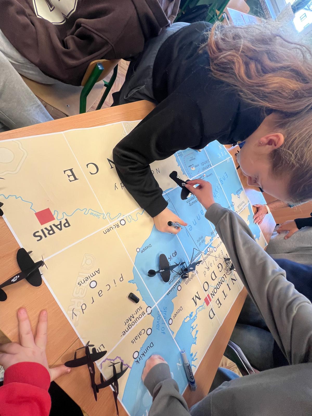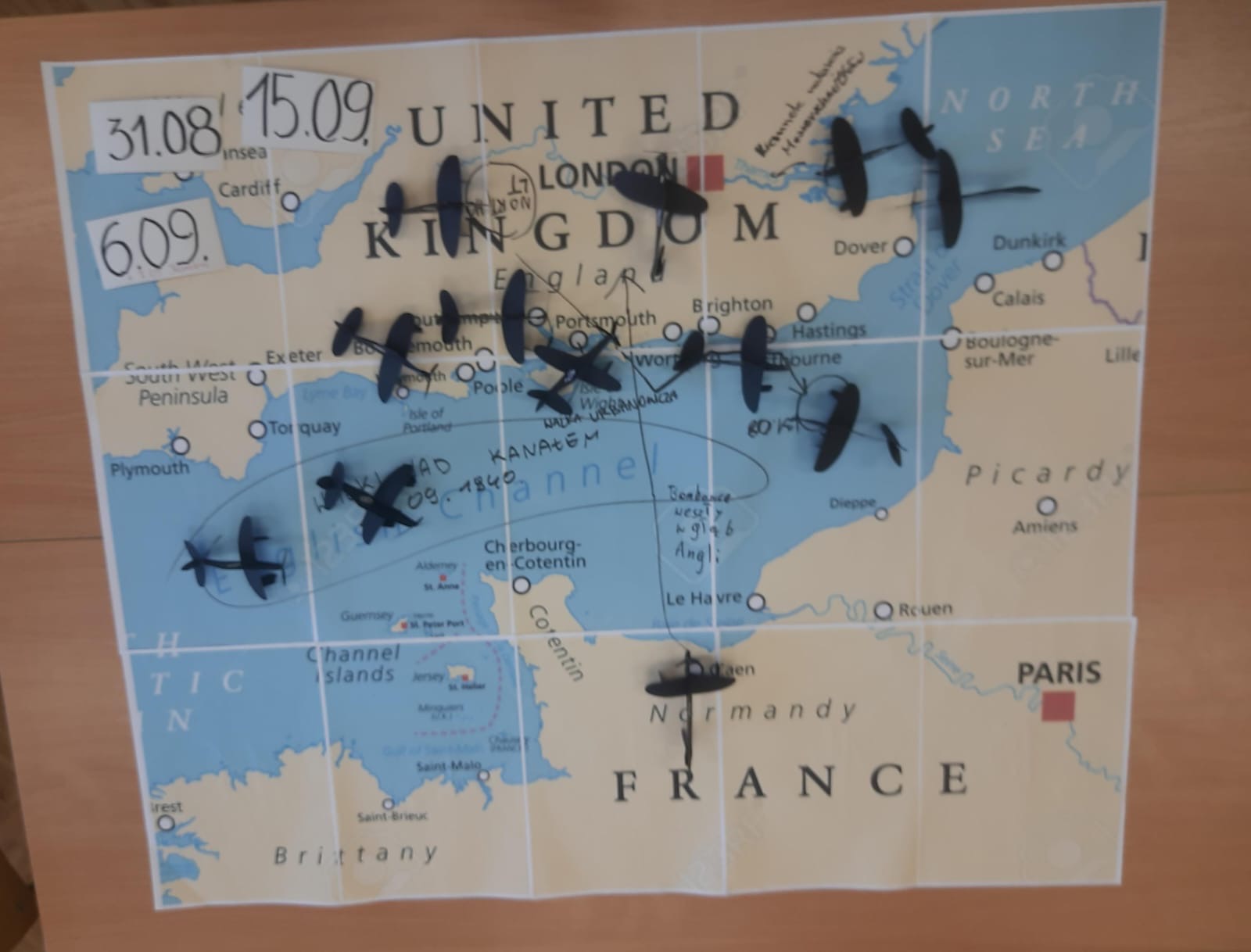Najważniejszym elementem zajęć była interaktywna gra dydaktyczna. Uczniowie, pracując na dużej mapie przedstawiającej przestrzeń działań powietrznych, samodzielnie przesuwali modele samolotów: angielskie Supermarine Spitfire służące w RAF oraz niemieckie Messerschmitty Bf 109 z Luftwaffe. Na podstawie opisów i wydarzeń z lektury odtwarzali przebieg walk powietrznych, ucząc się taktyki, znaczenia decyzji pilotów oraz tego, jak wyglądały starcia w powietrzu.