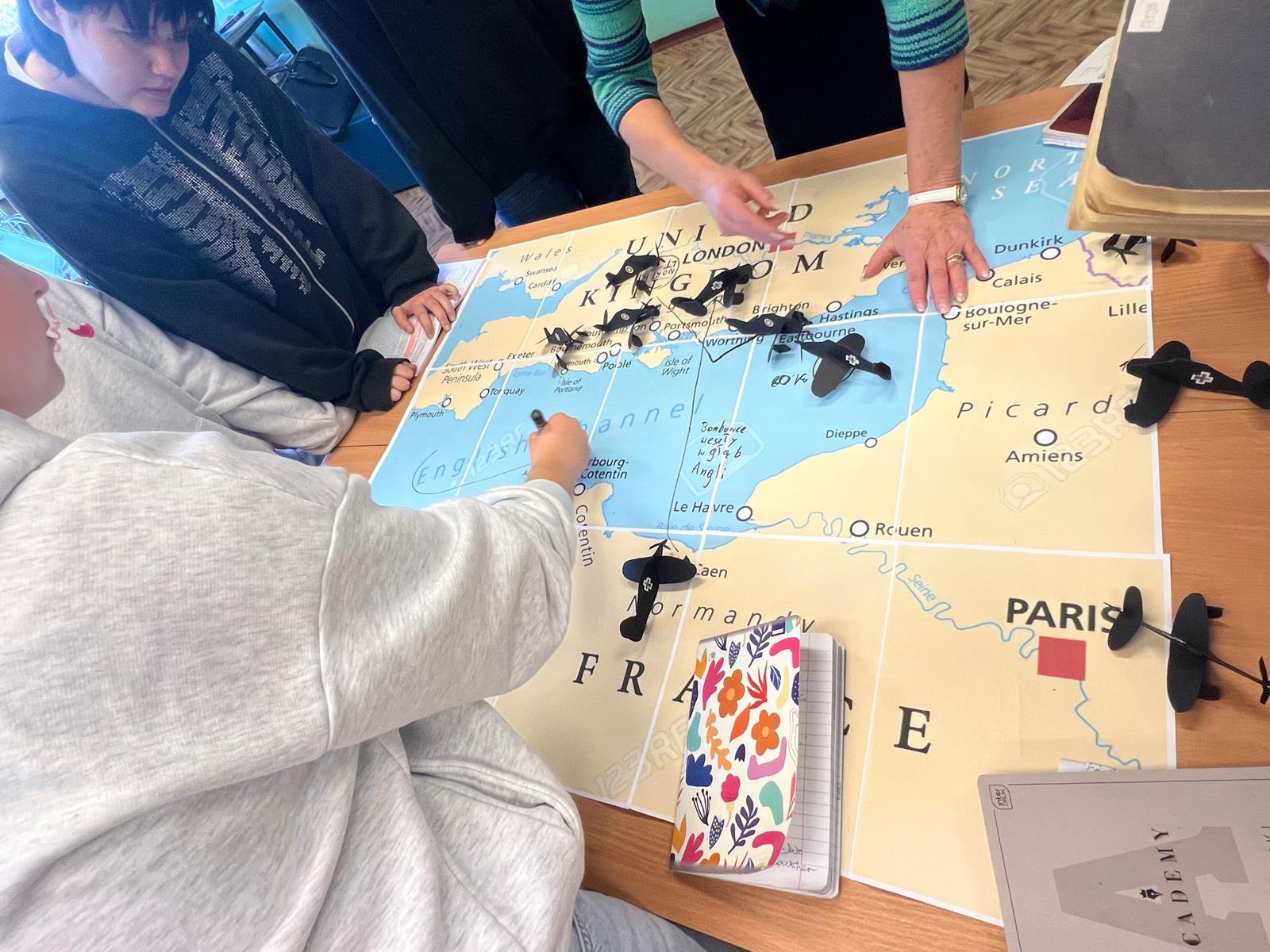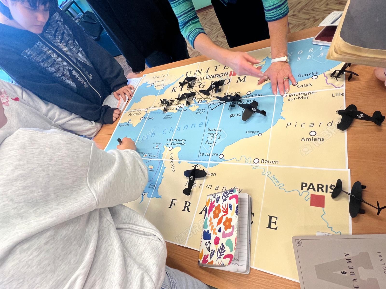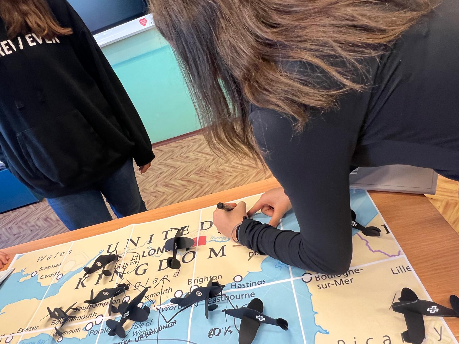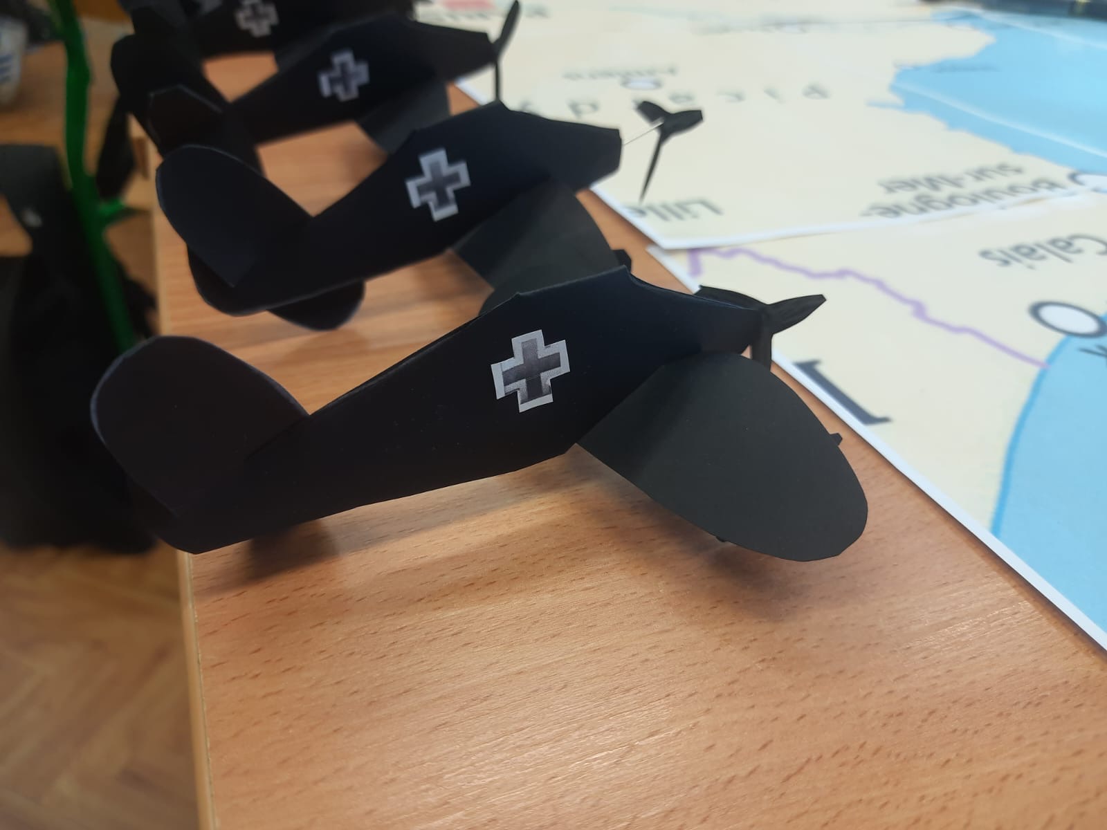 Najważniejszym elementem zajęć była interaktywna gra dydaktyczna. Uczniowie, pracując na dużej mapie przedstawiającej przestrzeń działań powietrznych, samodzielnie przesuwali modele samolotów: angielskie Supermarine Spitfire służące w RAF oraz niemieckie Messerschmitty Bf 109 z Luftwaffe. Na podstawie opisów i wydarzeń z lektury odtwarzali przebieg walk powietrznych, ucząc się taktyki, znaczenia decyzji pilotów oraz tego, jak wyglądały starcia w powietrzu.