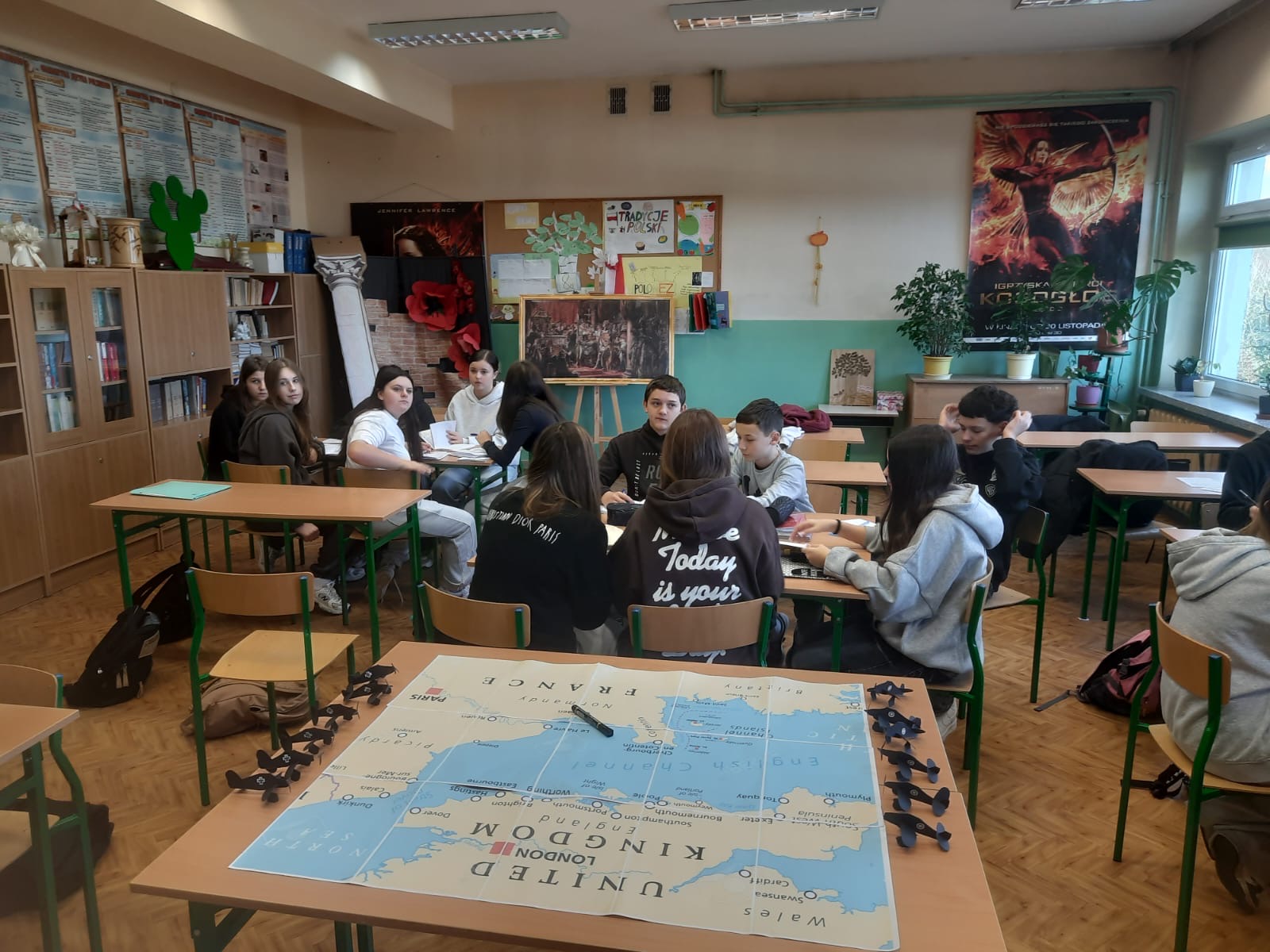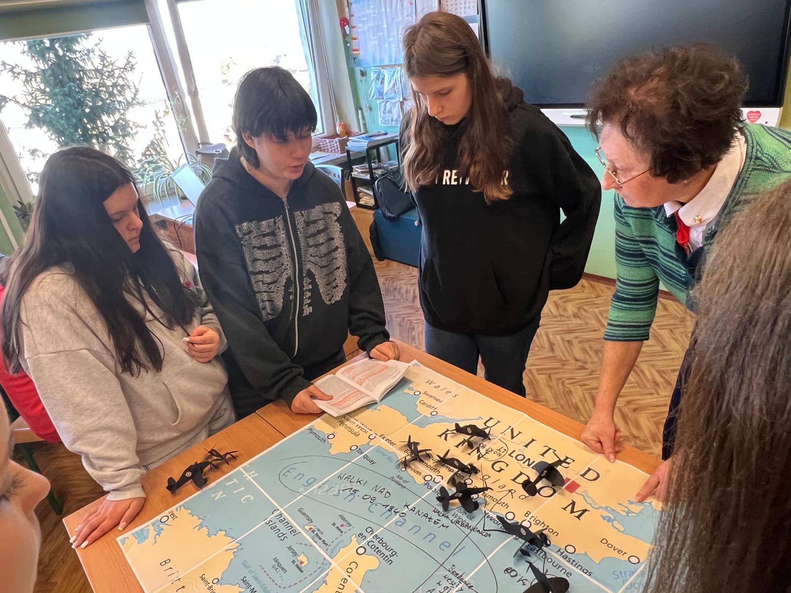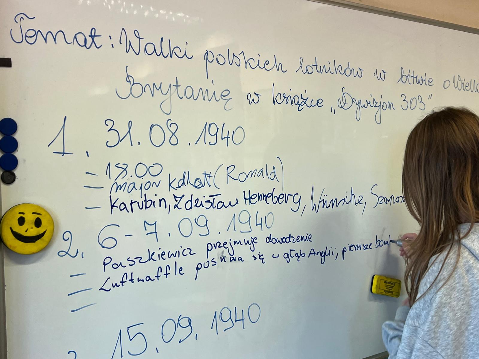 Lekcja, inspirowana treścią lektury „Dywizjon 303” Arkadego Fiedlera, wprowadziła uczniów w realia II wojny światowej poprzez aktywne działania na mapie. Młodzież zapoznała się szczegółowo z niemieckimi planami ataku na Anglię oraz z osiągnięciami polskich pilotów, którzy zasłynęli niezwykłą odwagą, umiejętnościami lotniczymi i skutecznością w walce.
