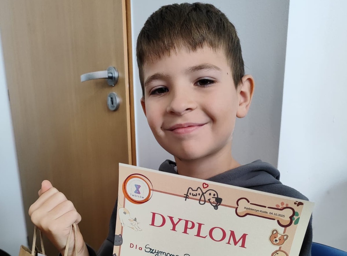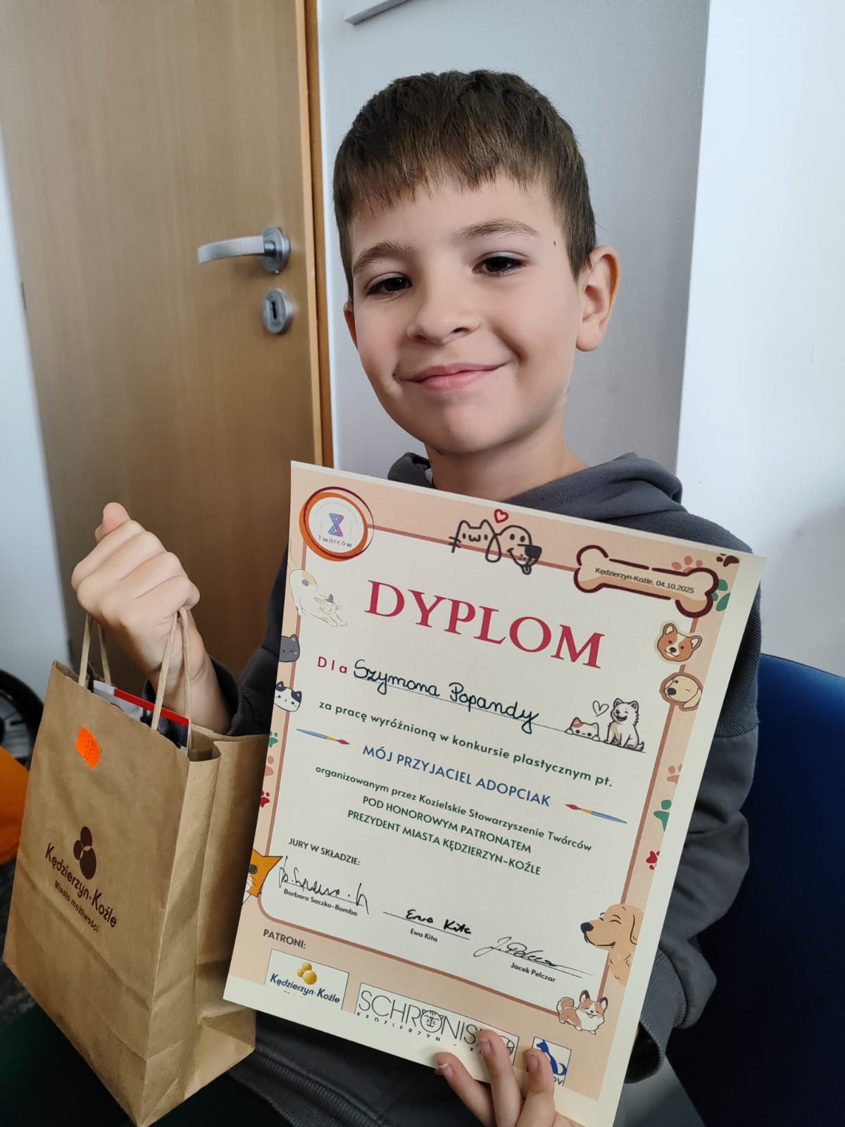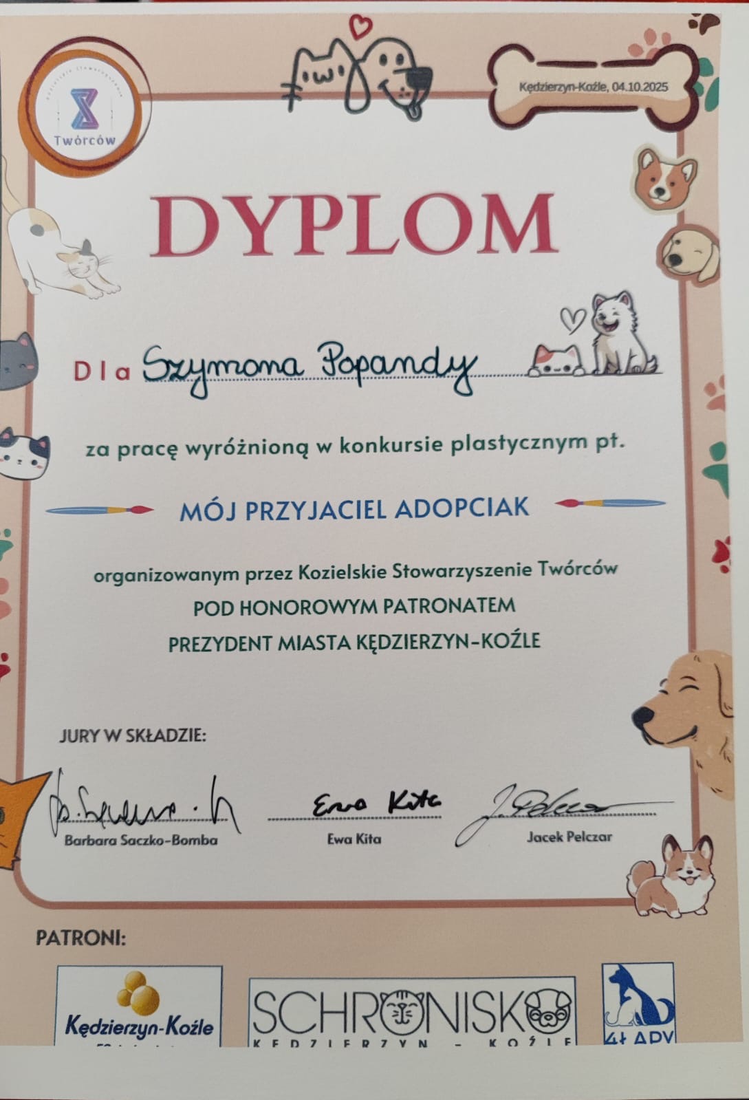 Z wielką radością informujemy, że rzeźba pieska autorstwa Szymona Popanda otrzymała wyróżnienie w miejskim konkursie plastycznym pt. „Mój przyjaciel adopciak” zorganizowanym przez Kozielskie Stowarzyszenie Twórców. Praca Szymona zachwyciła jury pomysłowością, starannością wykonania i wyjątkowym wyczuciem formy. Szymon w oryginalny sposób oddał smutek, rozpacz psa czekającego w schronisku na adopcję. Rzeźbę wykonał z masy solnej i pomalował farbami.